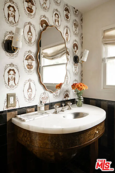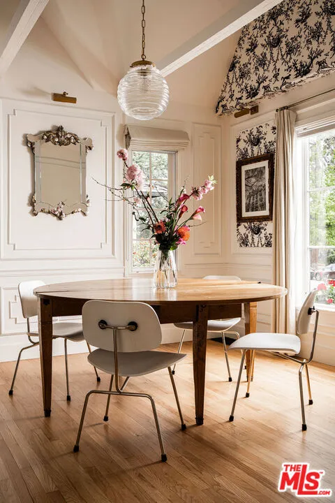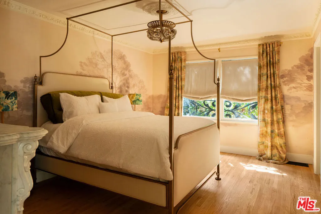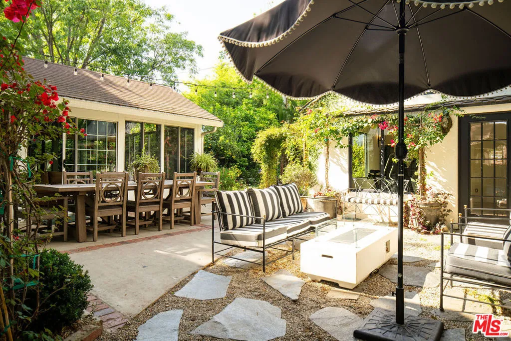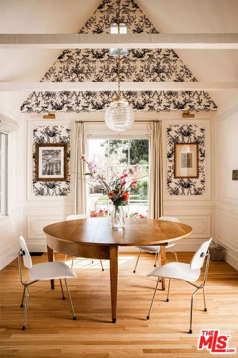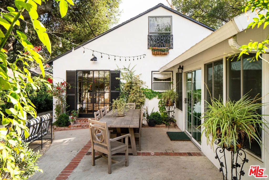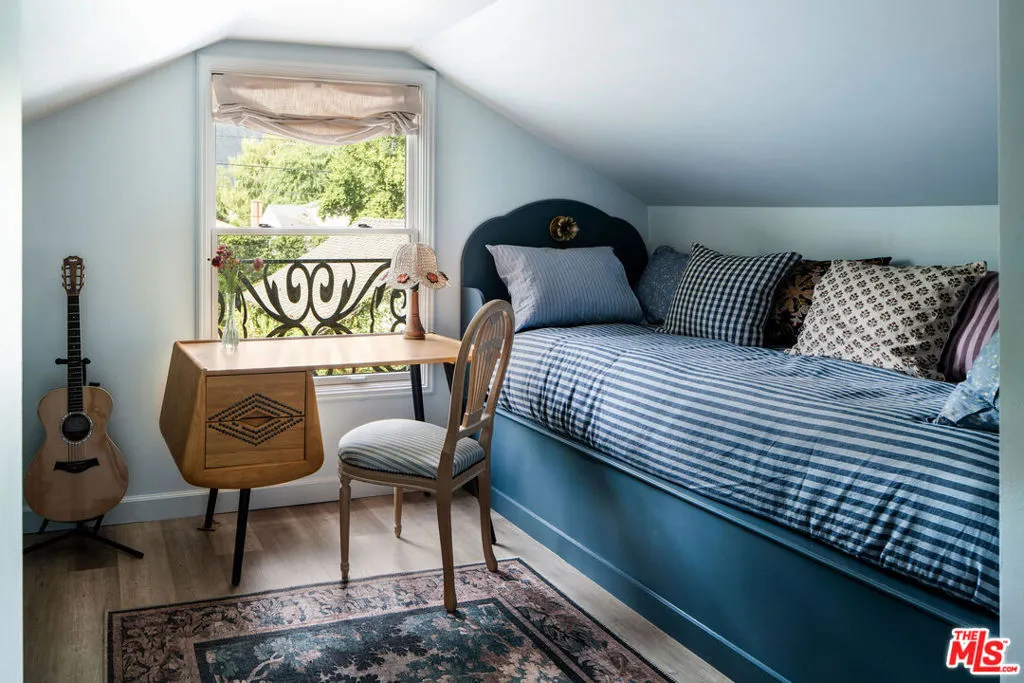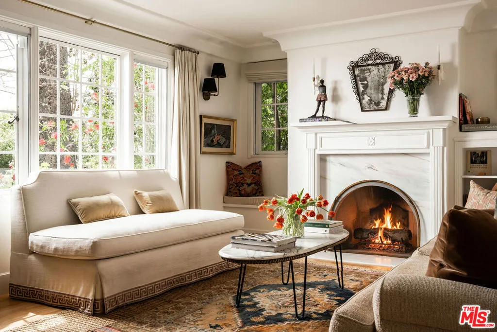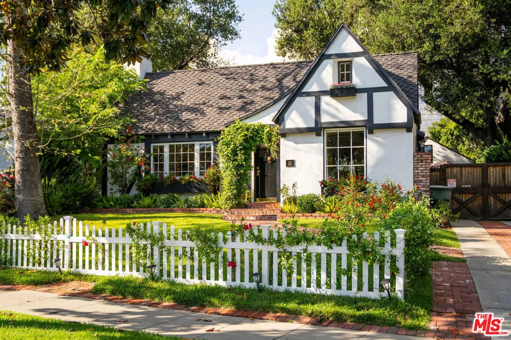 Tucked within one of Pasadena's most coveted enclaves, this reimagined 1929 Storybook cottage among the four original residences on its block unfolds as a richly layered narrative of heritage and design. Recently showcased on Homeworthy, the home was thoughtfully redesigned in 2023, where every intervention feels both reverent and revelatory. Upon entry, the living room reveals itself with understated drama: a vintage wood mantel crowned with leathered marble frames the fireplace, while built-in bookshelves and a window seat lend both intimacy and function. In the dining room, natural light pours through a charming dormer window, illuminating vaulted wood-beam ceilings and walls dressed in French molding and evocative English wallpaper. The kitchen, however, is the home's undeniable centerpiece. Here, skylights punctuate the continuation of vaulted beams above, while underfoot, repurposed vintage black-and-white marble flooring introduces a graphic elegance. A custom French blue Ilve range anchors the room, complemented by a hand-painted hood, leathered Carrara marble countertops, and custom oak cabinetry adorned with vintage hardware. Sub-Zero integrated refrigerator drawers and a deVOL unlacquered faucet complete the composition, each element chosen with a collector's eye. Beyond, the private quarters continue the home's narrative richness. The primary suite is a study in texture and romance, featuring muraled wallpaper and an antique French marble mantel repurposed as a decorative focal point. The adjoining bath layers pattern and polish with blue-and-white floral marble floors, a Carrara marble shower, a soaking tub by Kohler, and a bidet by TOTO, a thoughtful convergence of beauty and modern comfort. Secondary spaces are equally considered: a guest bedroom opens to the garden through iron casement doors, while upstairs, a third bedroom pairs a built-in twin bed with a generously scaled custom wardrobe. The guest bath, clad in brown-and-black checkered tile and finished with a stone-topped vanity and patterned Spoonflower wallpaper, offers a playful counterpoint to the home's softer palettes. A voluminous den easily envisioned as a fourth bedroom extends the living experience, framed by windows and vaulted ceilings, and opening through French doors to a lush, English-inspired garden. Outdoors, curated greenery and dining spaces evoke a sense of pastoral retreat within the city. Even the former garage has been reimagined, now serving as a finished gym with its own climate control, while offering future potential as an ADU. Recent updates including a new roof, upgraded systems, and refinished original hardwood floors bring modern comfort to the home, while vintage light fixtures add character throughout. Positioned near Victory Park and the beloved Pasadena Farmers Market, and just moments from the cultural expanse of The Huntington Library, Art Museum, and Botanical Gardens and the academic prestige of California Institute of Technology, the home offers both retreat and connectivity. Access to Washington Boulevard's boutiques and cafes, as well as the 210 freeway and Metro, places the best of Pasadena within effortless reach.