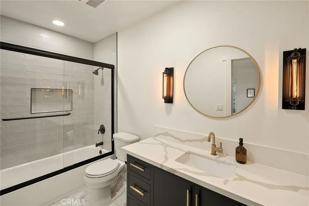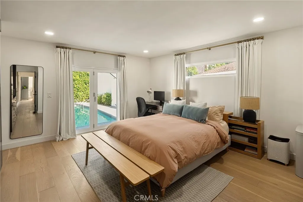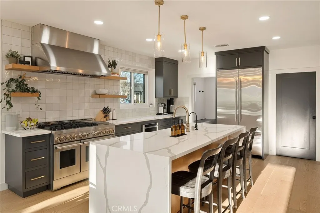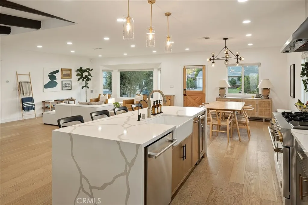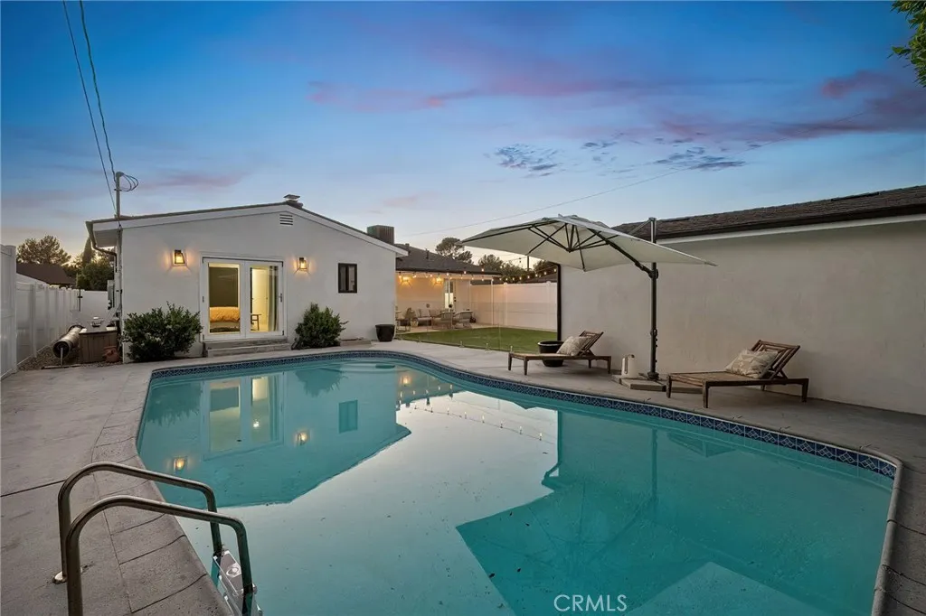 Experience modern single-story living in this impeccably remodeled Sherman Oaks corner-lot home. With 3 bedrooms and 3 baths, the open-concept floor plan is flooded with natural light, flowing effortlessly through expansive bi-fold doors to the serene backyard retreat. The chef’s kitchen is a study in both form and function, featuring custom cabinetry, stainless steel appliances, a generous island, wine fridge, and waterfall quartz countertops. Outdoors, a heated pool, lounge area, and lush grassy expanse create a private sanctuary designed for both relaxation and entertaining. The master suite offers a tranquil escape with an oversized glass shower, dual vanities, custom built-ins, and direct access to the backyard oasis. Thoughtful upgrades include all-new windows, tankless water heater, newly upgraded A/C system, and a private laundry room. Fully paid Tesla solar panels provide energy efficiency, complemented by a Tesla charging station in the two-car garage. Every detail of this home—from its sunlit interiors to its private outdoor haven—has been curated for effortless luxury and modern living.