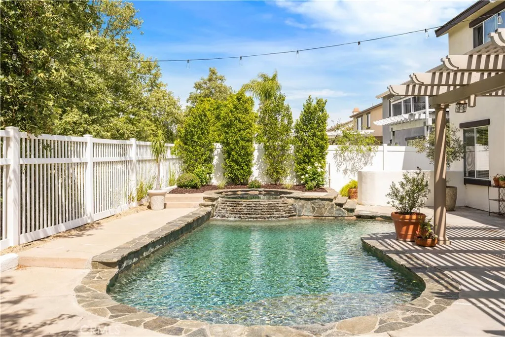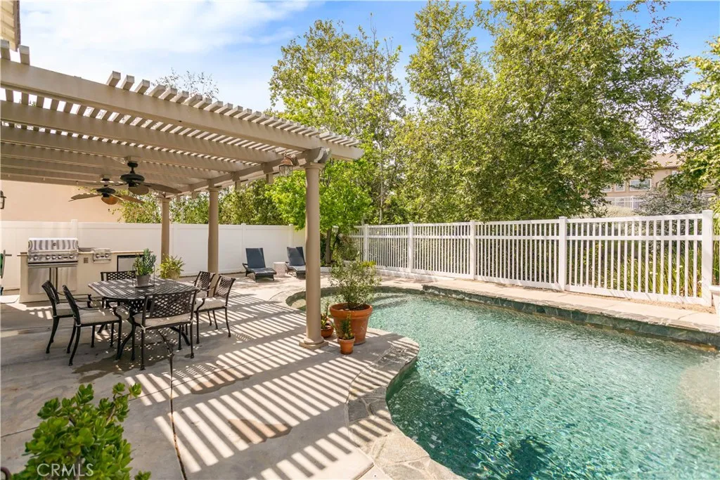 PASEO DEL SOL CHARMER! Pool/Spa home at the end of a Cul de Sac, plus this home backs to the Paseo Del Sol walking trails. 2451 sq. ft with 4 Bedrooms (all upstairs) 2.5 Baths, a Main level Office & a Main level Bonus Room. Well maintained mature landscaping all throughout the property. Covered front porch entry. Open floorplan and light & bright throughout. Formal Living and Dining rooms at the front of the house. Cozy, gas fireplace in the living rm. Family room/kitchen combo + office span the back of the home w/ views of the lush & peaceful surroundings in the backyard. The kitchen has a center island for added workspace, stainless steel appliances & granite tile countertops. The main level Bonus Rm was added, through the builder, and is currently used as a media room, but could easily be another home office or a play room. Upstairs are the 4 bedrooms, including the Primary Suite. The primary suite has high ceilings, dual closets + dual sinks & separate tub/shower in the bathroom. The backyard and pool have just been updated & improved. No direct neighbors behind, just lush green landscaping from the Paseo walking trail. Entertainers backyard with a sparkling Pool/Spa, built in BBQ island & shaded Dining Space. Paseo del Sol community offers many amenities: 3 pools, Tennis, Fitness, Parks, Community Activities and Miles of Walking Trails. Low Taxes due to no Mello Roos in this community. Walking distance to Elementary & Middle Schools. Overall Great Location in South Temecula, close to shopping, medical, restaurants & all the Temecula Wineries. Come see this home ASAP