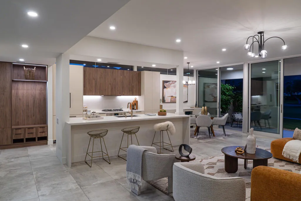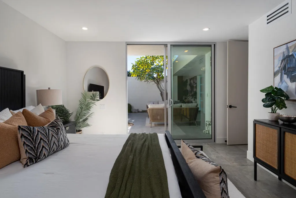 Step inside the shadow blocked walls of this perfectly remodeled, 2bed/2bath, at the coveted Seven Lakes Country Club. Originally designed by Richard A. Harrison, this spacious unit was freshly remodeled in 2025. Large format tiles with a sleek concrete look flow onto your West facing leisure deck, where you'll take in the majestic Mt San Jacinto vistas. Warm wood tones provide a respite from the desert sun, while walls of new dual paned sliders add extra efficiency throughout the home. The chef's kitchen serves California style with it's dual tone wood and cream cabinetry, a gas 5 burner stove and waterfall island. This opens into your airy living and dining space. Both spacious bedrooms, tucked privately to the rear of the home, have great storage in their ample custom closets. The sparkling bathrooms offer walk in rain showers and sleek brass fixtures. A relaxing dinner or quiet moment in your separate walled courtyard completes this perfect picture. The private 1 car garage and a tranquil pool are just steps away. Past the 24-hour guarded gate, 'The Gem of the Desert' offers a unique elevated lifestyle with its Ted Robinson-designed 18-hole executive golf course, 15 pools and spas with pool-houses, and the lively William Cody designed clubhouse waiting to welcome you to its formal dining room, casual cocktail lounge, and a terrace overlooking the waterfall-fountain. Welcome home!