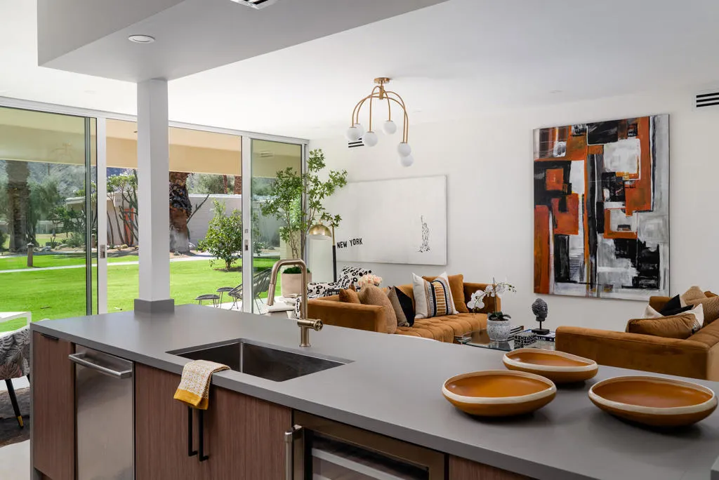 Your modernist dream home awaits in this gorgeously remodeled, 2bed/2bath, at the coveted Seven Lakes Country Club! Originally designed by Richard A. Harrison, inside its shadow-blocked walls, this spacious unit is freshly redesigned for today's living. Spread out over the 1,545 sq ft open floor plan, highlighted by large format tile floors, and get ready to entertain in style! The new kitchen is finished with custom Italian cabinetry, and high end appliances including a commercial grade, paneled Fisher & Paykel refrigerator, a wine fridge, plus a large breakfast bar. Walls of glass sliders open out onto a green leisure terrace with views of the mountains and the iconic Southridge estates. Enclosed for maximum privacy, the northern window wall opens onto a large private courtyard, sited to include wraparound mountain views and lined with a desertscaped perimeter garden. Both spacious bedrooms offer sleek custom closets, as well as walk in rain showers in both beautiful baths. The tranquil pool is just steps away. Past the 24-hour guarded gate, 'The Gem of the Desert' offers a unique elevated lifestyle with its Ted Robinson-designed 18-hole executive golf course, 15 pools and spas with poolhouses, and the lively William Cody designed clubhouse waiting to welcome you to its formal dining room, casual cocktail lounge, and a terrace overlooking the waterfall-fountain. Welcome home!