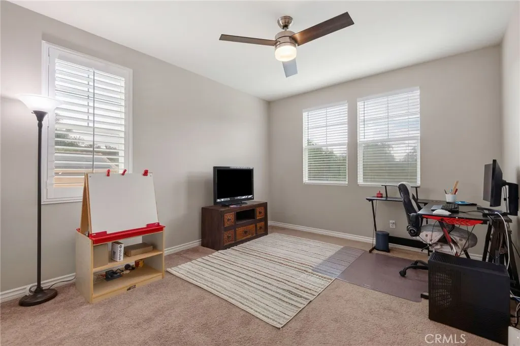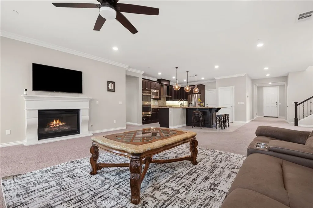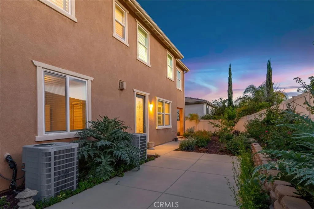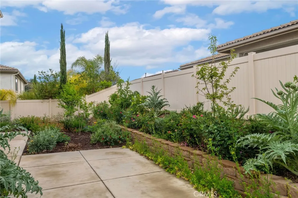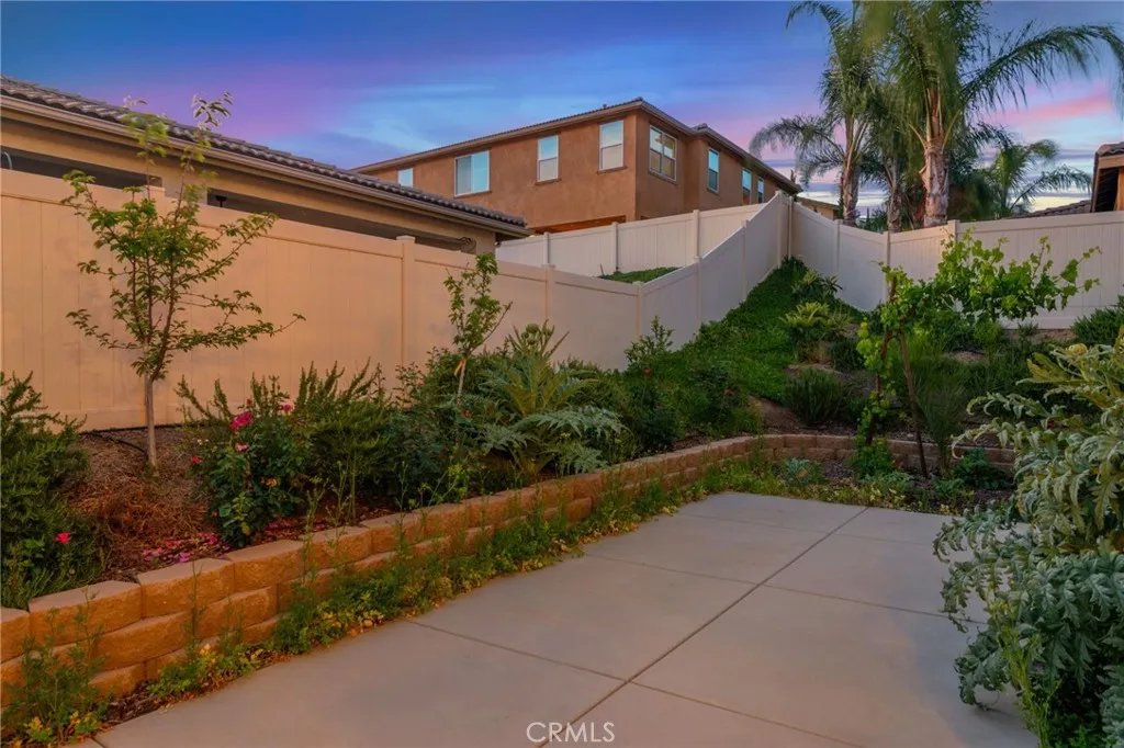 Located in the desirable Terracina community, this home is tucked away on a quiet street that gently dead-ends into a more rural setting, offering a rare blend of neighborhood living with a peaceful, country-inspired feel. Unlike typical tract surroundings, the property enjoys a unique sense of space and charm that’s hard to find. A welcoming front porch sets the tone, while the backyard is designed for true California living with a covered outdoor California room complete with a fireplace, seamlessly accessed through a sliding glass door—perfect for year-round entertaining or relaxing evenings under the stars. Inside, you’re greeted by wrought iron staircase rails, crown molding, and select plantation shutters, adding timeless character throughout. Thoughtfully designed for both everyday living and entertaining, the home features an extra-large kitchen island, tile flooring, and a walk-in pantry, all flowing seamlessly into the expansive family room and dining area—perfect for gatherings of any size. An optional formal living room offers flexibility and can easily serve as a home office or additional lounge space, while under-stair storage and ample linen cabinetry provide practical organization. The versatile floor plan includes a first-floor bedroom with an adjacent 3/4 bathroom, ideal for guests or multi-generational living, along with an inviting loft for added living space. The spacious primary suite features a private retreat, perfect for a sitting area, workspace, or personal escape. Additional highlights include a whole house fan, tankless water heater, and gutters, enhancing comfort and efficiency. Inside and out, pride of ownership shines with paid-off solar, offering long-term energy savings. The backyard is a true highlight with a thriving vegetable garden and mature fruit trees, bringing a touch of farm-to-table living right to your doorstep. Car enthusiasts and organizers alike will appreciate the epoxy-coated tandem garage, offering both functionality and a clean, polished finish. With its distinctive setting, thoughtful upgrades, and flexible layout, this home delivers comfort, charm, and a lifestyle that feels both relaxed and refined.