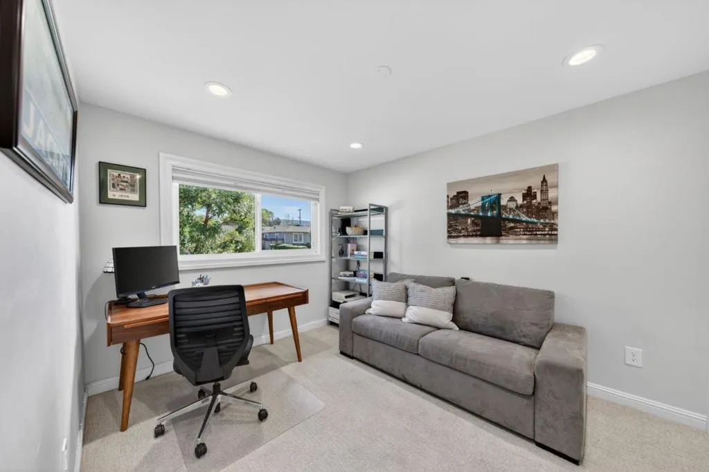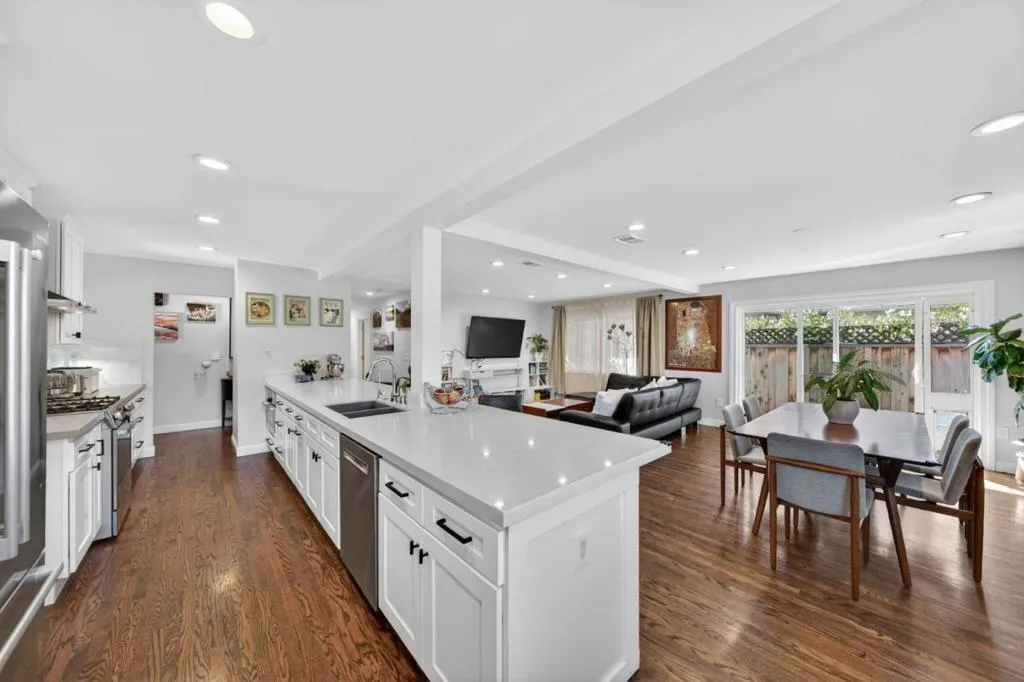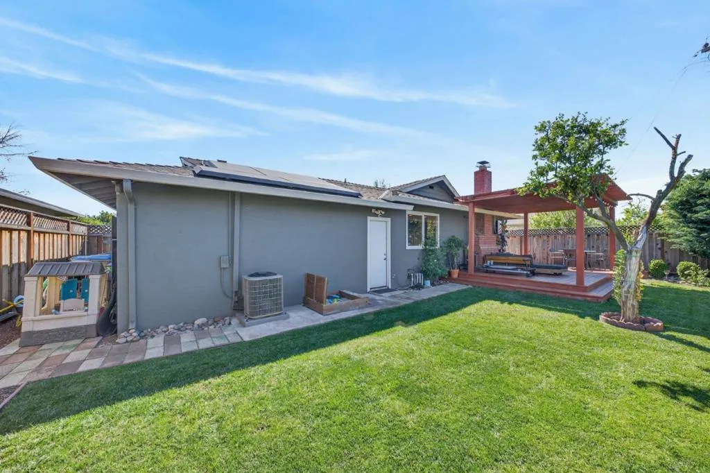 Welcome to 1841 Rochelle Drive, a beautifully updated home in the heart of Cambrian, San Jose. This 3 bedroom, 2 bathroom home offers 1,300 square feet of comfortable living space on a 5,702 square foot lot. The bright remodeled open floor plan features recessed lighting, oak hardwood flooring, and abundant natural light throughout. The living and dining areas flow seamlessly into the kitchen, ideal for everyday living and entertaining. The updated kitchen showcases white shaker cabinetry, quartz countertops with a 17-foot island, subway tile backsplash, built-in desk area, dual basin stainless steel sink with water filtration, and Bosch stainless steel appliances including a 5-burner gas cooktop, oven, microwave, dishwasher, and refrigerator. The dining area seats 8 and features a cozy gas fireplace and sliding glass doors that open to the backyard. The private backyard includes a pergola-covered deck, lush lawn, and fenced perimeter. Both bathrooms are tastefully updated with modern finishes. The primary suite offers great natural light and a mirrored closet. Additional highlights include owned Tesla solar with two battery backups, dual EV chargers, an epoxy-finished two-car garage with workbench. Just steps away from Doerr Park, Bagby Elementary, Ida Price Middle, and Branham.