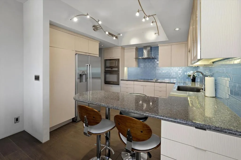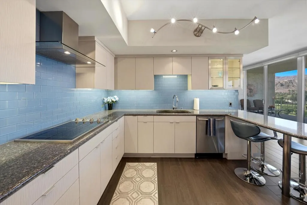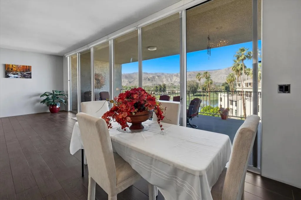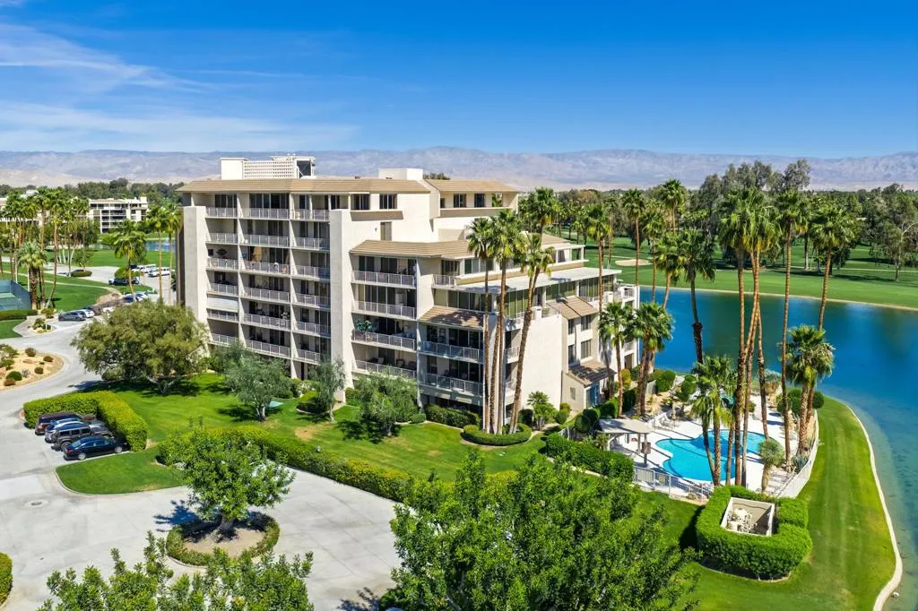 Refined desert living awaits in this beautifully updated 1-bedroom,1.5-bath residence at the iconic Desert Island Country Club. Perched on the 5th floor, the home enjoys sweeping 180 panoramic views of mountains, lake, and championship golf course--an ever-changing backdrop from sunrise to sunset. Contemporary interiors feature ceramic plank tile flooring, custom lighting, and a sleek chef's kitchen with Euro-style cabinetry and stainless-steel appliances. Floor-to-ceiling windows fill the home with natural light and open to a spacious covered terrace, perfect for morning coffee or sunset entertaining. The serene primary suite is a private retreat with custom built-ins and a spa-inspired bath showcasing quartz countertops and an oversized walk-in shower. Move-in ready with the opportunity to further personalize-- ideal as a personal desert escape or smart investment opportunity.Desert Island offers true resort-style living within a rare guard-gated high-rise community surrounded by a tranquil lake and adjacent to an 18-hole championship golf course. Amenities include 24-hour security, fitness center, pool and spa, tennis and pickleball courts, paddle boats, and impeccably maintained grounds. HOA includes cable TV, Wi Fi, water, gas, building insurance, roof, trash, common areas, and discounted electricity--including A/C. Ideally located near world-class shopping, dining, entertainment, and Eisenhower Medical Center--this is a sophisticated desert retreat blending luxury, convenience, and serenity.
