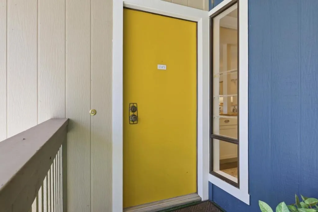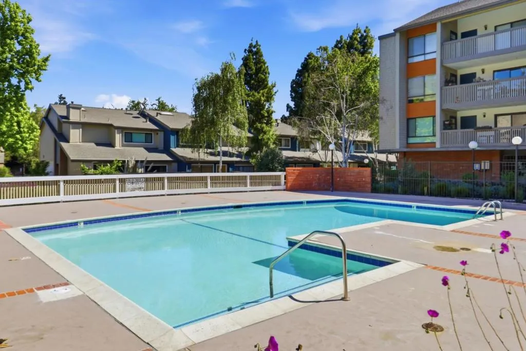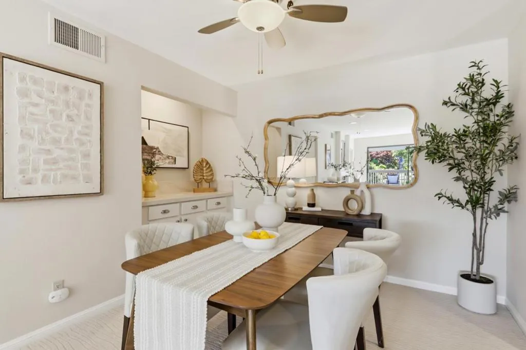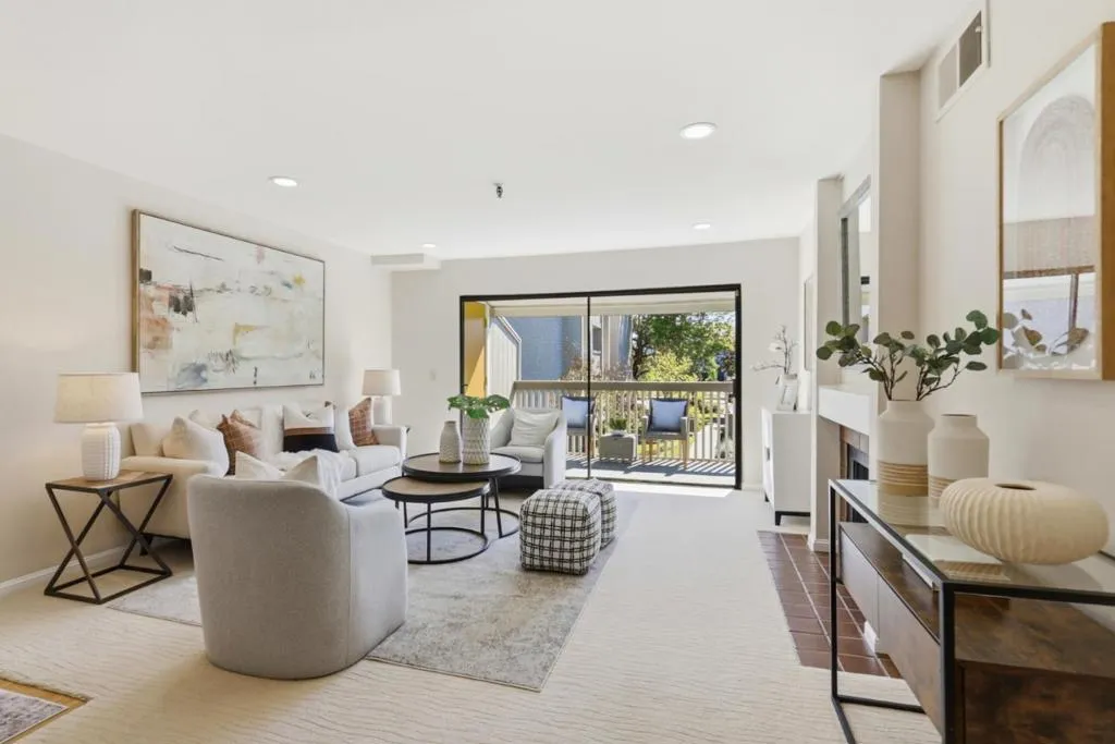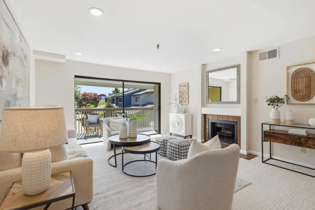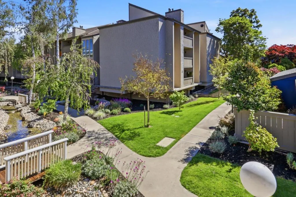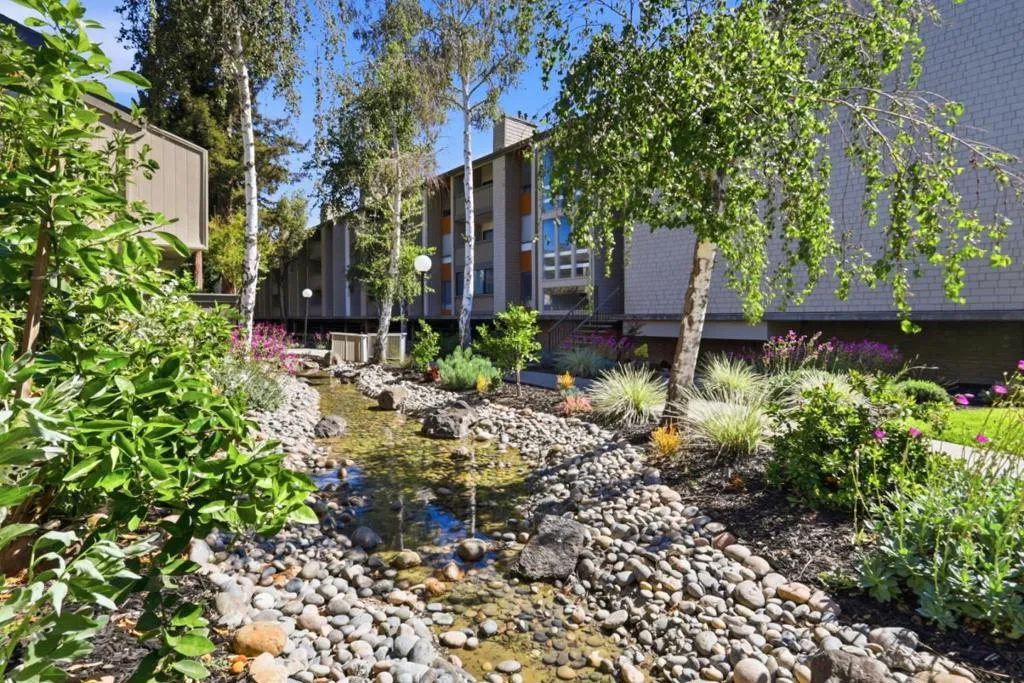 Spacious and elegant 1-bedroom, 1-bath condominium in the highly desirable Old Mill community. Ideally located on the upper level of the two-story E Building, this home features a bright deck with tranquil treetop views of the greenbelt and flowing stream. The serene living room offers beautiful views, a cozy gas fireplace, and direct access to the private deck, perfect for relaxing or entertaining. A separate dining area provides additional storage and space for gatherings. The oversized bedroom features three closet areas and a sliding glass door opening to the deck. The remodeled kitchen showcases contemporary cabinetry, granite counters, stainless steel appliances, and tile flooring. The updated bath includes a stylish vanity, tile floor, and tub/shower with tile surround. Additional features include recessed lighting, ceiling fans, new plush carpeting, fresh interior paint, inside laundry with stackable washer/dryer, and central heat and A/C. The lush Old Mill complex offers babbling brooks, lake with fountains, mature landscaping, two pools, two spas, and a clubhouse. Extra storage off the deck. Gated parking nearby with guest parking. Close to Mora Park, San Antonio Caltrain, shopping, dining, theaters, and major Silicon Valley employers.