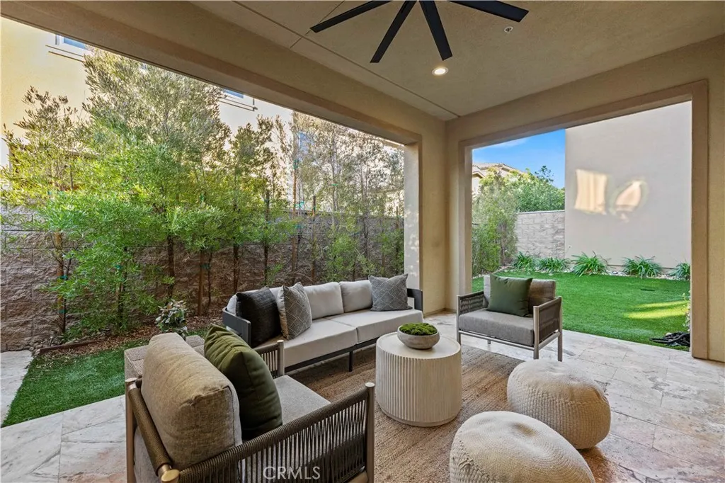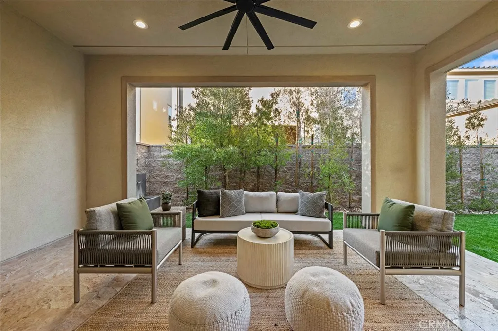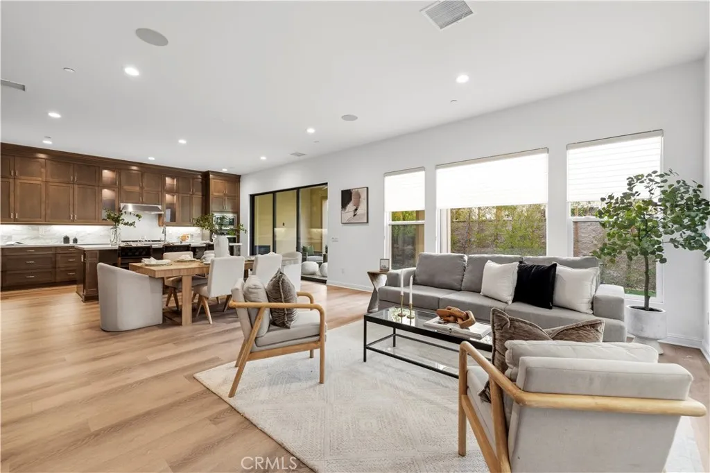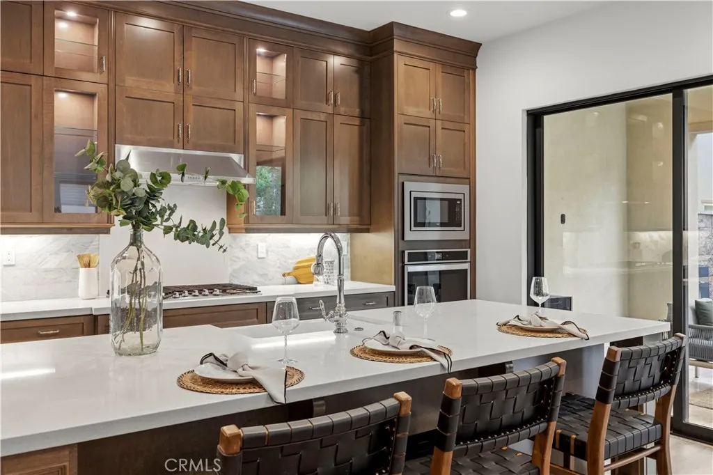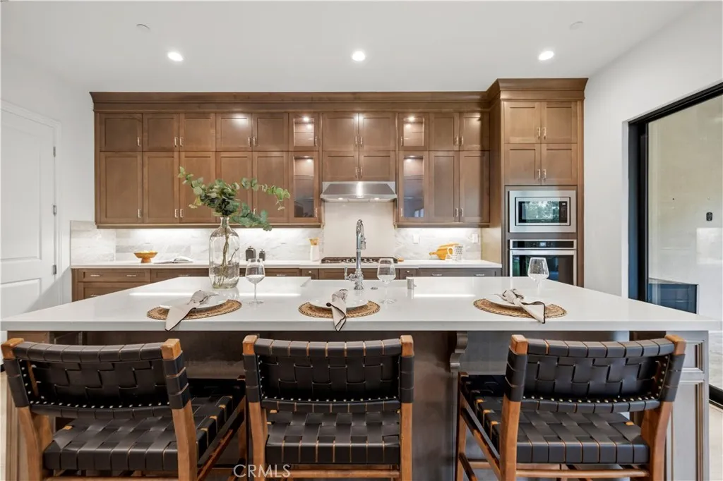 Nestled within the prestigious, guard-gated Canyons community in the highly sought-after Porter Ranch area, this stunning residence offers 5 bedrooms, 4 bathrooms, and a spacious loft designed for modern living. Upon entry, you’re welcomed by an elegant foyer highlighted by luxurious laminate flooring and an abundance of natural light that enhances the home’s open, airy layout. The main level features an expansive great room with built-in speakers—perfect for entertaining and large family gatherings—alongside a dining area and a convenient downstairs bedroom ideal for guests or a home office. The chef’s gourmet kitchen is a true showstopper, showcasing premium finishes throughout. Enjoy quartz countertops, ceiling-height custom cabinetry, stainless steel appliances with a built-in refrigerator, a dedicated coffee bar station, and an oversized center island perfect for casual dining and entertaining. Upstairs includes four bedrooms, highlighted by a stunning primary suite with coffered ceilings, walk-in closet, and spa-like bath with dual sinks, soaking tub, and separate shower. Additional features include leased solar, upstairs laundry, and a 2-car garage. The low-maintenance backyard offers artificial turf and a covered California patio—perfect for entertaining. Canyon Oaks amenities include guard-gated entry, pool, spa, cabanas, BBQ areas, and clubhouse. Close to Porter Ranch Community School and The Vineyards with shopping, dining, and entertainment.