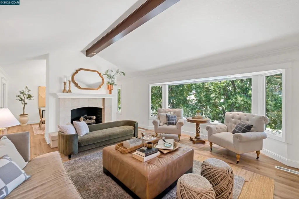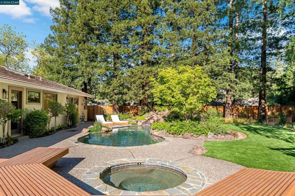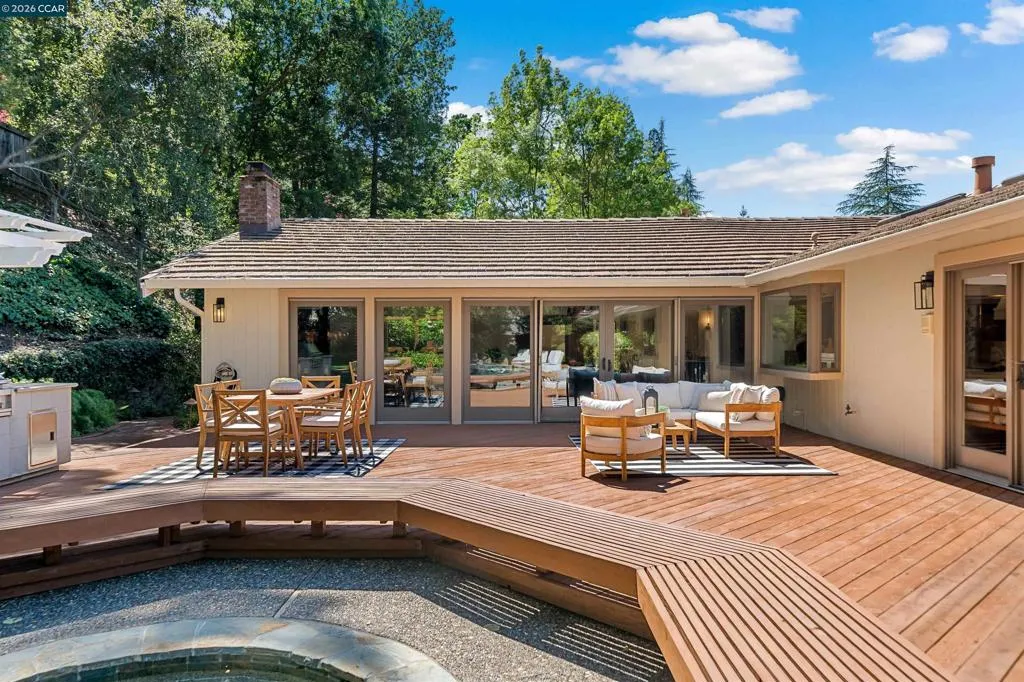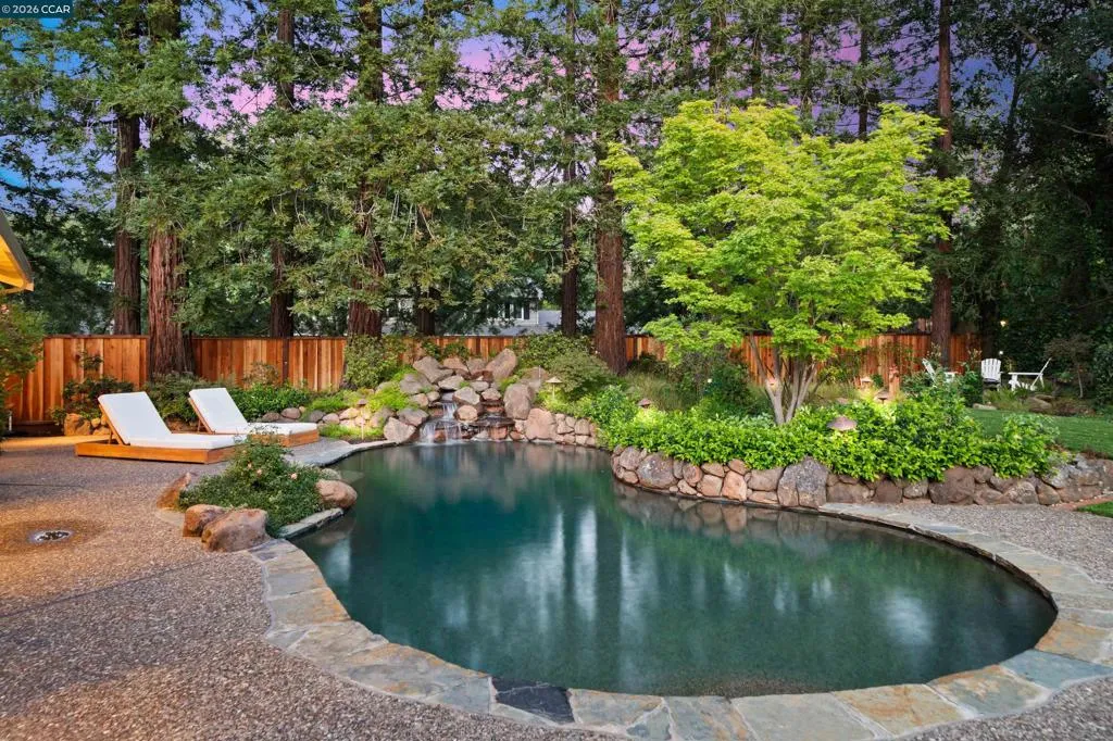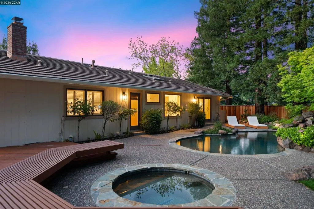 Nestled near the prestigious Round Hill Country Club, this stunning Traditional 4 bedroom plus office, 4 bathroom, 3,734 square foot home blends timeless elegance with everyday comfort. Thoughtfully designed with an expansive, functional floor plan, it offers beautiful yard views from nearly every room—ideal for entertaining and daily living. A charming garden entry welcomes you into light-filled interiors with soaring ceilings, custom lighting, and expansive windows. The dramatic living room features a striking fireplace, while the adjacent dining room offers vaulted ceilings and seamless access to the kitchen. The remodeled kitchen impresses with a large island, bar peninsula, office nook, and ample cabinetry. A sunny breakfast nook with brick fireplace, built-in bar, and French doors opens to the backyard and adjoining family room. The spacious primary suite is a private retreat with yard access, vaulted ceilings, and a walk-in closet. The luxurious bath includes dual vanities, an oversized shower, soaking tub, and skylight. The beautifully landscaped yard offers a deck with BBQ island, pool, spa, fire pit, and serene privacy. Ideally located near Roundhill Country Club, Downtown Alamo, Top Alamo schools, hiking/biking trails, parks and easy commuter access.