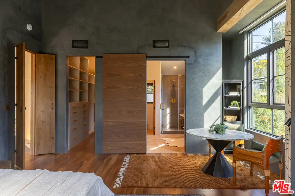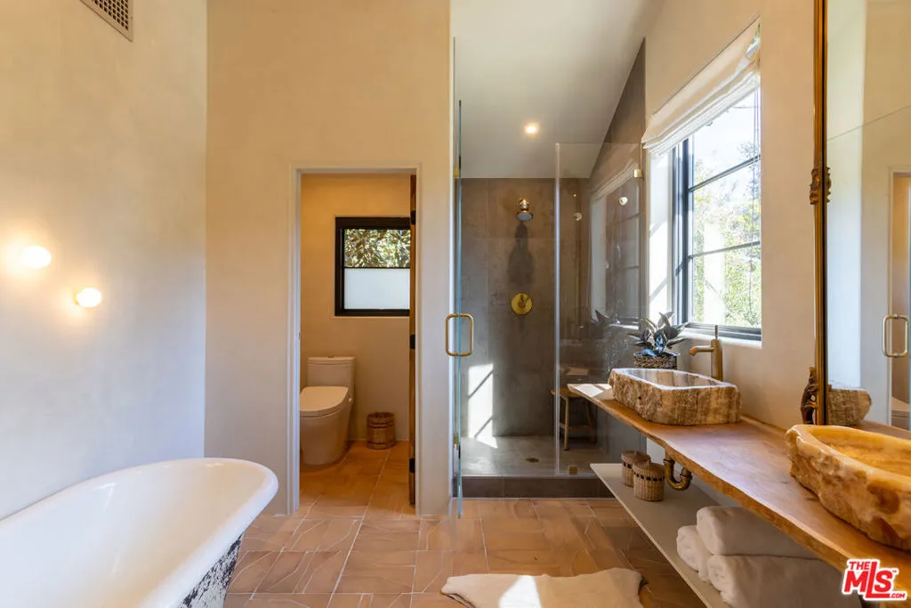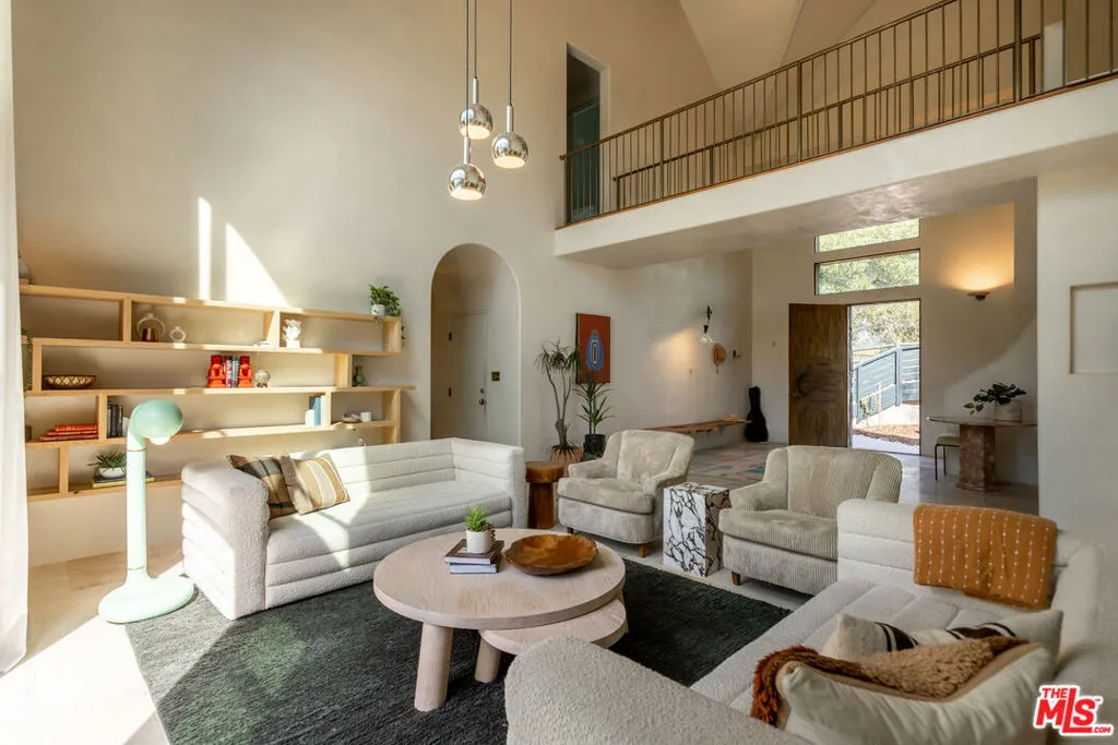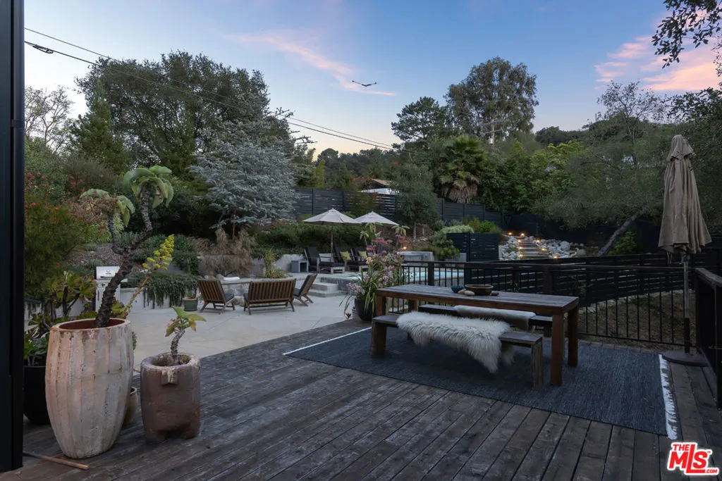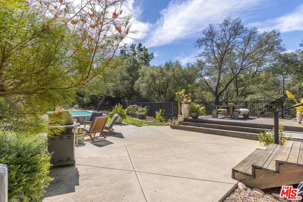 Set along a quiet, private drive in Topanga's coveted PO Tract, this exceptional architectural home captures the essence of elevated canyon living- where design, nature, and creativity seamlessly blend together. Originally part of a historic ranch and surrounded by protected State Park land, the setting offers rare privacy, natural beauty, and accessibility to miles of scenic trails, all just minutes from town and a short drive to the coast. Completely reimagined in 2022 by a renowned Los Angeles designer, the home is a study in thoughtful craftsmanship and refined artistry. Every detail has been carefully considered, from sustainably sourced wood elements to bespoke finishes that lend warmth, soul and authenticity throughout. Bathed in natural light, the interiors are defined by soaring cathedral ceilings, dramatic double-height living spaces, and expansive picture windows that frame mountain and treetop views. Stepping inside, you'll immediately be captivated by the main living area, an inviting space that feels both grand and intimate. The open-concept layout flows effortlessly from the living room into a beautifully appointed kitchen featuring premium appliances, designed for both everyday casual living and inspired entertaining. Custom cabinetry offers plenty of room for all your cooking essentials and storage galore. Dining and gathering spaces extend naturally outdoors, with all doors opening to expansive decks and lounge areas ideal for al fresco meals, sunset moments, or quiet mornings immersed in nature. Upstairs, the primary suite is dreamy and calming, feeling like your own private refuge with a breathtaking ensuite bath and windows overlooking the greenery and pool below. The second en-suite bedroom features a custom loft space (and a climbing wall!). A third spacious bedroom is a perfect place to imagine- it could stay a bedroom, perhaps be used as an exceptional home office or fulfill any other creative need. A unique architectural bridge connection and vaulted ceilings enhance the sense of openness and design continuity throughout the upper level. Set on approximately half an acre, the grounds are both lush and purposeful. Mature oak trees, native landscaping, and terraced gardens create a serene outdoor environment, while an array of fruit trees and raised garden beds invite a farm-to-table lifestyle. The property also features a refreshing pool/spa, outdoor lounge space, and multiple gathering spaces designed for both large-scale entertaining and quiet reflection. Additional amenities include a two-car garage with direct access, a spacious basement ideal for creative projects or storage, ample guest parking and a separate garden shed. The lower portion of the lot offers potential for an ADU, providing flexibility for future expansion or income opportunities. The home has also served as a sought-after location for lifestyle and design photography with past owners, offering additional revenue potential. This special home embodies the spirit of Topanga. Welcome home!