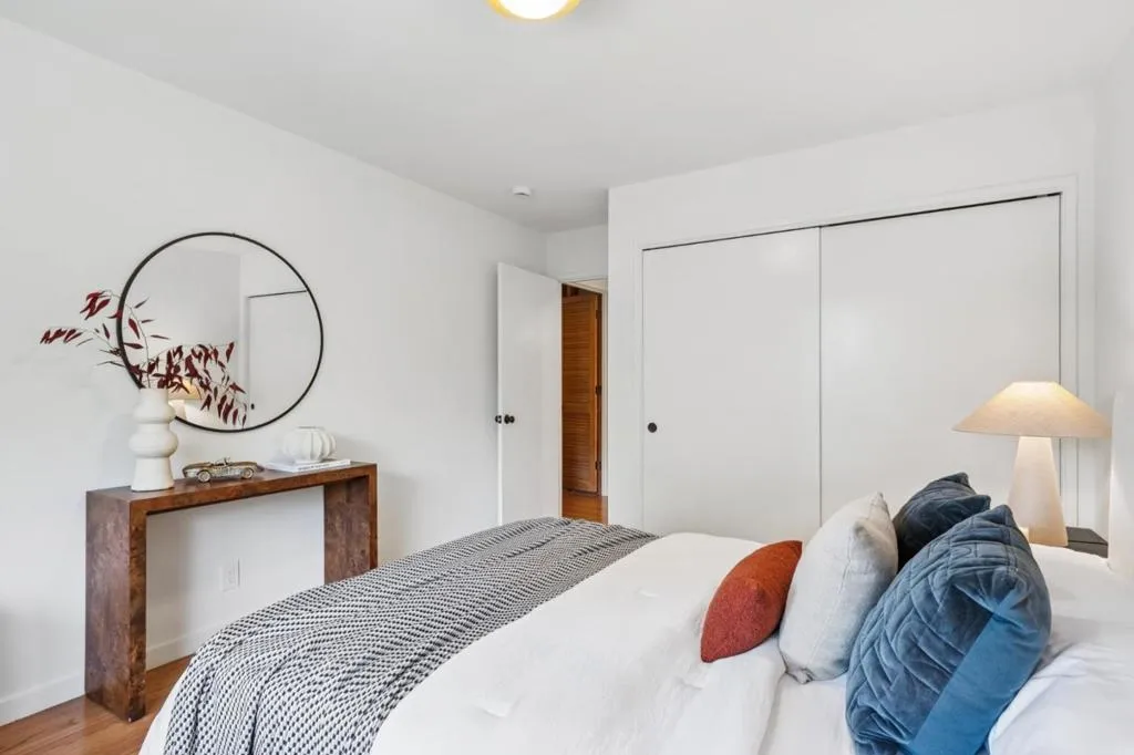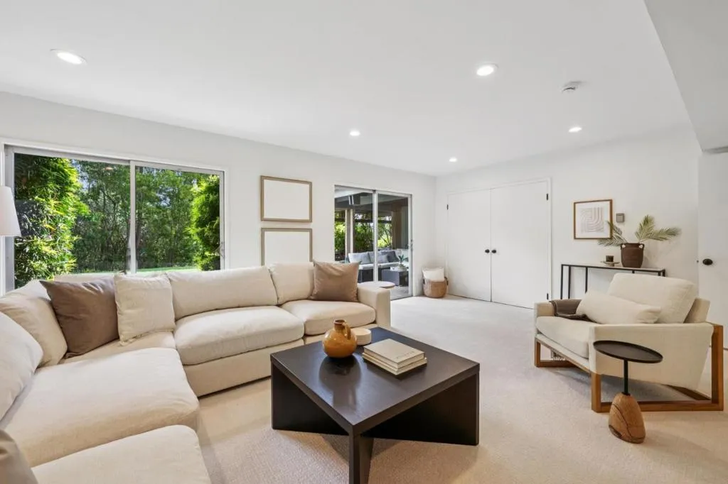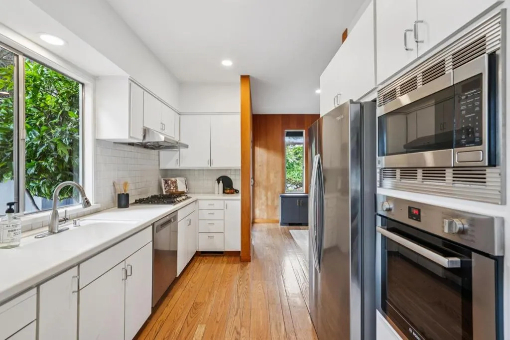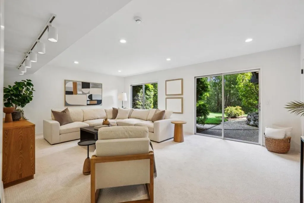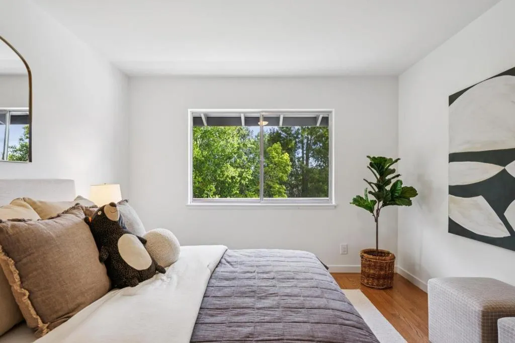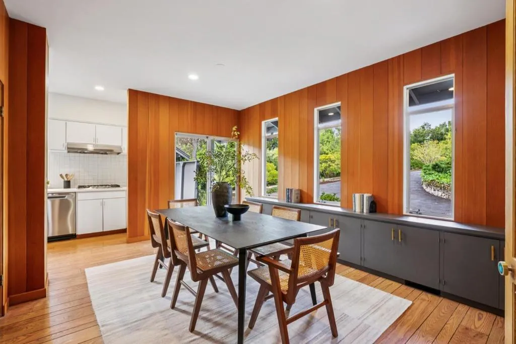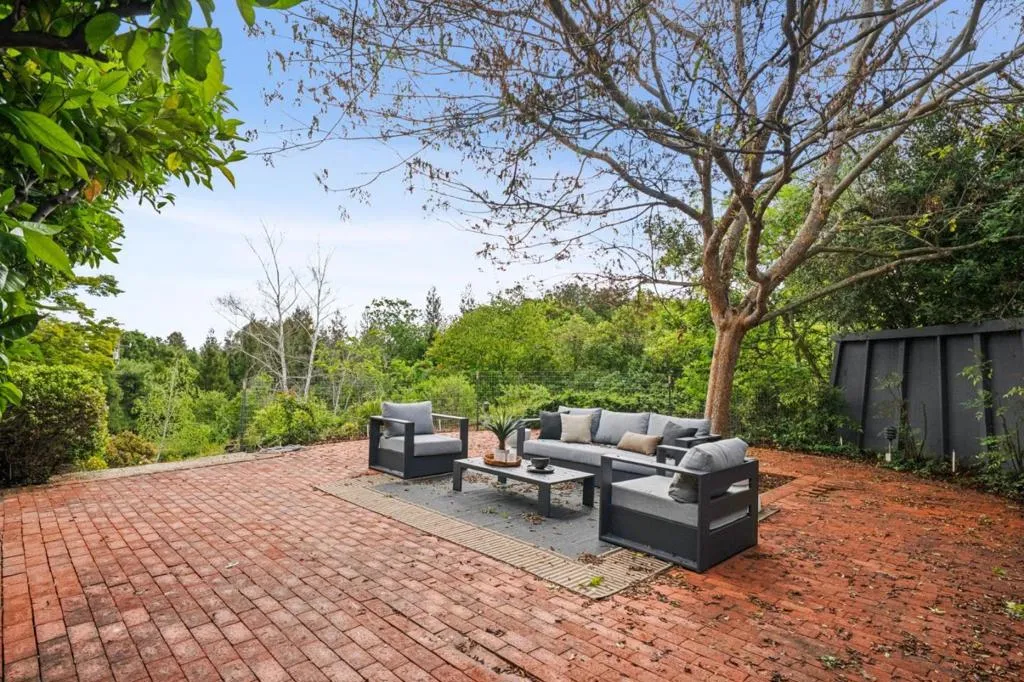 Defined by its connection to the landscape, this Los Altos Hills residence blends mid-century influence with expansive glass, warm wood detailing, and a floor plan that separates living and private spaces with purpose. Spanning 3,186 square feet on nearly an acre, the home is arranged with public gathering areas on one side and bedrooms on the other, creating a natural balance between openness and retreat. Inside, vaulted ceilings, rich wood paneling, and large windows frame tranquil tree views and bring in soft, natural light throughout the day. The kitchen, dining, and living spaces extend outward to a substantial deck with built-in seating, accompanied by a generously sized shaded patio just alongside, both ideal for entertaining. From here, steps lead down to a broad stretch of level lawn surrounded by mature landscaping, offering rare usable outdoor space with a true sense of privacy. The lower level adds flexibility with a spacious recreation room, guest suite, and additional storage. Well-placed at the end of a quiet cul-de-sac just minutes from town, the setting offers easy access to scenic walking routes through the hills, commute routes, and highly regarded Palo Alto schools.