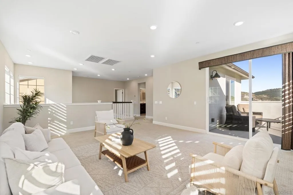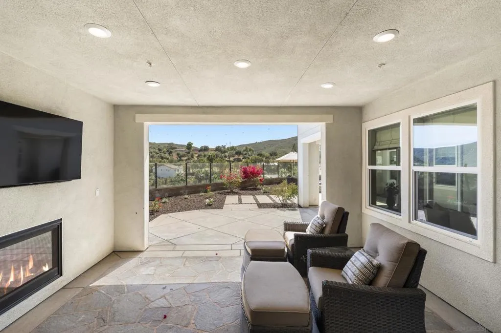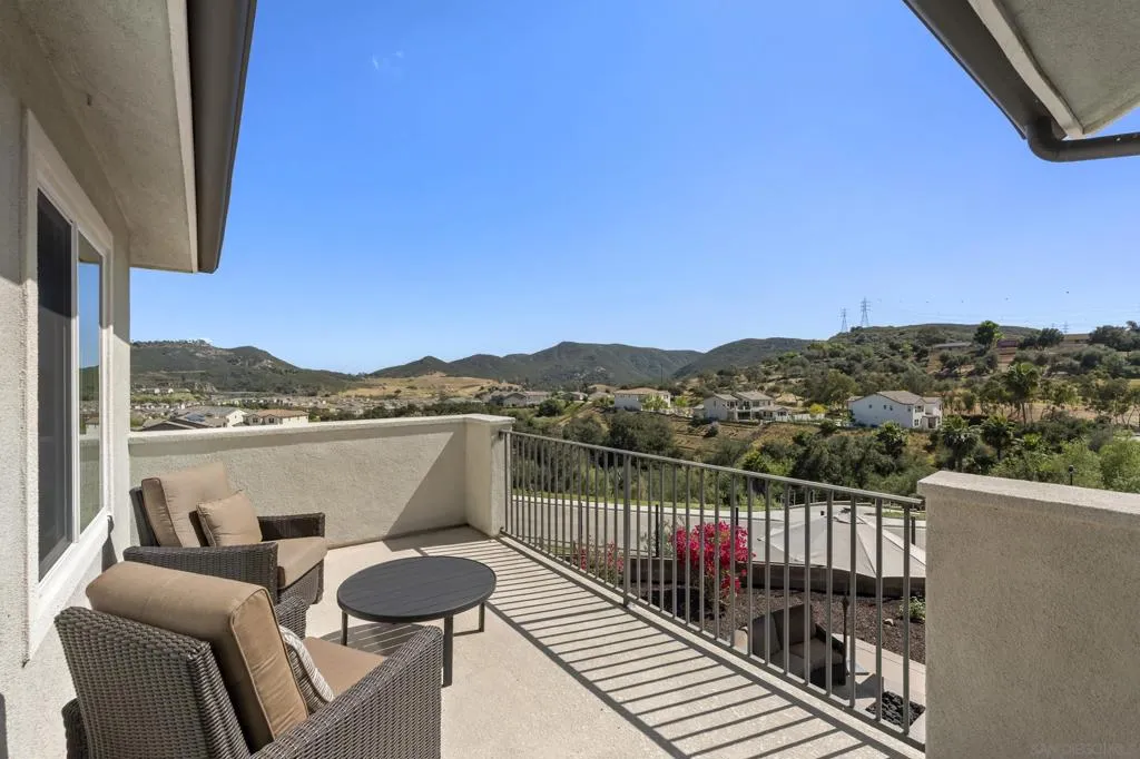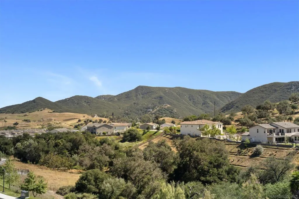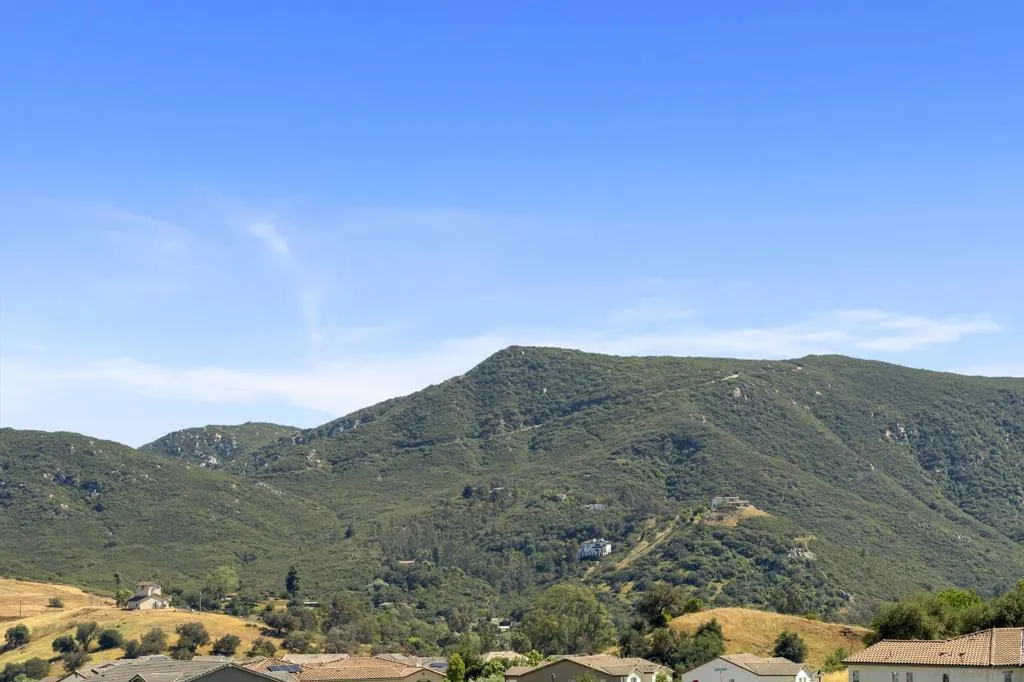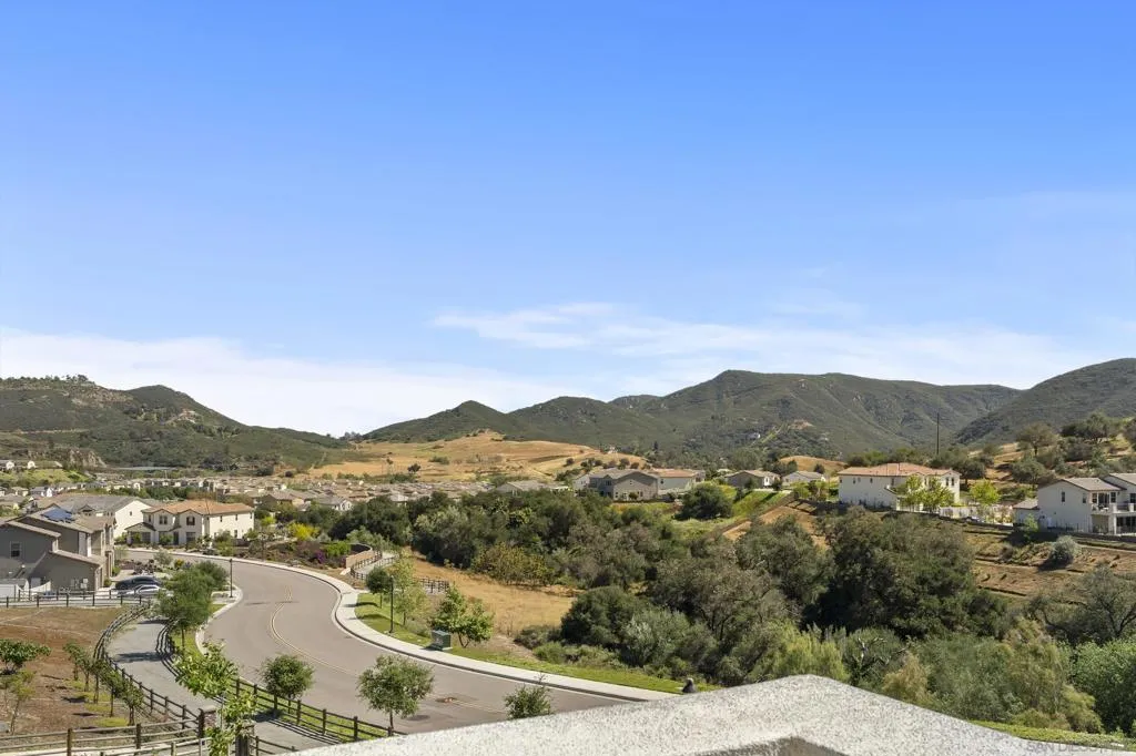 Welcome to refined Southern California living in Harmony Grove Village, where this exceptional residence features OWNED solar, sweeping 180° panoramic mountain views, and true indoor-outdoor resort-style living. Situated on a 0.18-acre lot, this beautifully upgraded home offers 4 bedrooms, 3.5 bathrooms, a dedicated office, and an upstairs loft with a private view balcony. The main-level primary suite is a private retreat with a spa-inspired bath and dual walk-in closets, complemented by a first-floor guest bedroom with full bath—ideal for multigenerational living or guests. The open-concept great room flows into a chef’s kitchen with a large center island, quartz countertops, stainless steel appliances, walk-in pantry, soft-close cabinetry, and designer lighting. Upstairs, secondary bedrooms surround a versatile loft opening to sweeping mountain views. Designed for California living, the wraparound California Room includes a built-in gas fireplace, recessed lighting, and TV wiring for year-round entertaining. The landscaped backyard features low-maintenance paver hardscaping and mature fruit trees. Additional highlights include pre-wired smart home technology throughout, three smart thermostats/HVAC zones, first-floor laundry with utility sink and cabinetry, epoxy-finished 3-car tandem garage, and extended driveway parking. Community amenities include resort-style pool, scenic trails, and playgrounds in a premier master-planned setting