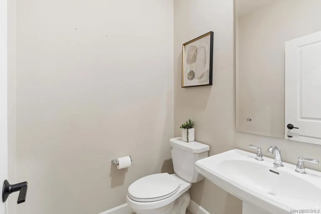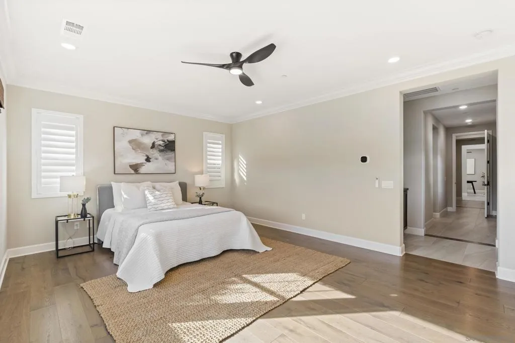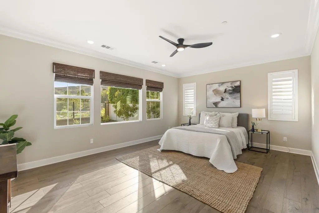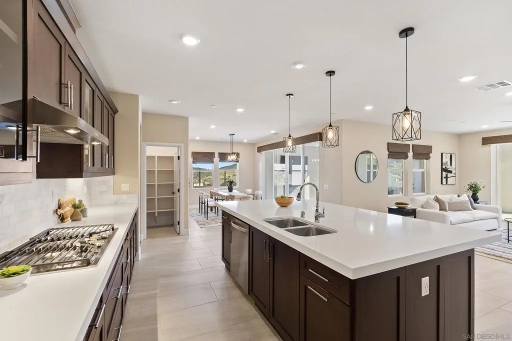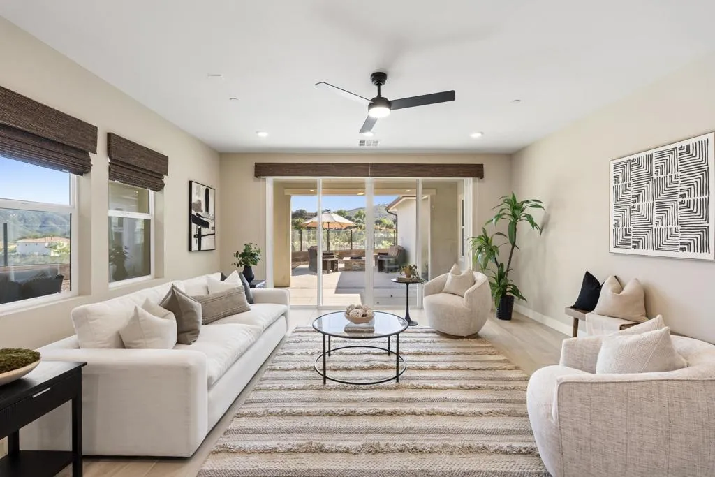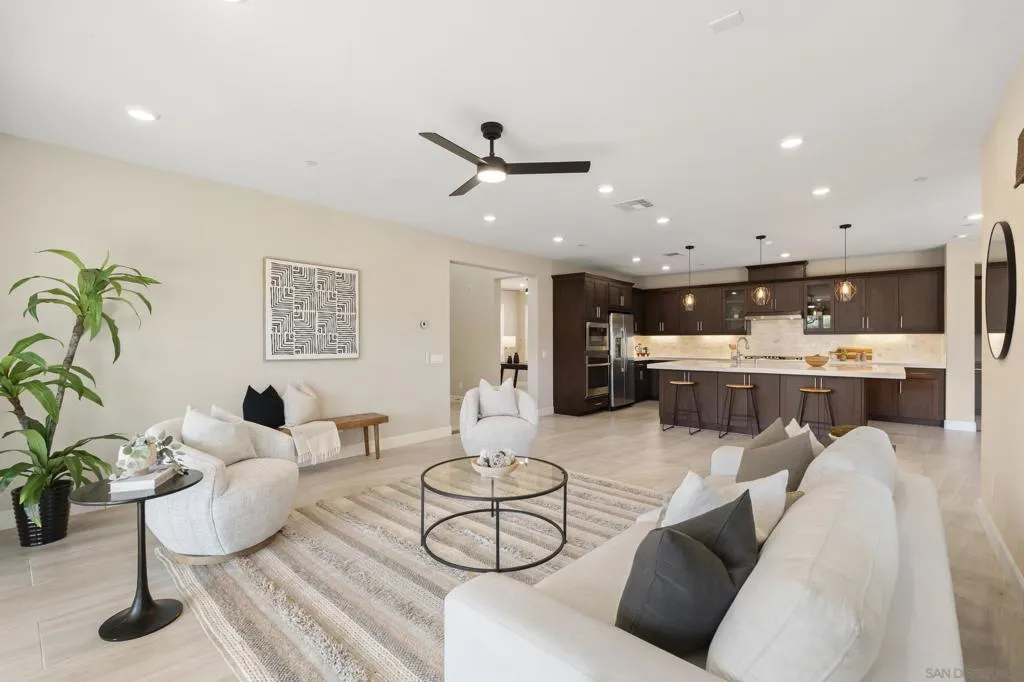 Welcome to refined Southern California living in Harmony Grove Village, where this exceptional residence features OWNED solar, sweeping 180° panoramic mountain views, and true indoor-outdoor resort-style living. Situated on a 0.18-acre lot, this beautifully upgraded home offers 4 bedrooms, 3.5 bathrooms, a dedicated office, and an upstairs loft with a private view balcony. The main-level primary suite is a private retreat with a spa-inspired bath and dual walk-in closets, complemented by a first-floor guest bedroom with full bath—ideal for multigenerational living or guests. The open-concept great room flows into a chef’s kitchen with a large center island, quartz countertops, stainless steel appliances, walk-in pantry, soft-close cabinetry, and designer lighting. Upstairs, secondary bedrooms surround a versatile loft opening to sweeping mountain views. Designed for California living, the wraparound California Room includes a built-in gas fireplace, recessed lighting, and TV wiring for year-round entertaining. The landscaped backyard features low-maintenance paver hardscaping and mature fruit trees. Additional highlights include pre-wired smart home technology throughout, three smart thermostats/HVAC zones, first-floor laundry with utility sink and cabinetry, epoxy-finished 3-car tandem garage, and extended driveway parking. Community amenities include resort-style pool, scenic trails, and playgrounds in a premier master-planned setting