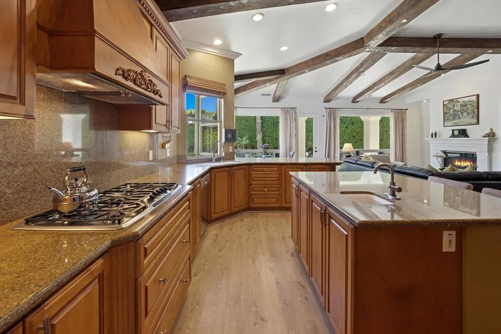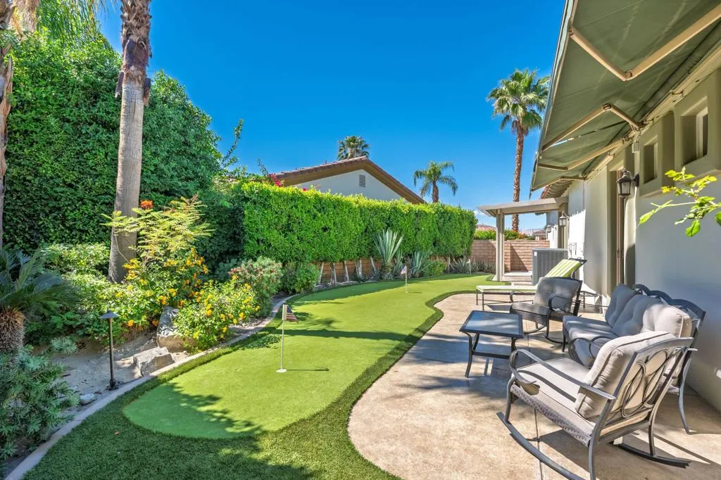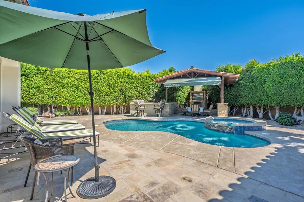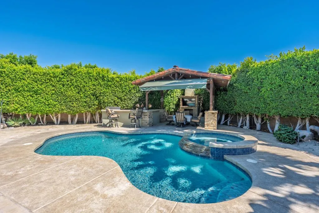 Located in the exquisite, intimate gated enclave of Cielo-comprised of 15 custom homes in the heart of Rancho Mirage-sits this stunning property on a private 15,000 sq. ft. lot. This 4-bedroom, 4-bath home offers over 3,600 sq. ft. of grand living space, including a completely detached, spacious casita with an en-suite bath and fireplace. This property has recently benefited from over $130,000 of upgrades. Enjoy numerous custom features and updates, such as soaring ceilings throughout, solid-core doors, dual pane windows, newer HVAC systems and ductwork, newer pool equipment and pool/spa resurfacing, hardwood floors, and recently painted interior and exterior of home, along with awnings and solar. Step into the gourmet kitchen, featuring granite slab countertops, a center island, stainless steel appliances, a separate bar area, ample cabinet space and a butler's pantry. Relax in the generously sized primary suite complete with a large walk-in-closet, spa-like bath, a deep soaking tub and walk-in shower. Outdoors is an entertainers dream with a spectacular backyard showcasing a sparkling pool and spa, fire pit, putting green, beautiful landscaping, a cabana with a TV, heater, lighting, and ceiling fan, as well as a built-in BBQ, outdoor kitchen, and a bar. Multiple covered patio spaces offer a misting system and awnings. Enjoy an outdoor, air-conditioned bonus room perfect for an office or hobby space. Other features include a decorative fireplace in the living room, exposed beam ceilings, water purification system, ceiling fans, separate laundry room with sink and a well-sized 3 car garage with storage. This unique community is very close to all conveniences such as shopping, restaurants, and a movie theatre, and just minutes away from Eisenhower hospital. HOA dues are low-making this a truly special offering!