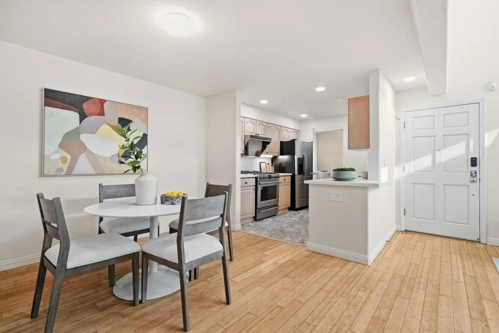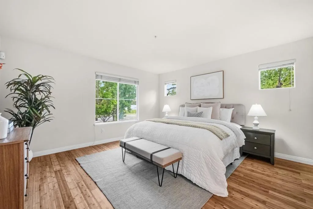 Beautiful two-story Expressions townhouse-style home featuring 2 spacious primary suites, 2.5 baths, a den, and approximately 1,584 sq ft of living space, plus a large private balcony. Dramatic high ceilings create an open and airy atmosphere, while the living room offers a cozy fireplace for added warmth and charm. The kitchen is equipped with stainless steel appliances, including a gas range, and the home also features interior laundry, central heating and air conditioning, premium bamboo flooring, new bedroom flooring, and updated stairs. Enjoy the convenience of an oversized side-by-side 2-car garage.Ideally located in the heart of Silicon Valley, the community offers resort-style amenities including a pool, spa, clubhouse, playground, and BBQ area, with HOA covering water. Excellent location close to schools, parks, shopping, major tech companies, downtown Sunnyvale, Highways 237, 85, 101, and Caltrain.