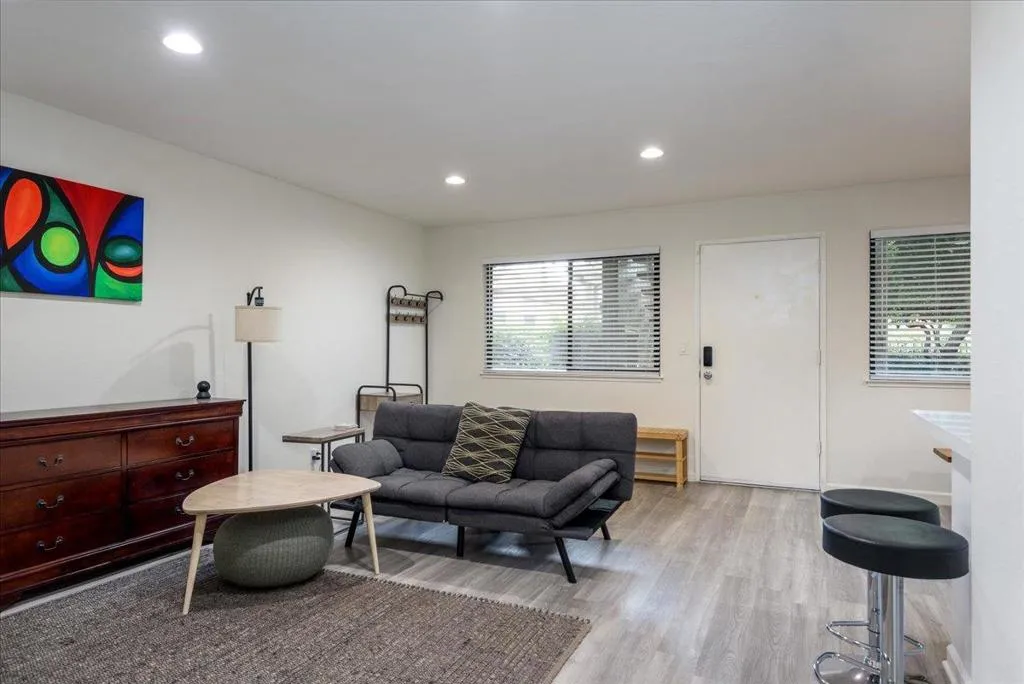 Welcome to your private retreat in the heart of downtown Campbell, just steps from the vibrant shops, restaurants and entertainment at The Pruneyard! This tastefully updated 1-bed, 1-bath condo offers a blend of comfort, convenience, and lifestyle. Ideally situated on the ground-level, the home enjoys a central location within the community, offering direct access to the pool and spa - perfect for unwinding right outside your door. Inside, you'll find a modern, open-concept layout with living and dining areas flowing seamlessly together. The updated kitchen features quartz countertops, a convenient breakfast bar, and refinished cabinetry, while refreshed laminate flooring adds warmth and style. The generously-sized bedroom includes a walk-in closet, and the split-bathroom design provides ample storage and functionality. Additional community amenities include covered parking, a well-maintained laundry facility, and HOA dues that cover water and garbage. Whether you're a first-time buyer, looking to downsize, or searching for an investment, this is an opportunity you won't want to miss.