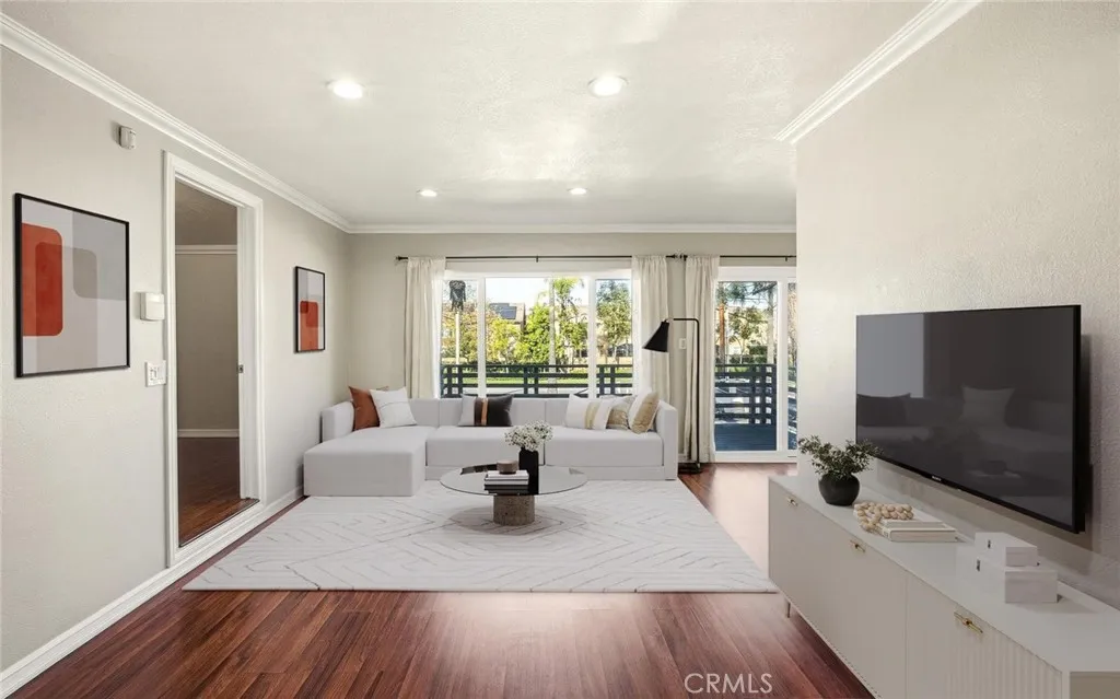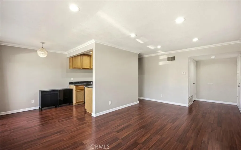 Upper-level Unit #24 featuring 2 Bedrooms, the master with a walk-in closet. The unit offers laminate wood flooring throughout, a living room with crown molding and recessed lighting, and a kitchen with granite countertops and recessed lighting. The dining area is adjacent to the kitchen and opens to a balcony. The one Bathroom has been upgraded with marble and stone finishes. Additional improvements include double-pane windows and sliding glass doors, along with fresh interior paint. Conveniently located near shopping centers, restaurants, movie theaters, public transportation, and parks, with close proximity to California State University, Fullerton (CSUF). Community amenities include pools, spas, outdoor BBQ, and four on-site laundry facilities, HOA fees that include water, Trash and gas utilities. Move in ready.