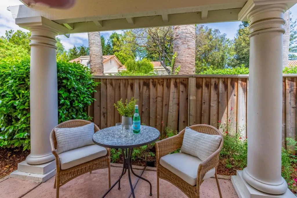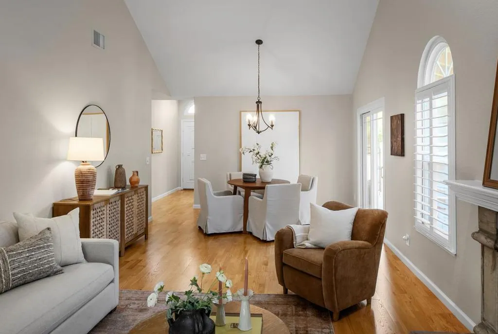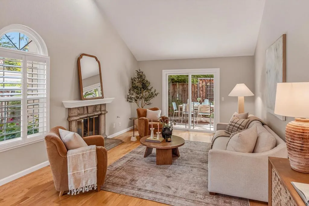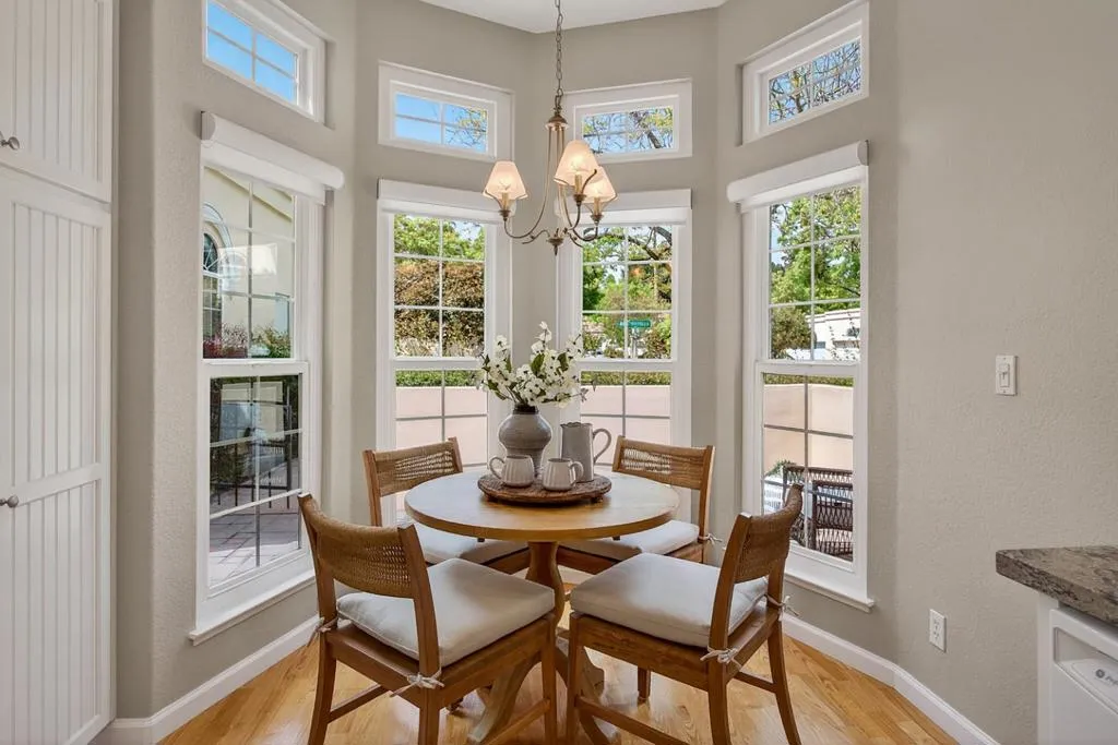 Natural light pours through tall arched windows in this beautifully positioned Cuernavaca home, where every space feels open, bright, and connected to the outdoors. Set on a corner lot with mature trees and a wraparound lawn, the home welcomes you through a gated courtyard and into warm interiors with high ceilings and light-hued hardwood floors throughout. The kitchen is both functional and inviting, finished with granite countertops, crisp white cabinetry, and a charming dining nook framed by a curved wall of windows overlooking the courtyard, an ideal spot for morning coffee. The living and dining areas flow seamlessly beneath soaring ceilings, each opening to outdoor spaces for effortless indoor/outdoor living. Three bedrooms include two with easy access to the hall bath, and a spacious primary suite with vaulted ceilings, backyard access, dual closets, and a skylit shower. Outside, enjoy three distinct settings: a private front courtyard, a covered side patio, and a lush backyard with mature Japanese maples, roses, and layered landscaping. Community amenities include a pool, spas (one just steps from the home), tennis courts, and clubhouse with a gym, all moments from shopping, dining, commute routes, and major tech campuses.