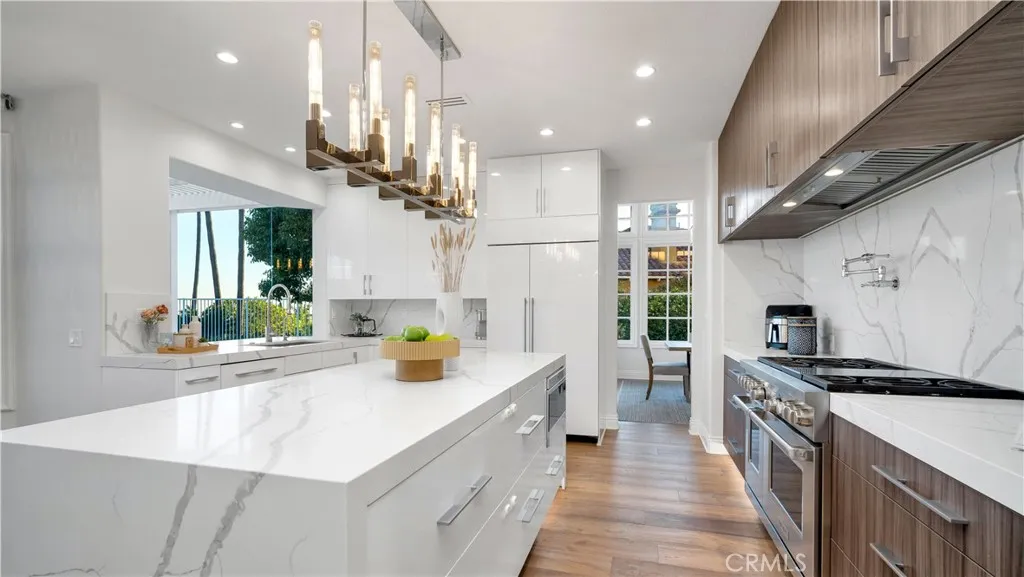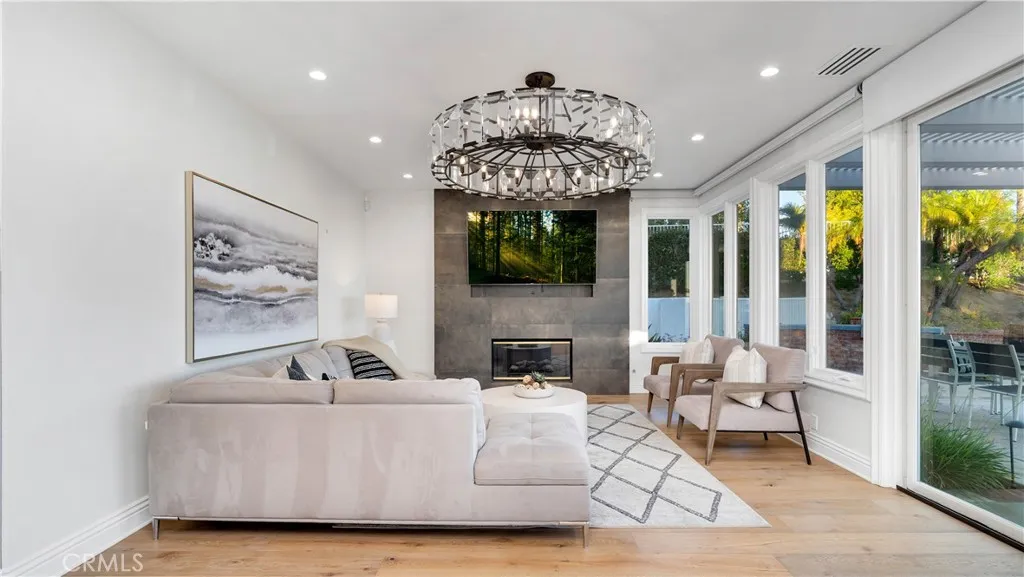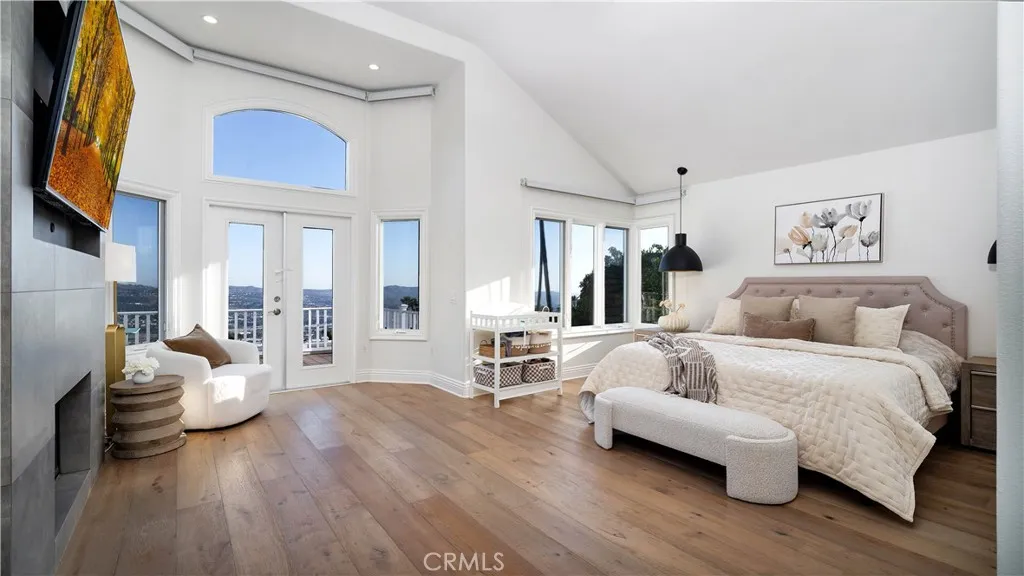Perched at the top of the prestigious Hidden Hills neighborhood of Yorba Linda, 4855 Green Crest Drive is a ONE-OF-A-KIND ARCHITECTURAL GEM offering PRIVACY, PANORAMIC VIEWS, AND LUXURY AT EVERY TURN. With no neighbor in front, the home captures sweeping canyon and sunset views, while the backyard opens to unobstructed city lights, creating a serene setting to unwind after a long day. From the moment you step through the custom glass entryway, you're greeted by dramatic ceilings, a contemporary chandelier, and an opal white satin marble staircase that sets the tone for the rest of the home. Natural light floods the space, while French oak hardwood floors add warmth and sophistication highlighting the seamless flow and elegant finishes throughout. The formal living room centers around a striking floor-to-ceiling quartzite fireplace, while the adjacent dining room is surrounded by picture windows that frame peaceful garden views. The heart of the home is the chef’s kitchen, featuring dual-tone European-style custom cabinetry, quartz counters, and a frameless bay window that invites the outdoors in. Outfitted with SubZero and Wolf appliances, and a generous center island with waterfall counters, this kitchen is as functional as it is beautiful. Just off the kitchen, a casual dining nook and spacious family room make everyday living feel elevated. The main level also offers an ensuite bedroom, ideal for guests or multigenerational living, along with a versatile flex space perfect for a home gym or office. Upstairs, the primary suite is a true retreat with its vaulted ceilings, cozy fireplace, spa-like bath with large marble shower, dual sink, freestanding bathtub, and two large custom walk-in closets. Step onto the private balcony to soak in the breathtaking views, day or night. A large upstairs bonus room with canyon views and full bath offer endless possibilities, whether as an additional bedroom, media room, or playroom. Each bathroom has been thoughtfully designed with iron and marble Hudson vanities with frameless glass tiled showers. The expansive backyard is designed for unforgettable gatherings, with multiple entertaining and dining areas, a large pool and spa, BBQ island, and postcard-worthy views in every direction. Additional features include a PAID 52-panel solar system, EV charging, motorized shades, designer lighting, modern HVAC vents, and 3-car garage. This is not just a home, it’s a statement of timeless design, comfort, and California luxury.