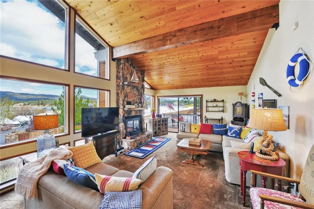 This custom built, cozy Big Bear getaway offers lakeside living at its finest, complete with amazing views of Big Bear Lake and with 2 private boat slips JUST STEPS AWAY at Pleasure Point Marina included in the sale. This home's reverse floor plan features an expansive, open living area with wood beamed vaulted T&G knotty pine ceilings. A wall of lake facing windows showcases spectacular lake, marina and mountain views and while offering plenty of natural light. A floor to ceiling stone fireplace adds to the mountain charm while the living room loft and den with pull-out couch offers versatility as a sitting area, game room, or 4th bedroom. Don't miss the sizable outdoor deck - an amazing place to entertain, BBQ and enjoy the lake and mountain views. Downstairs offers a separate family room with a second stone fireplace with wood burning stove, a convenient place for playing games, reading or just plain relaxing. Centrally located, you're not only right next to Big Bear Lake, but you're only minutes away from The Village, Big Bear Mountain Resorts, Boulder Bay Park and National Forest. Come take a look at all this spectacular property has to offer!