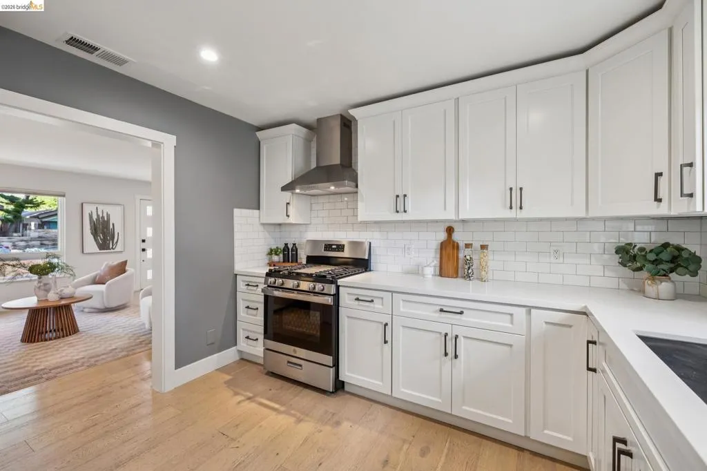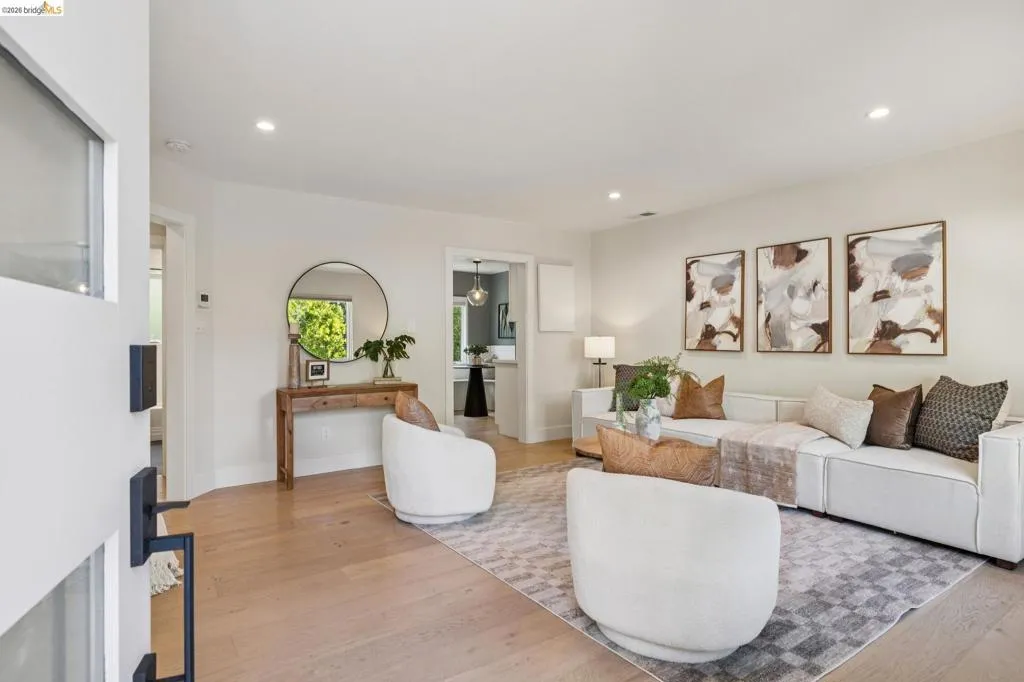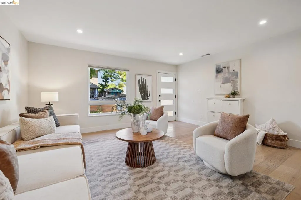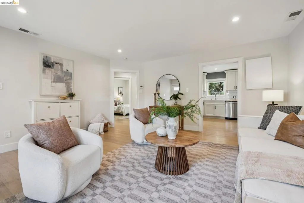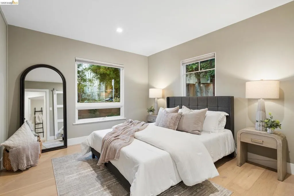 California's indoor-outdoor lifestyle is captured to great effect in this cozy, turnkey LEVEL IN SINGLE LEVEL modern farmhouse. Located in the heart of West Berkeley and positioned near the vibrant Fourth Street district, the 3-bedroom home sits behind a gated front yard while maintaining effortless flow to a private, flat yard for outdoor entertaining. Meticulously maintained and thoughtfully updated, the property has integrated some high-efficiency features such as a modern heat pump AC system, and dual pane windows earning a 9/10 Home Energy Score, BESO Compliance, and a $0 Section 1 clearance. The interior is anchored by the organic texture of European Oak plank floors, while contemporary touches such as new designer lighting throughout and modern black-trimmed dual-pane casement windows flood the spaces with natural light and clear sight lines. The updated chef’s kitchen achieves a balance of old and new, featuring shaker-style cabinetry, quartz countertops, a classic subway tile backsplash, stainless steel GE appliances and an eating area with a built-in corner banquette. The bathroom features a subway tile shower surround with a charcoal hexagon tile floor for a modern pop. Two bedrooms off the living area feature frosted glass barn doors on the closets, while a flexible third bedroom offers a quiet retreat. An indoor laundry room features ample counter space, side-by-side W/D and outdoor access. Thoughtful storage is achieved through adjustable Elfa closet organizer systems throughout. The sunny backyard is a private modern oasis for nature lovers and garden enthusiasts, featuring low maintenance turf, gravel seating area, raised veggie beds, and established trees for extra privacy. With a 93 Walk Score and 94 Bike Score, it offers easy access to Rosa Parks School, local favorites like Franklin Brothers Market and Cafe Chiave, and is a short distance to North Berkeley BART.