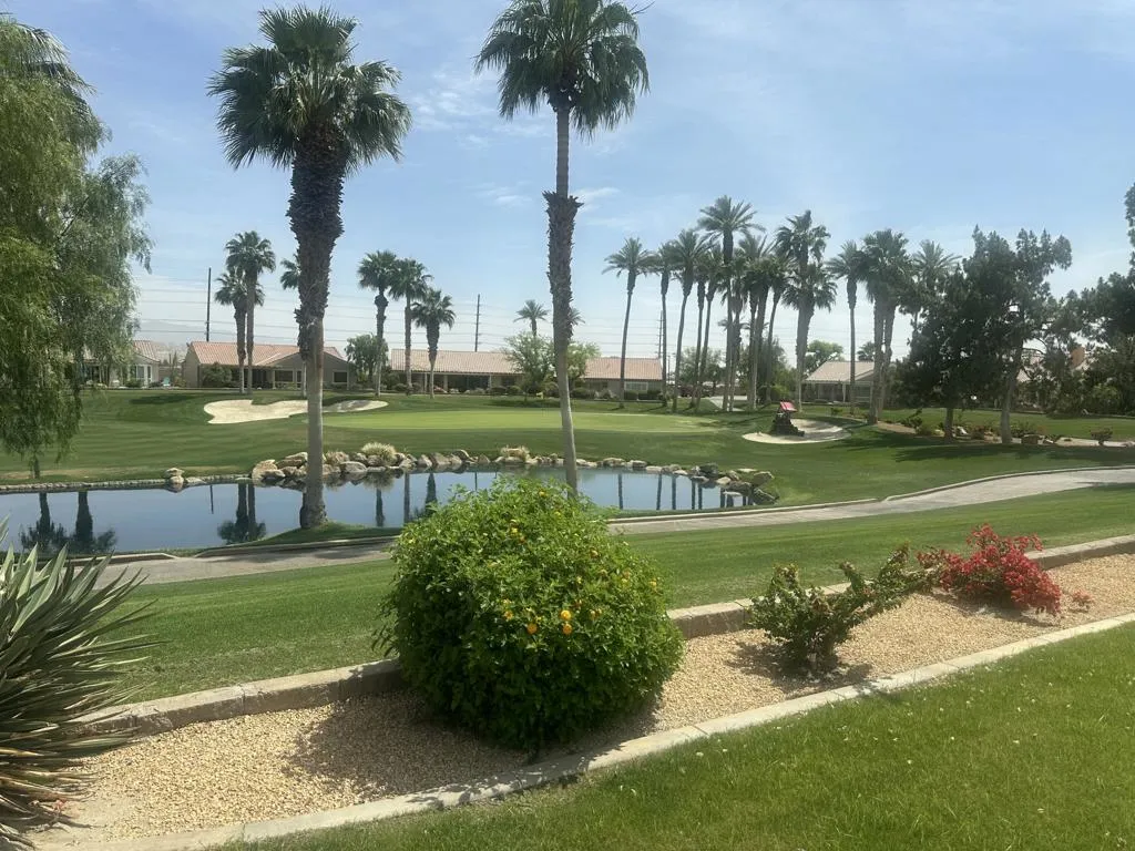 Sun City Palm Desert. OUTSTANDING GREAT ROOM PORTOFINO (2907 square feet)with the MOST INCREDIBLE VIEWS ...This beautiful home is next to the 17th green of the San Gorgonio golf course, on an elevated lot with views of a large lake front , fairway, and putting green with a lovely eastern exposure. To add to this wonderful experience , it offers an inviting in ground salt water pebble tec spa. The 25' long stainless BBQ ISLAND for entertaining is an added bonus to the patio. An automatic awning is also provided so you can sit in the shade to enjoy the spectacular views! This fabulous elevated lot is enhanced with a flagstone trimmed patio! The front entry has great curb appeal with beautiful landscaping, flagstone trimmed concrete, and gorgeous glass enhanced double doors!When entering the great room floor plan, you are greeted with walls of glass showcasing the spectacular views! The beautiful 18' tile flooring laid tastefully on the diagonal, is throughout the entire living space. The great room is very spacious with fireplace and plenty of recessed lighting with additional speakers in the ceiling. The kitchen has been remodeled with new Kenmore Elite stainless steel appliances with a 5 burner gas range, and a stainless steel french door refrigerator The conveniently located island has gorgeous quartz counters with contrasting cabinetry tones, and bead board molding . You will LOVE the all glass corner window at your kitchen sink to enjoy the incredible views. All three bedrooms are 'en suites' suites with an additional powder room for your guests ! The primary bedroom has been extended with french doors leading to the patio, and includes tasteful shutters and built in speakers . The primary bath has been updated with above the counter glass sink bowls and matching spouts on lovely matching spouts on lovely granite countertops. The primary shower offers a misting system with both music and steam and there is also a relaxing tub with jets to enjoy.The primary's retreat has shutters and a french door to the courtyard. The laundry room offers a beautiful red Kenmore Elite front load washer/dryer. The garage is extended with two car spaces and a golf cart garage with cabinets and. plenty of storage.This home has EVERYTHING on your wishlist and all in the premier award winning 55+ community Sun City Palm Desert.