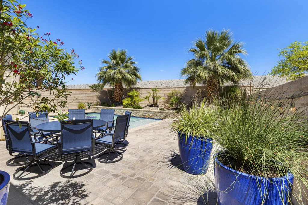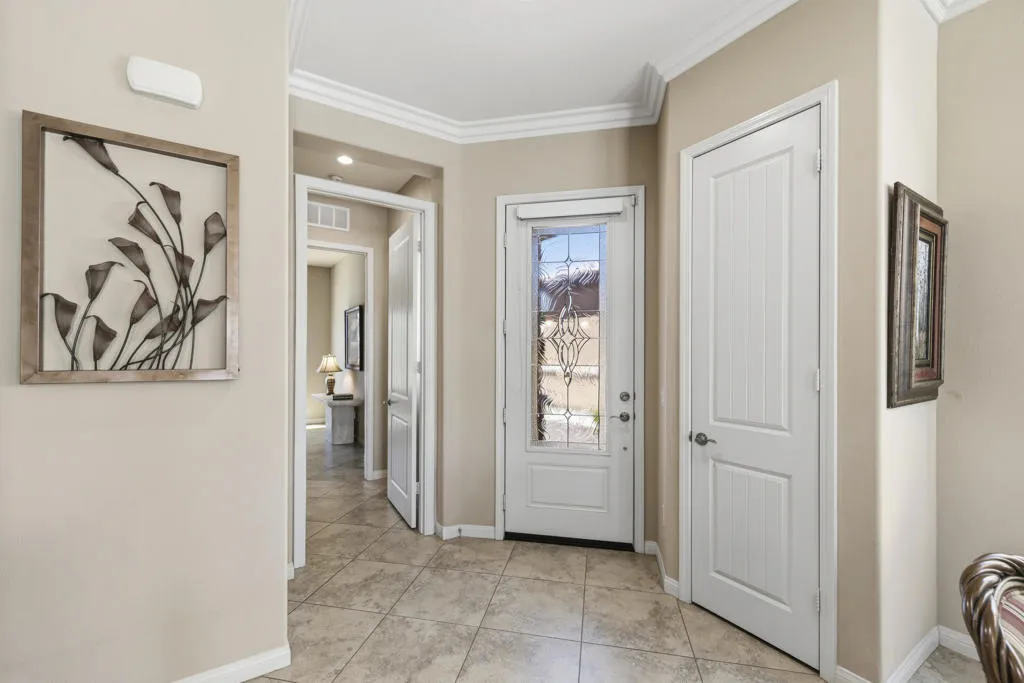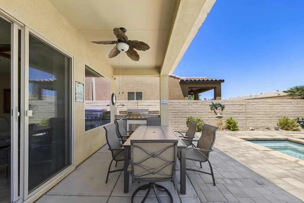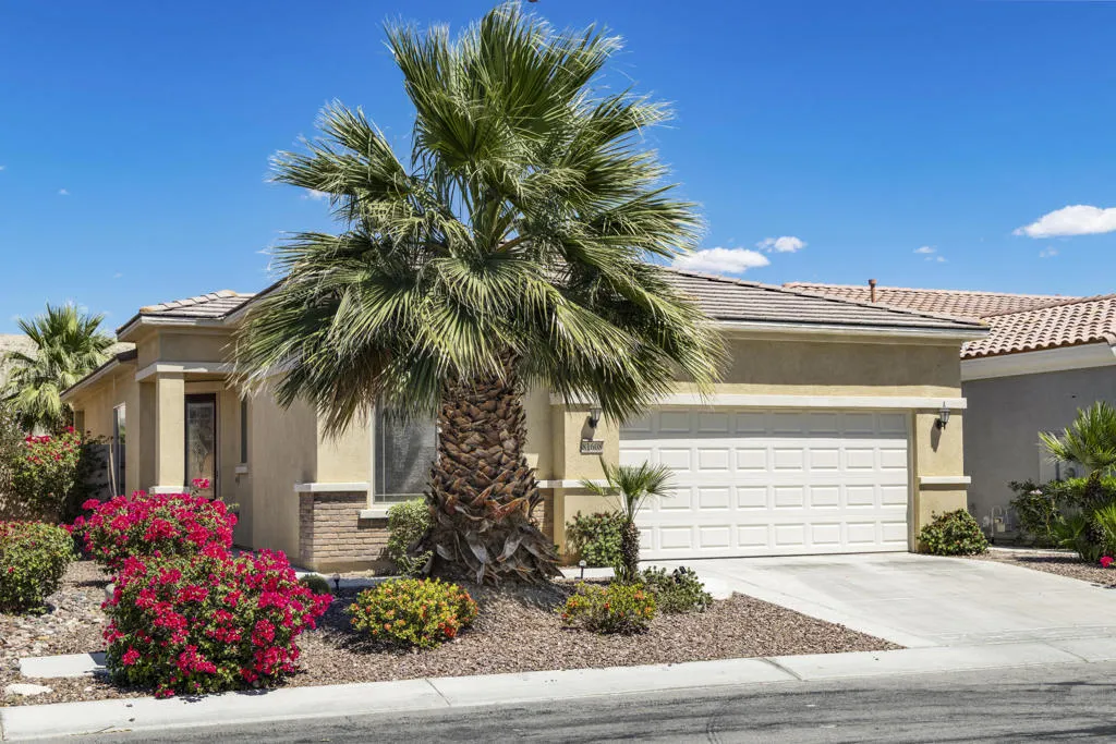 As you enter though the custom leaded glass door with retractable screen, you will notice this stunning Embark Model is filled with upgraded and designer touches. The spacious kitchen has top end appliances including two ovens, microwave and , fabulous backsplash to ceiling, also pull out shelving and a pantry. The light Great Room has a built-in entertainment center with plenty of room for storage. All closets have been designed for maximum storage. Master bedroom window has been replaced by a slider. Bathroom has a Barn Door, dual vanities , walk-in shower and custom built-out closet. The Junior Suite guest bedroom has been maximized for functionality with a handsome Murphy bed that converts to desk for efficient office space. 20' Digonal Tile flooring throughout house, Crown molding, fans, and 10 foot ceilings. You will appreciate the high efficiency whole house air-conditioner . Also there is High efficiency LED lighting. The extended insulated garage which can fit a golf cart, features a Tankless water heater, epoxy flooring, a Split Air conditioner, a swamp cooler, insulated garage with great overhead storage racks. Now fall in love with your desert outdoor living! Privacy Plus! backyard has Saltwater Pebble Tech Pool/Spa with Tanning shelf and Waterfalls, Pavered oversized Patios, Firepit and Built-in Top of the line Gas BBQ. The low maintenance but beautiful landscaping enhances property with it raised planterbeds and giant planter pots. A complete package to start enjoying your desert living experience in Sun City Shadow Hills. Two golf courses, 3 swimming pools and spas, pickle ball, bocce ball, tennis, plus 40+social clubs. Priced to sell. Come see this beauty today.