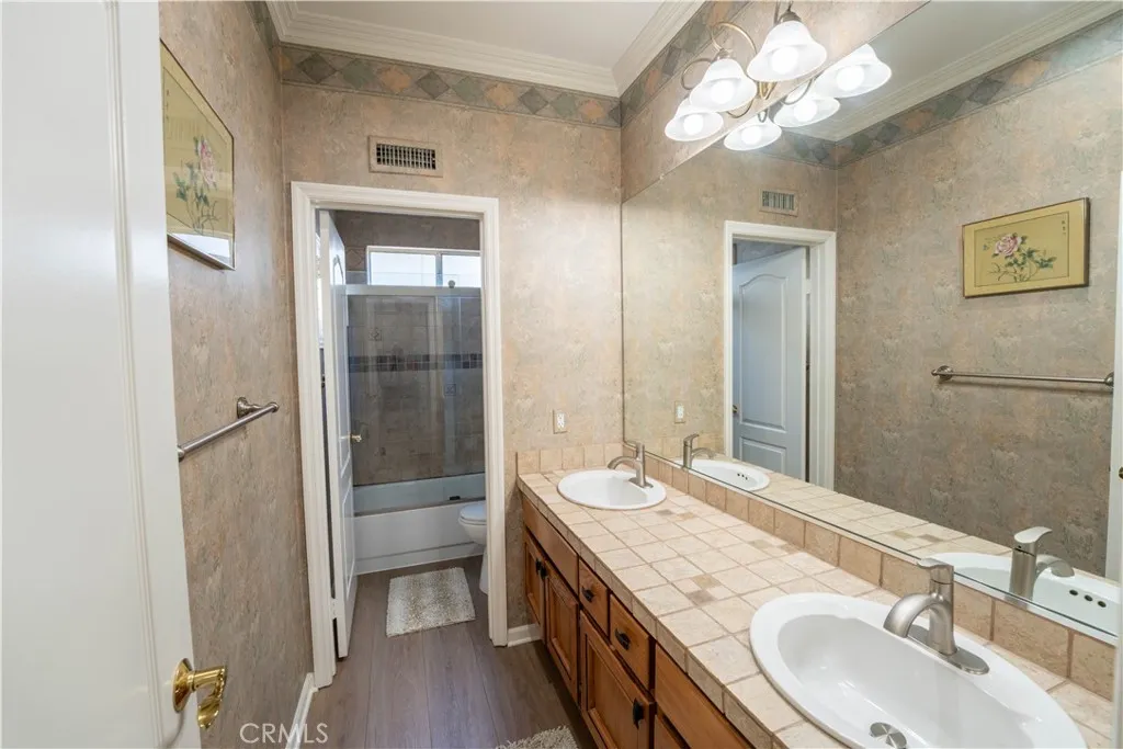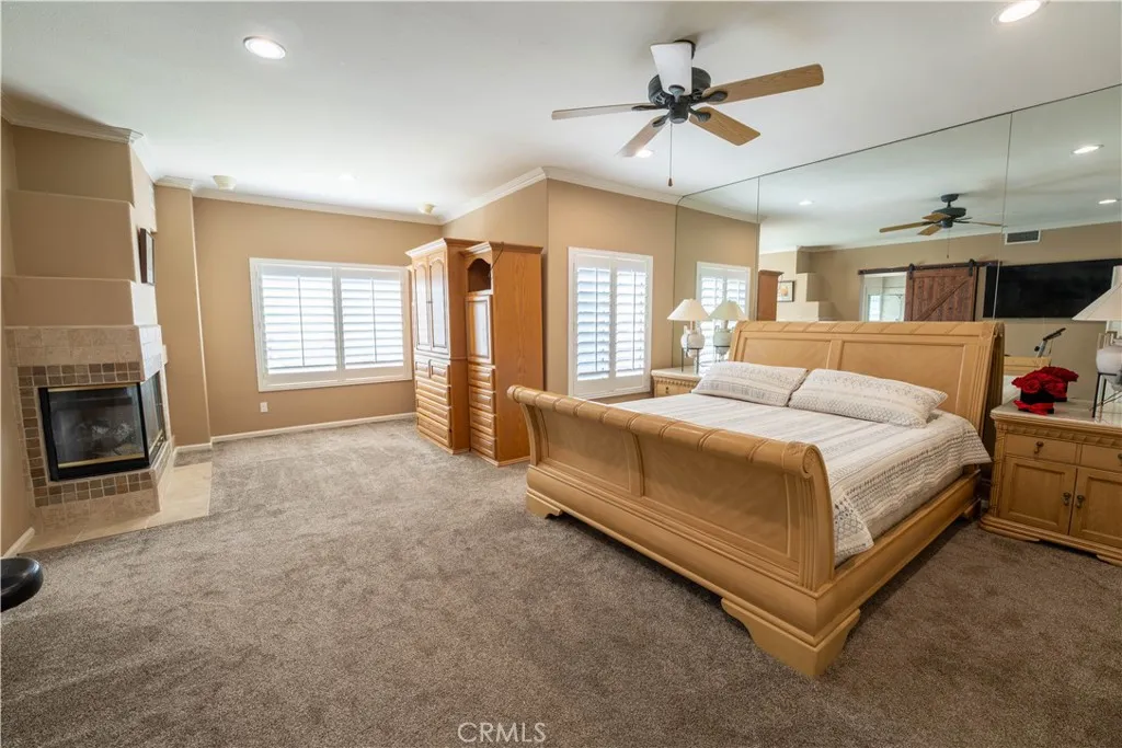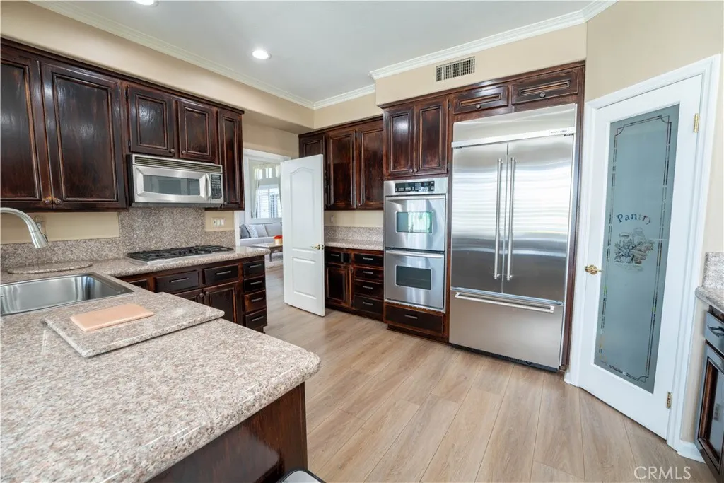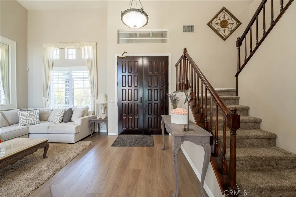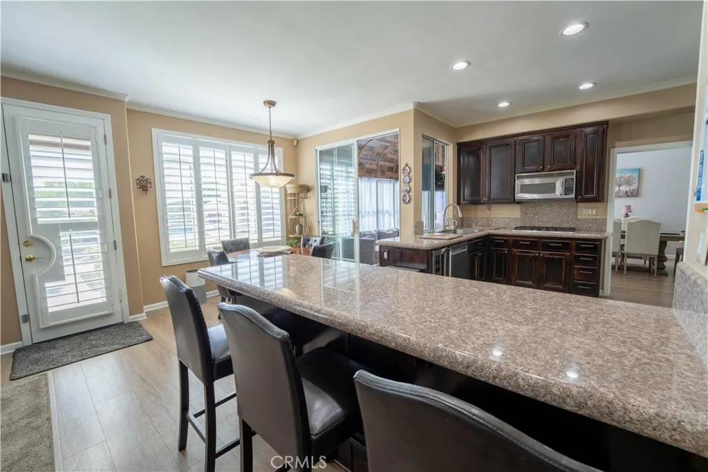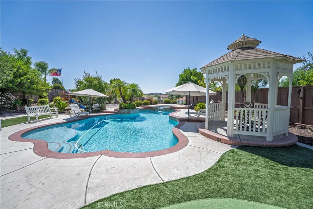 Former model home on a quiet street with no rear neighbors, backing to a natural ravine with scenic sunrise and moonrise views. This 4-bedroom, 3-bath home offers 2,861 sqft on a spacious 0.35-acre lot. Recent upgrades include PEX plumbing (Dec 2025), updated bathroom fixtures, improved pool plumbing, refreshed irrigation, exterior lighting, recessed lighting, new upstairs carpet, and plantation shutters throughout. The kitchen features a built-in refrigerator, double oven, dishwasher, and Viking wine fridge. A downstairs bedroom with full bath is ideal for guests. Upstairs includes a spacious primary suite and two bedrooms with balcony access, as well as a versatile bonus room. Enjoy a private backyard with pool/spa, putting green, BBQ area, firepit, and outdoor sound. 3-car garage with EV outlet and low-maintenance turf complete the home. Luxury, privacy, and upgrades—this home has it all!