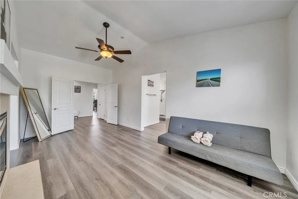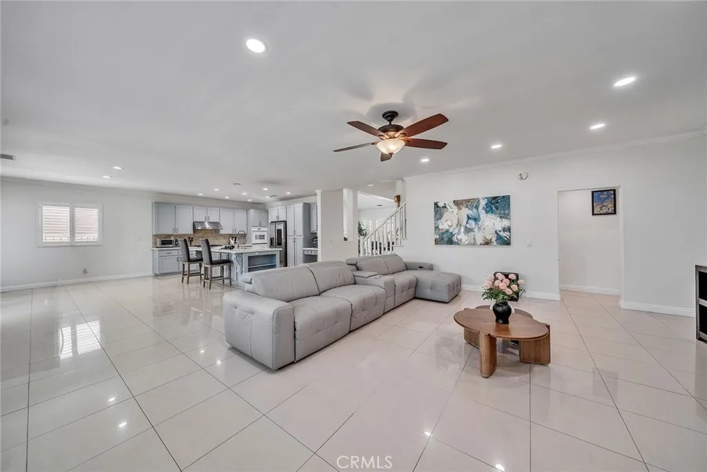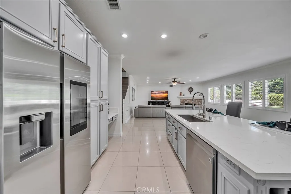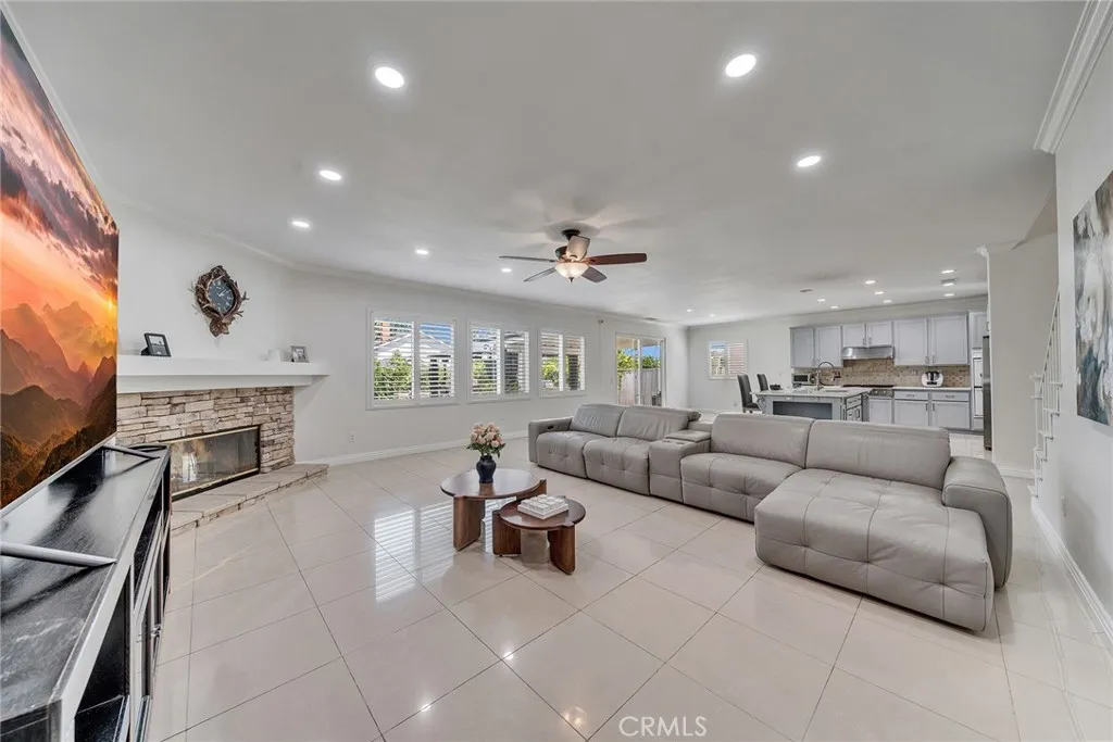 Welcome to this charming contemporary home, ideally positioned on a generous lot with sweeping views of the San Gabriel Mountains, Angeles National Forest, and Mt. Baldy. A pair of double entry doors framed by stacked stone creates a striking first impression and sets the tone for the quality found throughout. Inside, an elegant foyer opens to a dramatic Great Room with soaring sloped ceilings, a warm fireplace, and seamless flow into the spacious open-concept gourmet kitchen. Designed for both everyday living and entertaining, the kitchen showcases a high-BTU stainless steel gas range, abundant cabinetry, and a stunning one-piece stone island accented by custom millwork. The main level also offers exceptional versatility, featuring a dedicated home office or den, a secondary bedroom, two bathrooms, a laundry room, and a deep three-car garage. Upstairs, the private primary suite serves as a true retreat, complete with a double-sided gas fireplace, soaking tub, dual vanities, and a walk-in closet. Three additional hardwood-floored bedrooms are located across the hall, including a boutique-style bedroom created by combining two original rooms. Step outside to an oversized backyard patio ideal for entertaining, barbecuing, or simply relaxing. Stunning outdoor upgrades include a water feature, artificial grass, and a cozy built-in seating area.