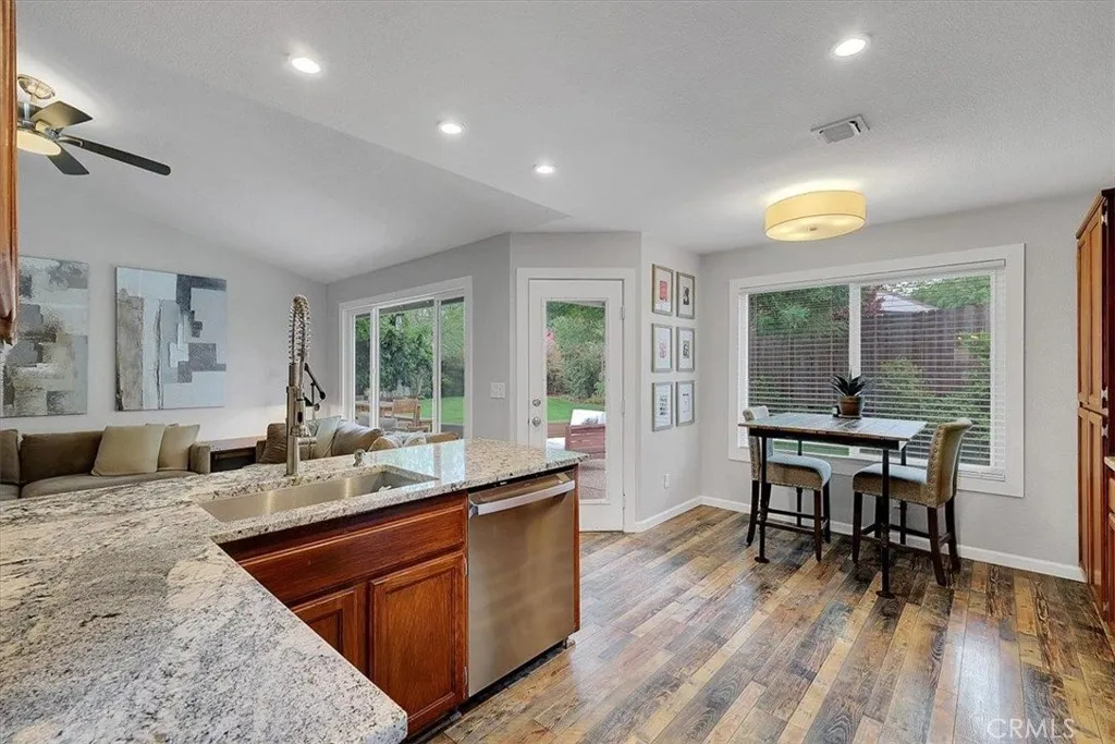 Welcome to 2441 Burl Ct an exceptional home nestled in a quiet cul-de-sac where comfort, space, and thoughtful upgrades come together beautifully. This well-maintained 3-bedroom, 2-bath residence offers 1,625 sq. ft. of living space along with a rare 3-car garage, all designed with an open, functional layout ideal for both everyday living and entertaining. Step inside to a bright formal living and dining area highlighted by soaring ceilings and a stunning custom front window, filling the space with natural light. The heart of the home features an updated kitchen with granite countertops, abundant cabinetry, recessed lighting, and a cozy breakfast nook, seamlessly opening to a spacious family room with a warm gas fireplace perfect for gatherings of any size. The primary suite offers a private retreat, complete with direct backyard access and a generously sized bathroom featuring dual sinks, a walk-in shower, and a large walk-in closet. Ceiling fans throughout enhance comfort and efficiency. This home has been thoughtfully upgraded over time, including interior layout enhancements near the fireplace, newer insulated garage doors (Nov 2025), an updated front door, and Buttacavoli windows (2022) with custom trim. Additional improvements include durable laminate flooring, recessed kitchen lighting, a whole house fan with timer for improved ventilation, landscape lighting on timer, roof updates with replaced valleys and upgraded underlayment, high-density gutters, and recently replaced concrete near the spa. A leased solar system adds to the home's energy efficiency. Enjoy outdoor living in the beautifully landscaped, low-maintenance backyard, ideal for relaxing or entertaining on the concrete patio. The side yard provides additional space for storage, a shed, or future possibilities. Conveniently located just minutes from schools, shopping, and major highways, this home also offers close proximity to scenic river trails and local parks delivering both accessibility and lifestyle. Move-in ready and full of value don't miss your opportunity to make this home yours!