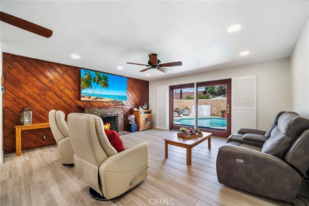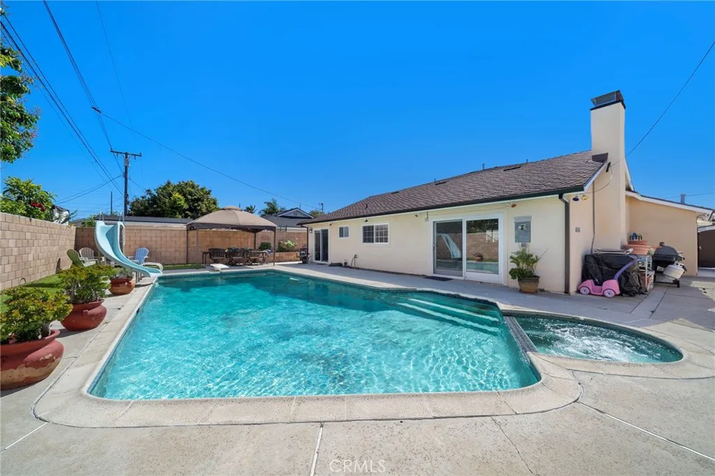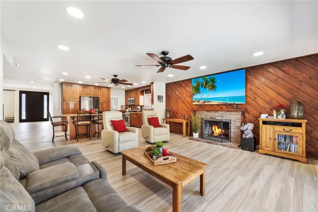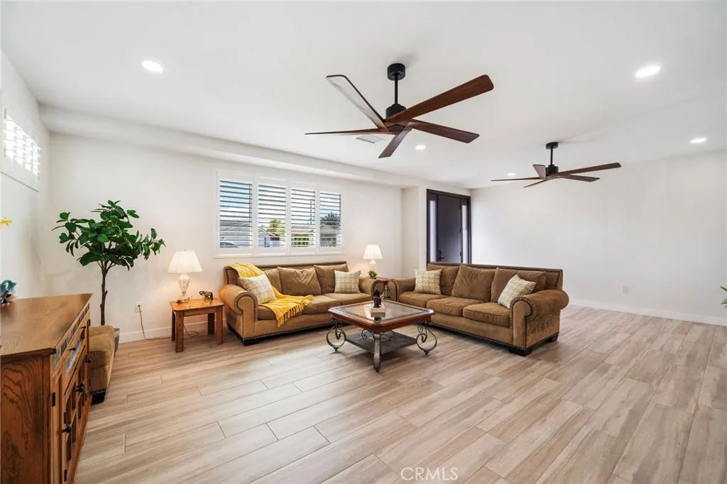 Absolutely stunning and extensively expanded, this gorgeous pool home offers 4 bedrooms, 3.5 baths, a spacious loft (easily a 5th bedroom), and approximately 2,510 square feet of beautifully upgraded living space in a pride-of-ownership neighborhood on the border of Huntington Beach and Fountain Valley. Completely reimagined just two years ago with a permitted two-story front addition, this home showcases a grand formal living room with 9 foot ceilings, porcelain wood-grain tile flooring, ceiling fans, recessed lighting, dual pane windows, plantation shutters, and custom 7.5 foot solid wood interior doors, with an elegant half bath and inside laundry room conveniently located off this space. A striking White Oak staircase with custom wrought iron railing leads to the all-new second level featuring a versatile loft ideal for a bedroom, office, or playroom, and a luxurious primary suite with dual closets, ceiling fan, and a spa-inspired ensuite boasting quartz vanity, designer tile flooring, linen storage, and a stunning walk-in shower with floor-to-ceiling tile, multiple shower heads, and frameless glass enclosure. The expansive open-concept layout flows seamlessly from the new living room into the original home, now beautifully integrated with a gourmet kitchen featuring granite countertops, a large center island with wrap-around seating, custom cabinetry with pull-outs, two pantries, and stainless appliances including gas range, microwave, and dishwasher, all open to a banquet-size dining area and inviting family room with brick fireplace and a dramatic angled wood-slat accent wall. Sliding glass doors open to a private entertainer’s backyard with a sparkling pool and spa, complete with slide and diving board, concrete decking, a covered canvas gazebo, and block wall fencing. 3 additional bedrooms are located downstairs, including a second primary suite with an upgraded bathroom and new vinyl sliding glass doors with built-in blinds opening to the backyard. Additional highlights include a 200 AMP electrical panel with two 100 AMP subpanels, dual zone A/C, new rain gutters, and quality finishes throughout. Added bonus: separate driveway to concrete RV parking pad, equipped with electrical and sewer hook-ups. Ideally located near Little Saigon, Bella Terra, top shopping and dining, and just minutes to the beach, this exceptional home offers the perfect blend of luxury, functionality, and indoor-outdoor California living.