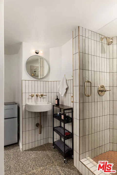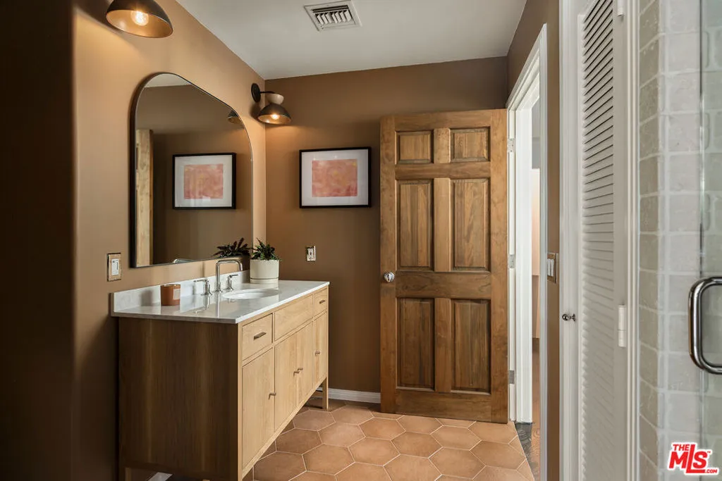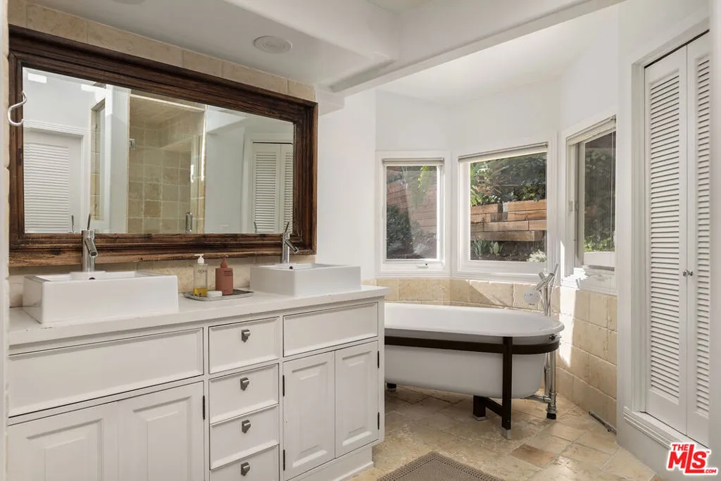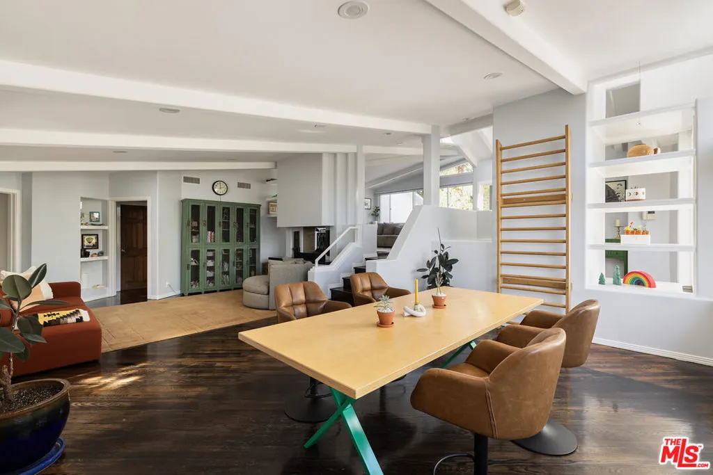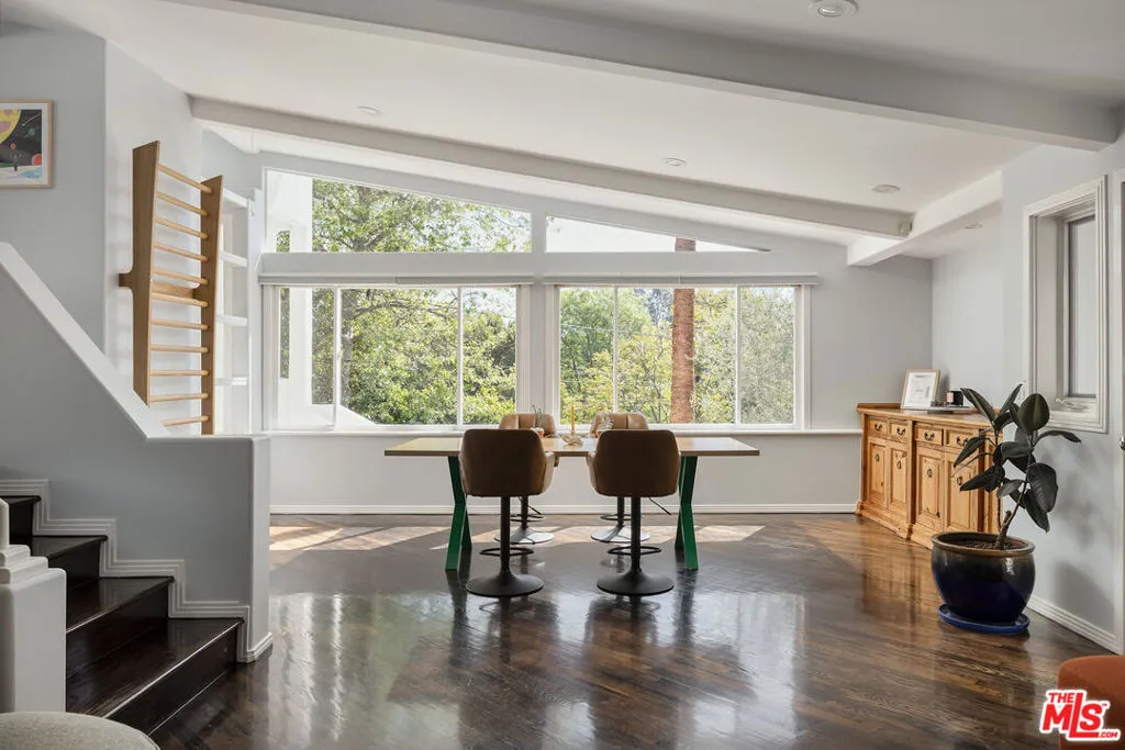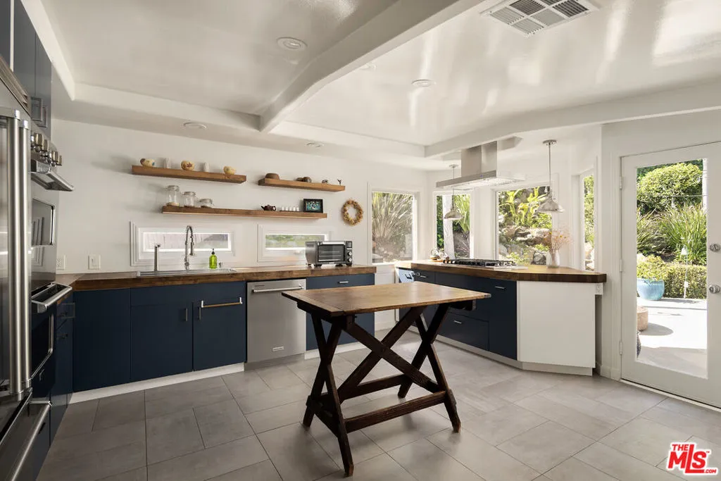 Few homes carry a legacy quite like this one. Originally created in 1951 by celebrated modernist architects A. Quincy Jones and Whitney R. Smith, 12317 Rochedale Lane stands as one of Los Angeles' most storied architectural addresses - thoughtfully renovated and available for the first time in years. Set on a quiet cul-de-sac in the coveted Crestwood Hills community, this 4-bedroom, 4-bathroom contemporary spans 2,659 square feet on a lush 9,102 sq ft lot. The striking all-white exterior with its clean geometric lines and sculptural form makes an immediate impression, while inside, soaring vaulted beam ceilings and walls of oversized windows fill every room with natural light framing lush canyon treetops. Rich dark hardwood floors run throughout the generous open living and dining areas, creating a warm, grounded contrast to the bright and airy architecture. The chef's kitchen is a true showpiece, outfitted with professional-grade Viking appliances including a French door refrigerator and double wall oven, bold navy cabinetry, warm butcher block countertops, floating wood shelves, and designer pendant lighting. French doors open directly to the gardens, making indoor-outdoor living completely effortless. Outside, the private grounds are nothing short of magical. A stone waterfall cascades into a tranquil pond surrounded by lush, colorful plantings, while a flagstone patio with a fire pit sets the scene for evening gatherings under string lights. Multi-level terraced gardens with mature palms and tropical foliage rise up to a large, flat grassy lawn with sweeping open-sky canyon views that glow at golden hour. A fourth bedroom suite on the lower level, with its own entrance and three-quarter bath, completes the home as a private guest retreat, office, or studio.
