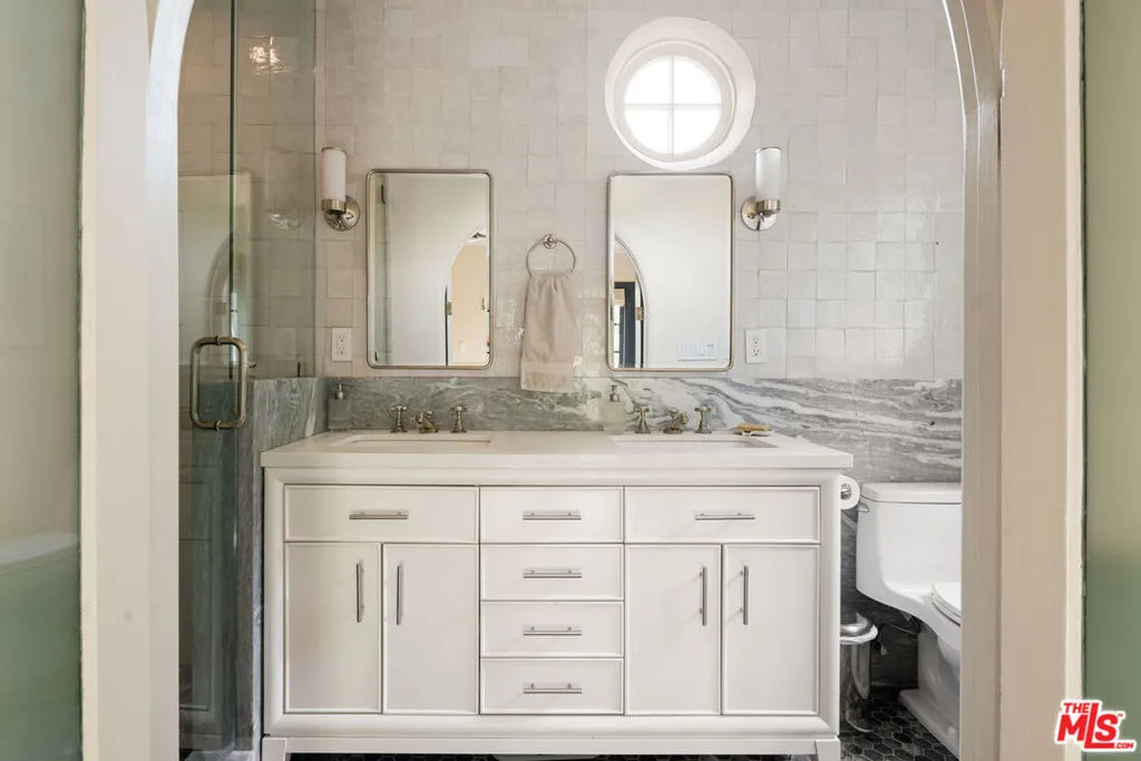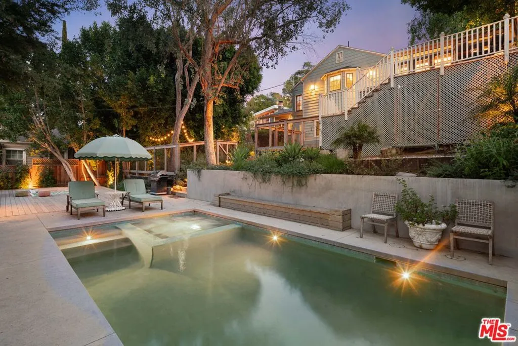 Tucked into the coveted Studio City hills, this character-rich 1930s farmhouse blends timeless charm with a thoughtfully curated, design-forward renovation. Set behind gates on an expansive 10,000-square-foot street-to-street lot, the property offers total privacy, and the potential for future expansion. Warm and inviting, the 3-bedroom, 3-bath residence (with two additional bonus spaces) is filled with soulful details and modern comforts. The living room stuns with soaring vaulted ceilings and a fireplace, creating an airy yet cozy gathering space. A formal dining room creates an unforgettable backdrop for entertaining with its paneled ceiling, and striking Bardiglio & Carrara marble checkerboard floors. The newly remodeled kitchen is both stylish and functional, featuring a built-in banquette, and designer lighting that carries throughout the home. Every inch has been thoughtfully restored, with an extensive renovation of the home by LA based Studio Macdonald Libit, seamlessly marrying old-world character with contemporary convenience. Step outside to a true private retreat. The grounds have been completely reimagined with lush, indigenous California landscaping, surrounding a brand-new saltwater pool, spa, and cold plunge. A dedicated gym and a hidden speakeasy-style bar add an unexpected layer of luxury and lifestyle. The newly rebuilt two-car garage is equipped with an EV charger, and the street-to-street lot includes a separate APN, offering a prime opportunity for an ADU with its own entrance off Regal Place, ideal for guests, rental income, or a creative studio. A rare offering where character, craftsmanship, and modern living converge in one of Studio City's most sought-after hillside settings.