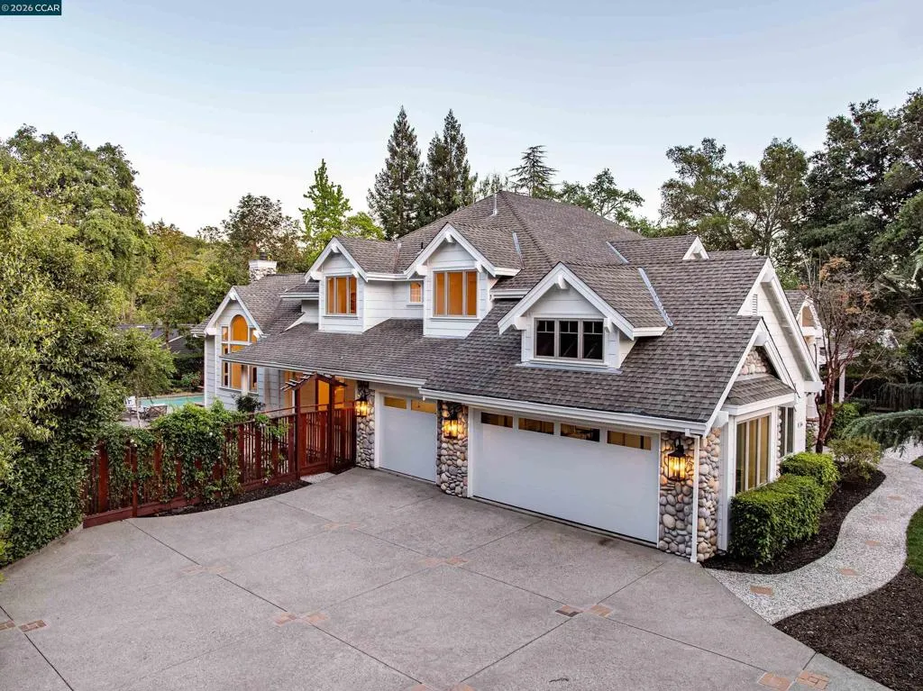 This distinctive home rests on a .67-acre lot in the heart of Upper Happy Valley. Entertain guests before dinner in the spacious living room (with a wood-burning fireplace) just off the grand entry foyer, or in the 399-sq-ft family room (under a 14-ft ceiling, with another wood fireplace and garden views on 3 sides) just down the hall. Newly refinished Tasmanian oak hardwoods link the living areas. The kitchen features a Jerusalem limestone island and counters, a Viking range, and a breakfast nook. Ample cabinetry and a walk-in pantry supply ample storage space. The principal suite and another bedroom are downstairs, each with garden views and a bathroom. The principal suite offers a spacious walk-in closet with built-in shelving and hanging space. The en-suite bath features dual sinks, a spa tub, and a large walk-in shower. Three other bedrooms and 2 bathrooms are upstairs, along with a 288-sq-ft media/play room, and closet space galore. Work from home is a pleasure in the office just off the entry foyer. The back yard is surrounded by redwoods, a striking Marina strawberry tree, and manicured gardens. It offers a 41-foot swimming pool, ample deck space, a hot tub, and a grassy play area. A driveway and 3-car garage provide ample parking.