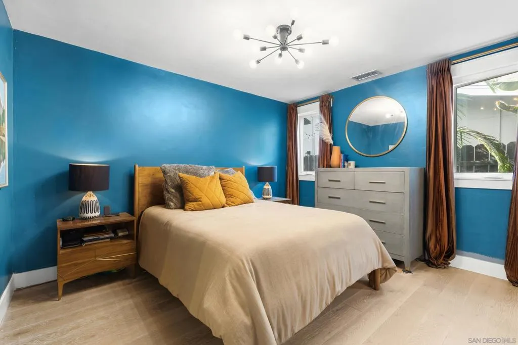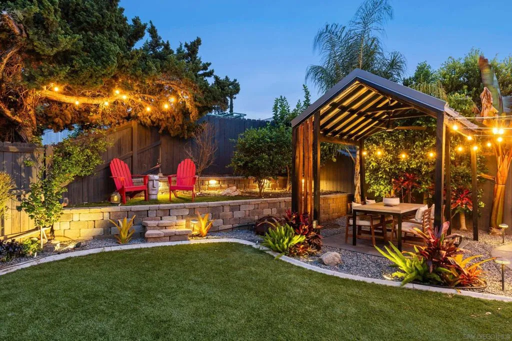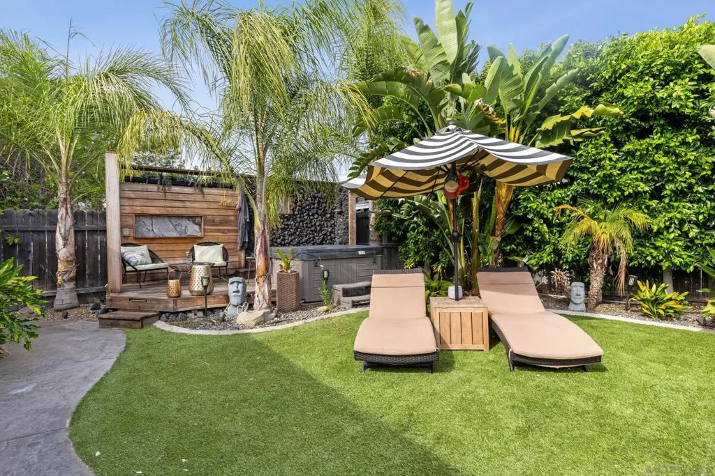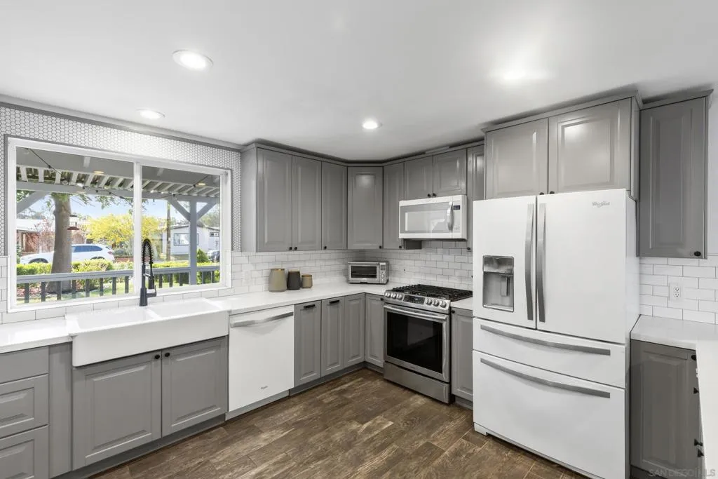 Gorgeous single level home in the heart of Poway, located within the award winning Poway Unified School District with OWNED solar. This light and bright open concept floor plan is filled with beautiful modern finishes throughout. The dream kitchen features quartz countertops, a farmhouse sink, chic gray cabinetry, designer tile backsplash, and updated appliances, all opening to a spacious great room with an electric fireplace, perfect for everyday living and entertaining. The kitchen overlooks a charming covered front porch, while the entry welcomes you with soaring ceilings and abundant natural light. Both bathrooms have been beautifully remodeled with custom tile work, newer vanities, and updated light fixtures. Additional interior upgrades include wood look tile flooring, recessed lighting, stylish fixtures, energy efficient windows, air conditioning, a wireless thermostat, added insulation, a newer roof, and an upgraded electrical panel. The exterior has been thoughtfully enhanced with updated siding, extensive hardscaping, walkways, and driveway improvements, along with an inviting front porch. French doors lead to a private backyard retreat featuring turf, a stunning pergola, decking, private spa, paver style retaining walls, lush landscaping, and large side yards offering extra space. The yard provides exceptional privacy and beautiful evening lighting for outdoor enjoyment. Additional highlights include approximately 600 square feet of attic space, approximately 400 square feet of garage attic space, and a side yard storage unit. The finished 2 car garage is thoughtfully designed with updated cabinetry, a work area, beverage cooler, and movie screen. Ideally located in Poway just a short distance to restaurants, shopping, parks, and hiking trails. Conveniently located within walking distance to Garden Road Elementary School, this move in ready home truly has it all. No HOA fees or Mello Roos. Welcome home!
