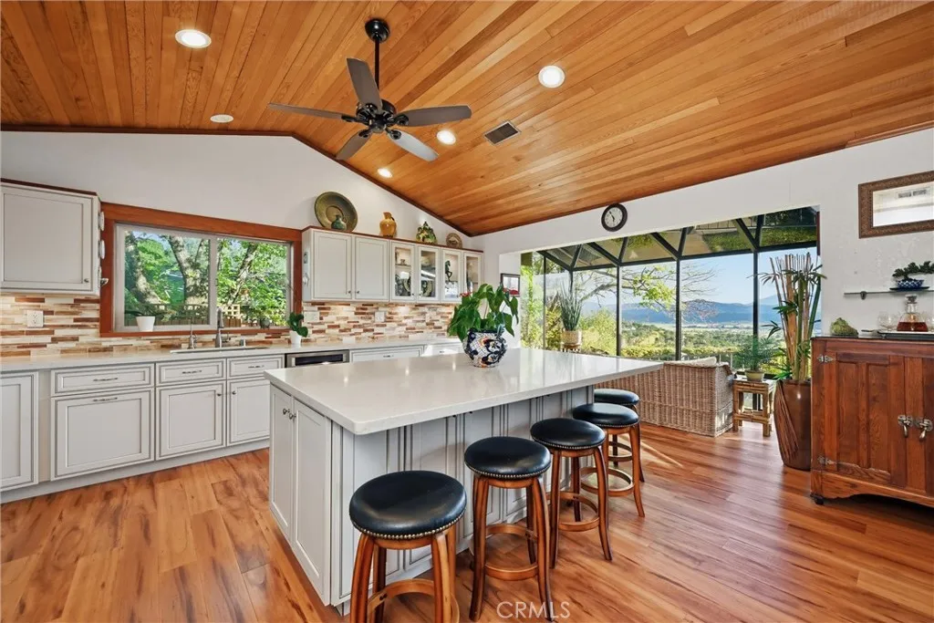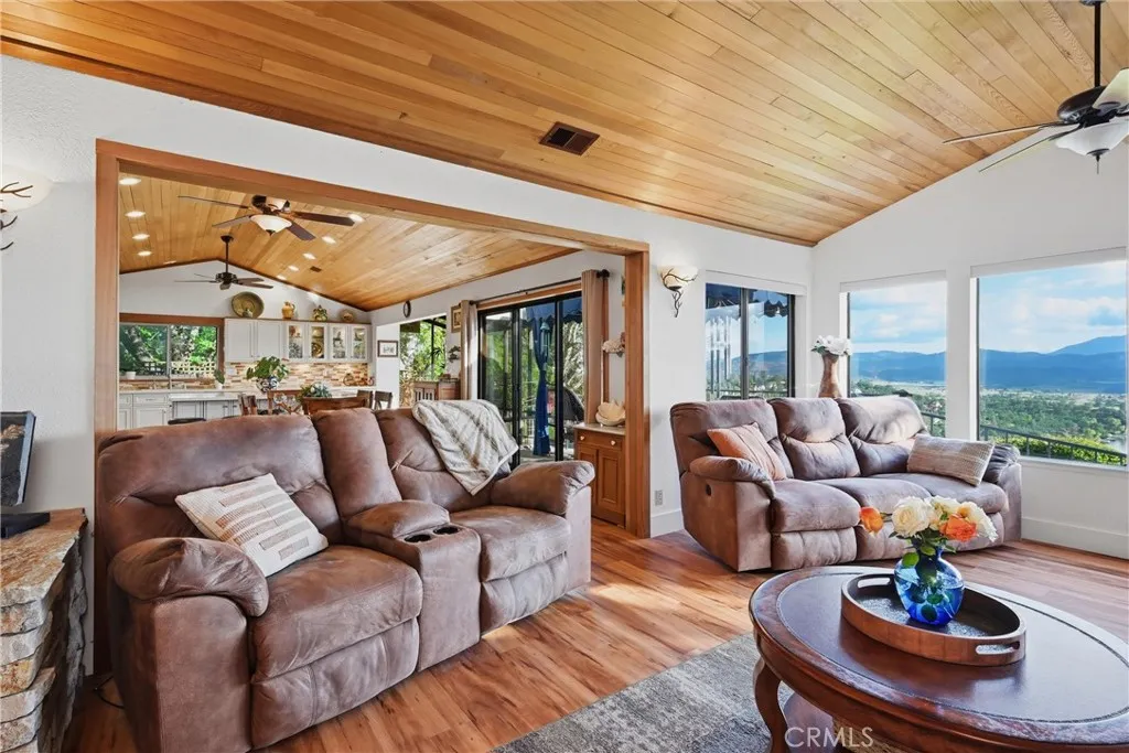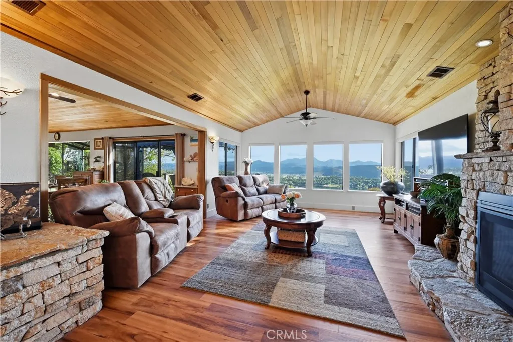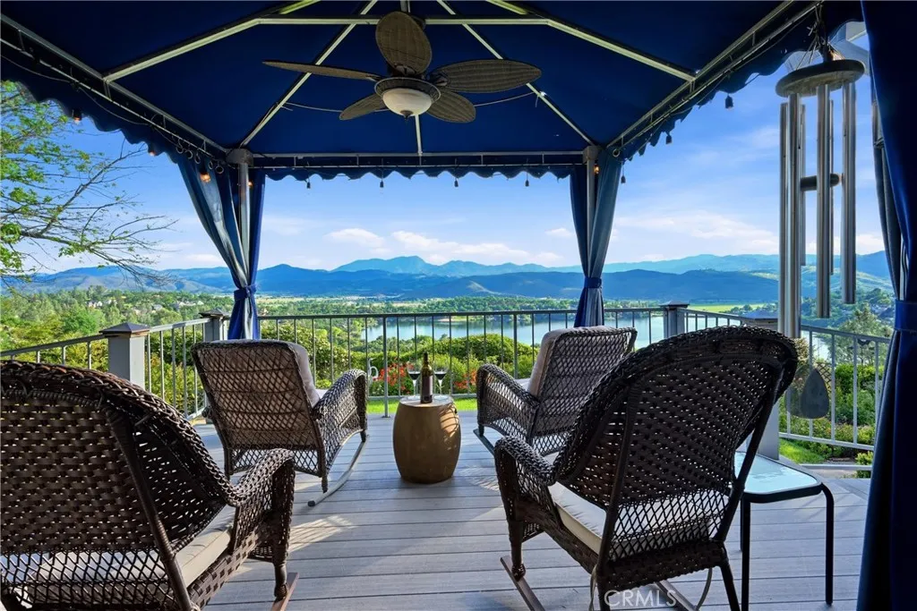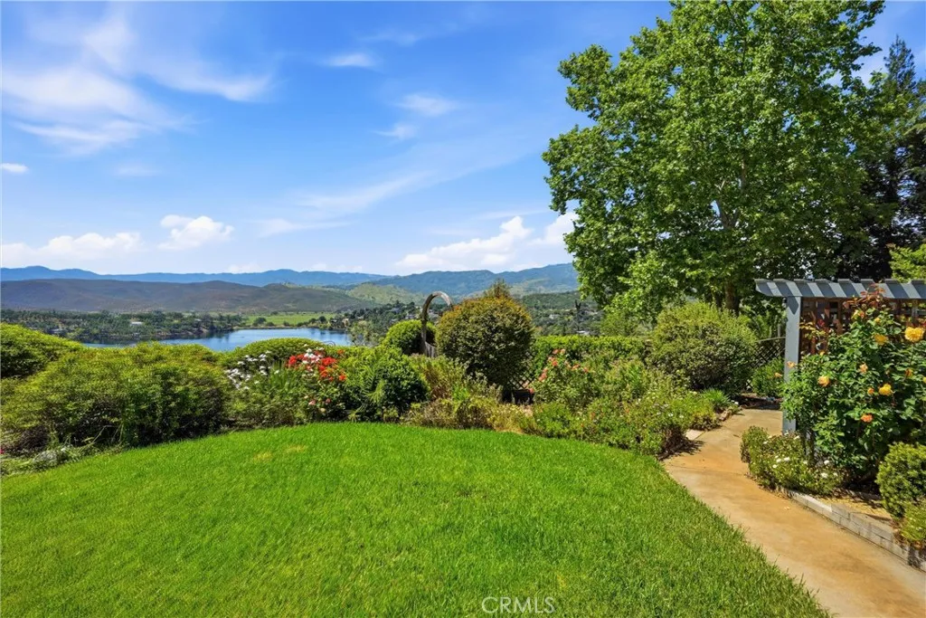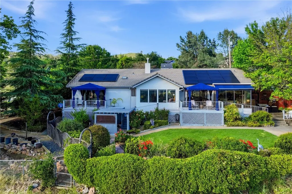 Experience quintessential California living with sweeping, million-dollar views. Set on over 1.2 acres, this beautifully remodeled residence offers a rare blend of privacy, comfort, and understated luxury. Step through the gated entry into a serene front courtyard, where mature landscaping and meandering pathways create a warm and inviting arrival. Inside, a sense of understated luxury meets comfortable, livable design. Expansive picture windows stretch along the rear of the home, framing breathtaking views of the lake, valley, and surrounding mountains—an ever-changing backdrop that defines daily living here. Vaulted ceilings with inlaid clear, hard redwood tongue-and-groove detailing add warmth and architectural character, while a stacked stone gas fireplace anchors the living space. The dream kitchen pairs function with craftsmanship, featuring custom tile work that echoes the rich wood tones above, luxurious, upgraded cabinetry with abundant storage, and premium stainless steel appliances including a double oven, 5-burner cooktop with hood, and reverse osmosis drinking water at the sink. Just beyond, a light-filled sunroom invites year-round enjoyment—an ideal place for morning coffee or quiet evenings, all while taking in the view. The home offers comfortable living spaces with three ample-sized bedrooms, including a well-appointed primary suite designed as a private retreat. Vaulted ceilings, a large triple-wide slider to capture the views, and direct access to a private deck create a seamless indoor-outdoor connection. The remodeled primary bath features large-format tile, dual sinks, upgraded fixtures, a private water closet, and a walk-in closet. Outdoors, the grounds unfold like a private garden retreat. Winding paths lead to multiple seating and patio areas, a covered BBQ space, lush lawn area, and thoughtfully curated plantings including rose and herb gardens, fruit trees, and raised beds. A tranquil redwood grove adds a sense of place and permanence, offering both shade and natural beauty. Plenty of level parking spaces including parking for a boat or RV. Extensive upgrades enhance both efficiency and ease of living, including owned solar, a lifetime tile roof, newer HVAC system, whole house fan, motorized retractable awnings, deer-proof fencing and composite decking. This is more than a home—it’s an invitation to slow down, take in the views, and enjoy a lifestyle defined by beauty, comfort, and connection to the land.