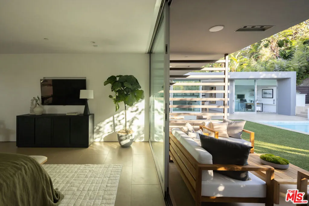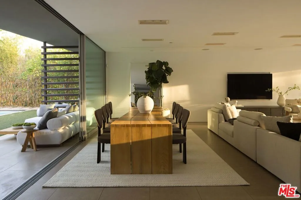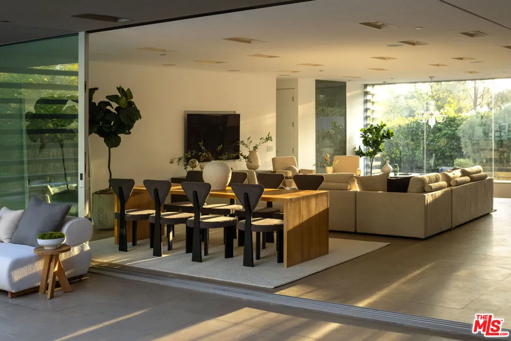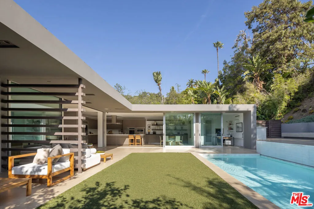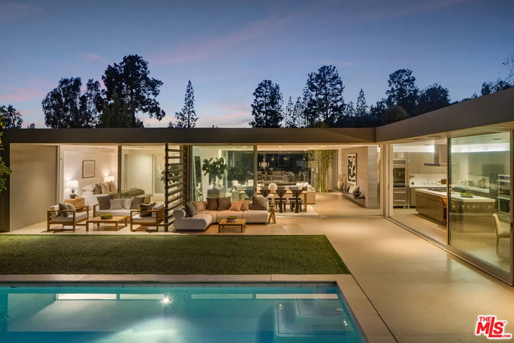 Beyond private gates and an extended motor court, this contemporary architectural by renowned architect Shubin & Donaldson, offers privacy, scale, and seamless indoor-outdoor living just moments from the best of Beverly Hills and Century City. Clean lines, rich wood detailing, and warm interiors are framed by walls of glass that draw natural light deep into the home. The open floorplan is both expansive and intentional, allowing each space to transition naturally into the next. A generously scaled formal living room is anchored by a sunken sitting lounge, while the adjacent dining room flows effortlessly into the kitchen and opens to the outdoors for easy entertaining. The chef-caliber kitchen is centered around an eat-in island and appointed with streamlined cabinetry, professional-grade appliances, and a breakfast nook overlooking the grounds. Just beyond, an office with a full bath offers flexibility as a private studio, guest retreat, or executive workspace. The primary suite opens to a private outdoor lounge deck and features a large walk-in closet with extensive built-ins, along with a marble-clad ensuite bath complete with a dual-sink vanity, soaking tub, and separate shower. Additional guest suites are well-proportioned and thoughtfully positioned for comfort.The backyard is designed for year-round enjoyment, featuring a flat grassy lawn bordered by mature landscaping, multiple lounge areas positioned for sun and shade, a fire pit for evening gatherings, and a dedicated barbecue area. An elevated sundeck overlooks the pool, creating a layered outdoor setting suited for both entertaining and quiet retreat. Combining architectural clarity with a highly functional layout, this residence offers comfort and convenience in one of the city's most desirable neighborhoods, moments from the premier dining, shopping, and cultural destinations of Beverly Hills and Century City.
