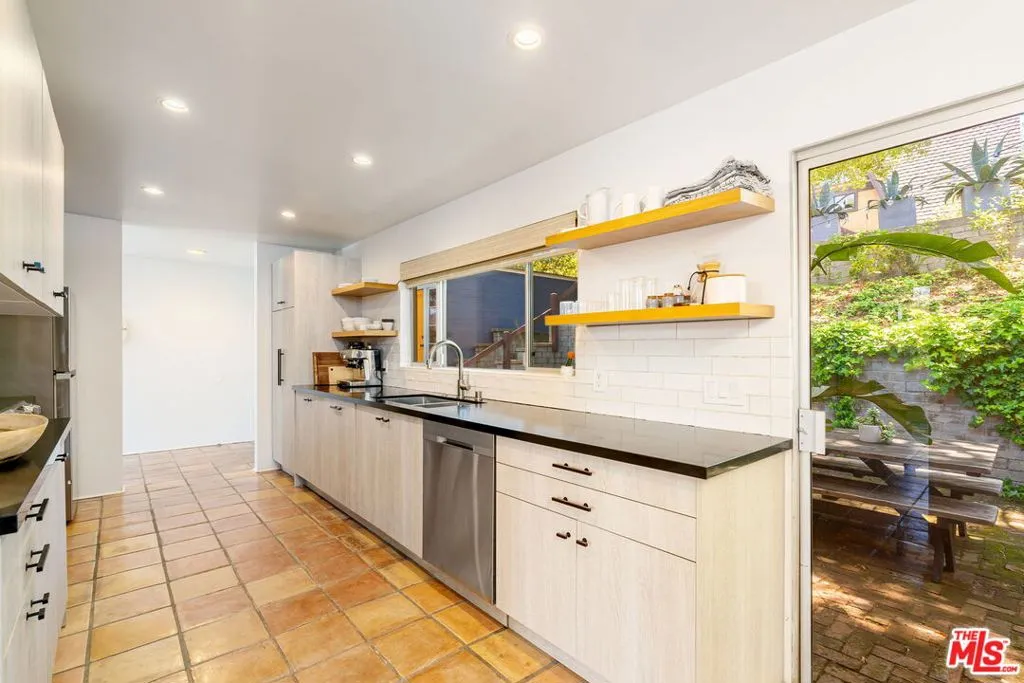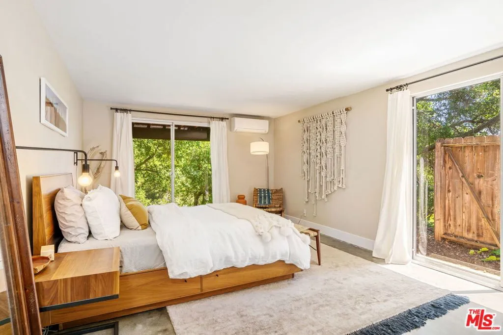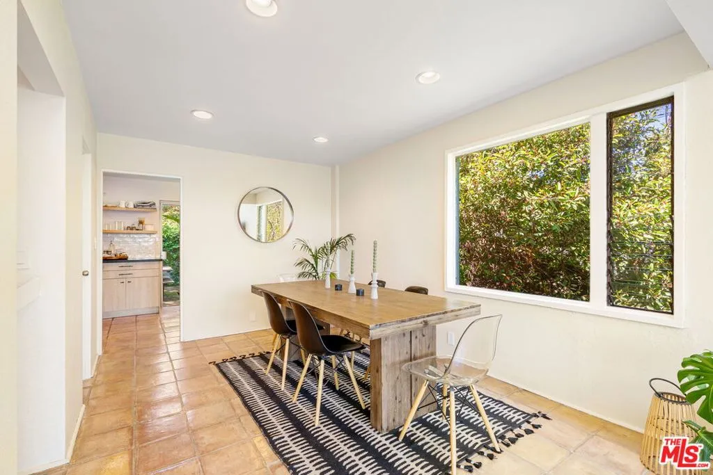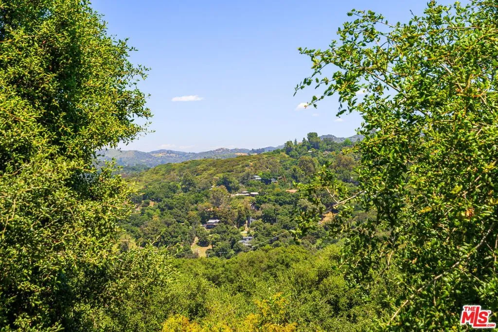 Tucked away in the serene Topanga Mountains, this 2-bedroom, 2-bathroom home offers a peaceful retreat with stunning views. The interior boasts an oversized living room with pitched wood-beam ceilings, a cozy fireplace, a bar area, and an impressive wall of glass windows and doors that open to an expansive deck overlooking verdant treetops, canyons, and hills beyond. The dining room flows into a modern chef's kitchen equipped with stainless steel appliances, a subway tile backsplash, exposed shelving, ample cabinet space, and a breakfast area. The primary bedroom is a haven of relaxation with a walk-in closet and glass doors showcasing serene views of mature trees. The modern primary bathroom features a soaking tub, separate glass shower, and dual-sink vanity. Additional highlights include a spacious guest bedroom, polished concrete and Saltillo tile flooring, an abundance of windows and natural light, and a tiered backyard with two different outdoor spaces. A peaceful escape from the hustle and bustle of city life, yet close to everything Los Angeles has to offer, don't miss the opportunity to call this Topanga Canyon sanctuary your own.