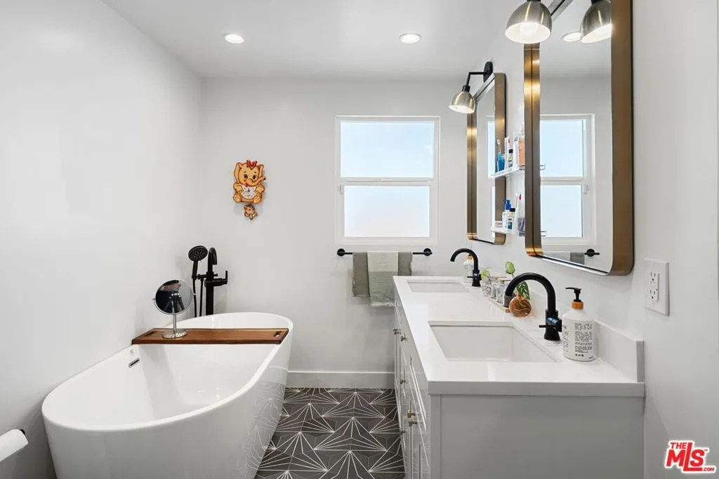 Located in the coveted Don streets in Baldwin Hills Estates, this light filled 3 bedroom, 2 bathroom home welcomes you with sweeping views of the Hollywood Sign, Griffith Observatory, and the iconic downtown skyline. Soaring ceilings and a bright, open floorplan create a sense of peaceful spaciousness, beautifully accented by natural oak wood flooring. The updated kitchen is a dream for both cooking and entertaining, featuring stainless steel appliances, custom shaker cabinetry, Delta fixtures, and crisp white quartz countertops. The layout flows seamlessly into a private backyard oasis, accessible from the kitchen, guest, and primary bedrooms. Designed for true indoor/outdoor living, the backyard offers a beautiful teak deck, a large flat turf lawn, and a terraced garden, perfect for hosting outdoor get togethers with the built in BBQ, working out, relaxing in the sun, or simply enjoying the serene surroundings. The resort style primary suite boasts a pitched wood ceiling, walk-in closet, updated en suite with stylish cement tile, and dual sliding glass doors that open directly to the backyard retreat. The oversized 2.5 car garage includes an extra storage area and offers plenty of room for multiple vehicles, a home gym, workshop, or office. Baldwin Hills Estates is one of L.A.'s most desirable neighborhoods, known for its warm community feel, dramatic hilltop views, and unbeatable central location, just minutes from Culver City, SoFi Stadium, dining, shopping, and entertainment. This is a rare opportunity to own a move-in ready home that offers resort style living, exceptional privacy, and a true connection to the best of Los Angeles.