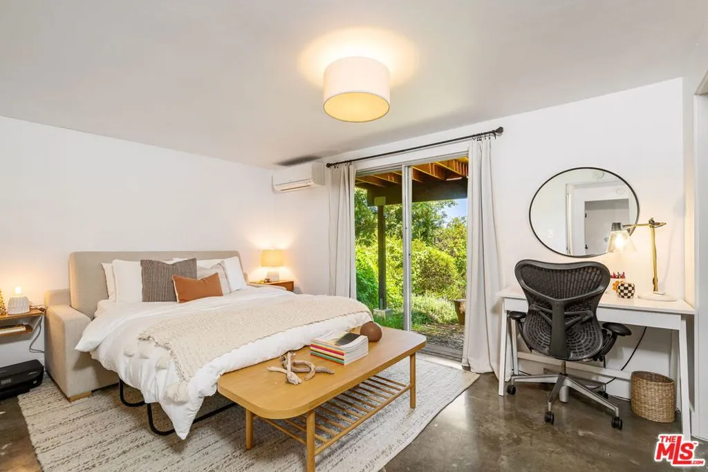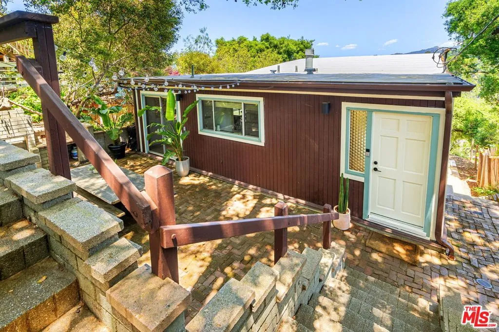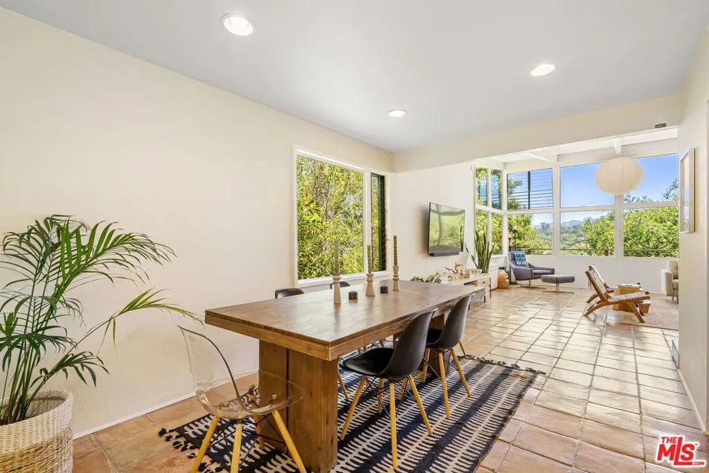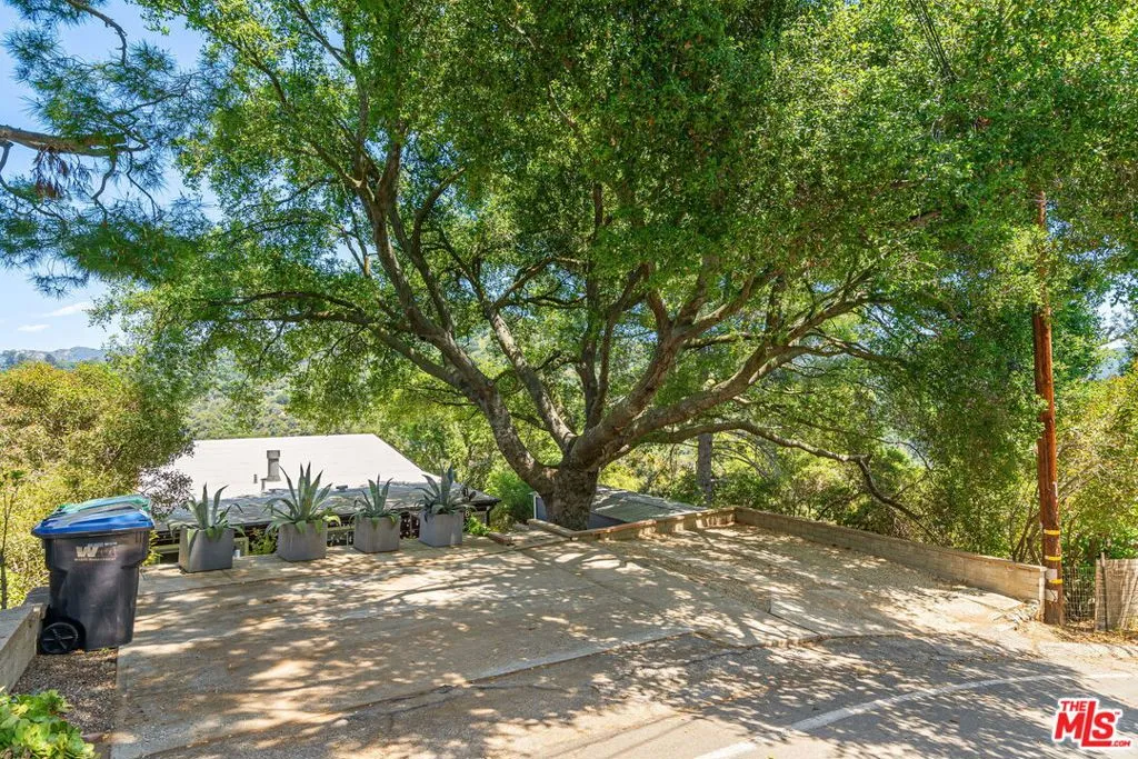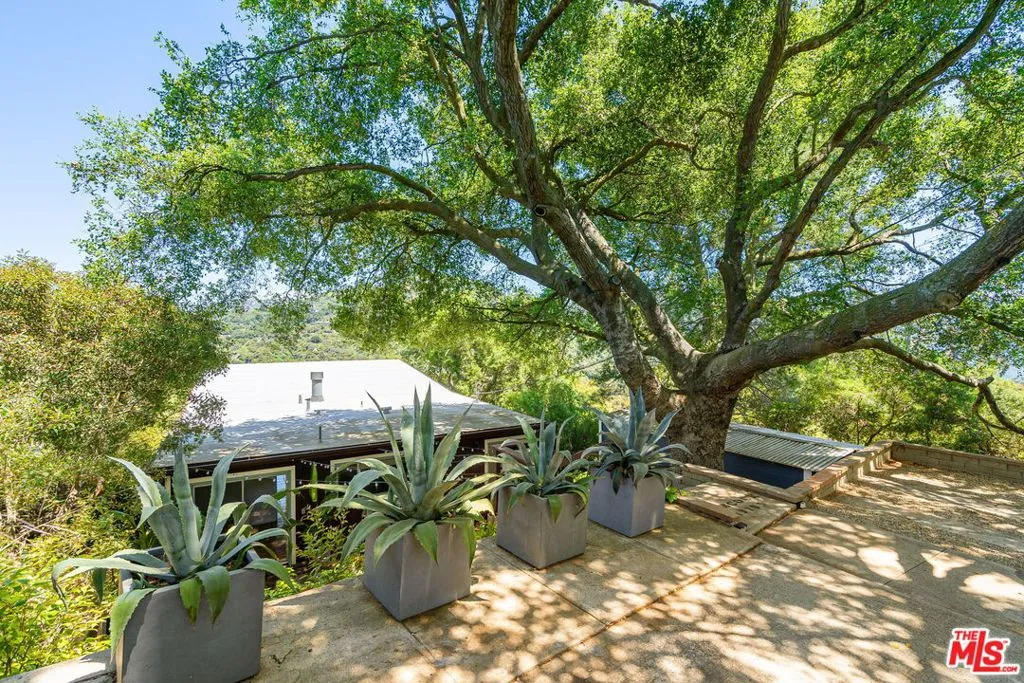 Tucked away in the serene Topanga Mountains, this 2-bedroom, 2-bathroom home offers a peaceful retreat with stunning views. The interior boasts an oversized living room with pitched wood-beam ceilings, a cozy fireplace, a bar area, and an impressive wall of glass windows and doors that open to an expansive deck overlooking verdant treetops, canyons, and hills beyond. The dining room flows into a modern chef's kitchen equipped with stainless steel appliances, a subway tile backsplash, exposed shelving, ample cabinet space, and a breakfast area. The primary bedroom is a haven of relaxation with a walk-in closet and glass doors showcasing serene views of mature trees. The modern primary bathroom features a soaking tub, separate glass shower, and dual-sink vanity. Additional highlights include a spacious guest bedroom, polished concrete and Saltillo tile flooring, an abundance of windows and natural light, and a tiered backyard with two different outdoor spaces. A peaceful escape from the hustle and bustle of city life, yet close to everything Los Angeles has to offer, don't miss the opportunity to call this Topanga Canyon sanctuary your own.