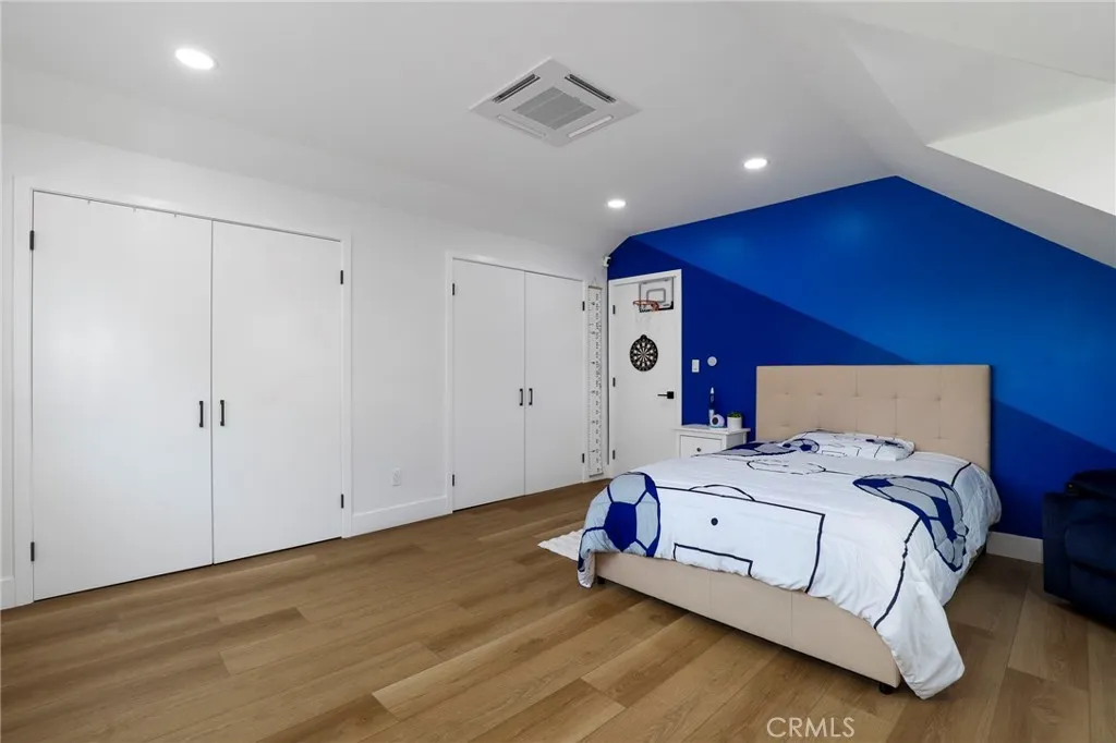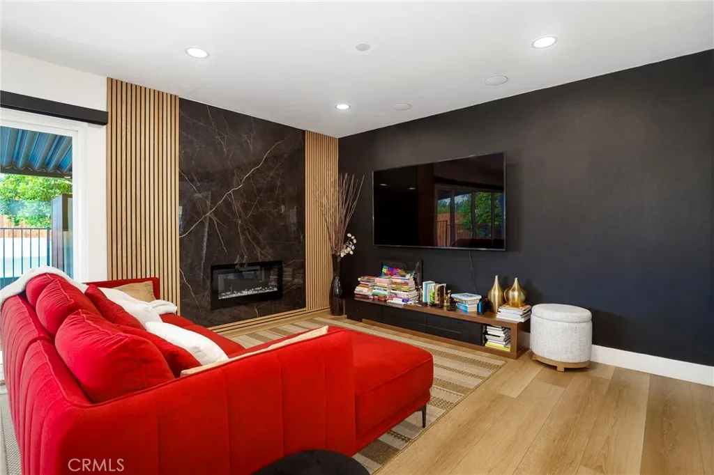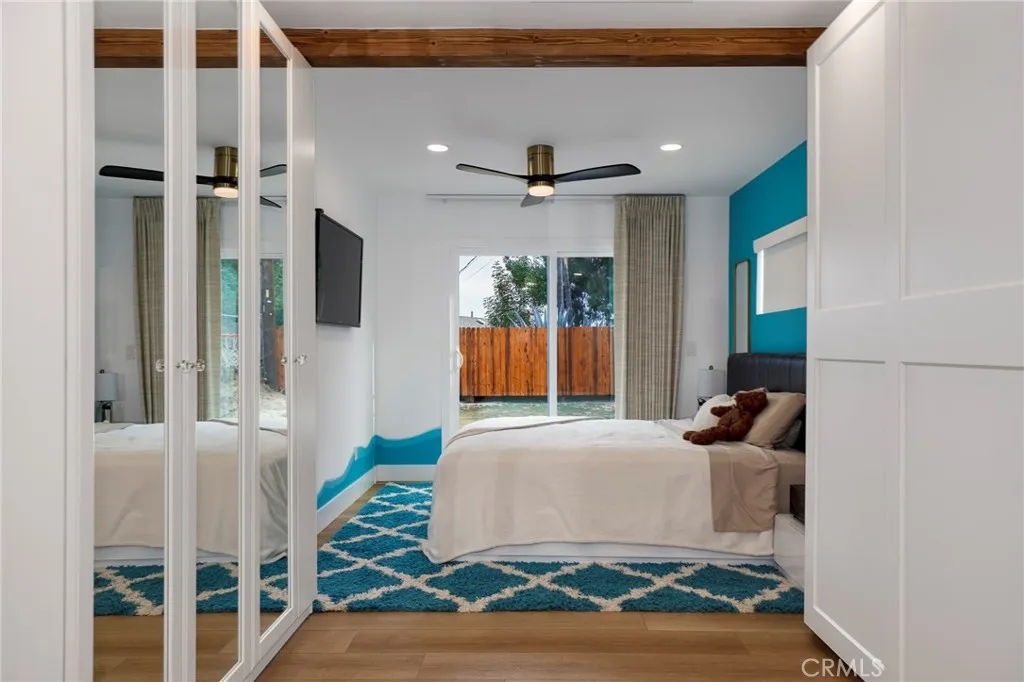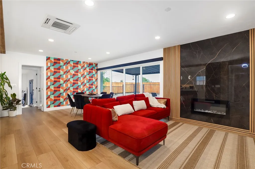 Fully remodeled 4-bedroom, 3-bath home in desirable Granada Hills, completed in early 2024 with over $400K in documented improvements. Renovation taken down to the studs with major system upgrades including new electrical, plumbing, HVAC system with individual room thermostats, and tankless water heater. All new doors, windows, and high-end finishes throughout. Open-concept living area features a dramatic oversized sliding glass door leading to a private backyard with pool, creating seamless indoor-outdoor living. Chef's kitchen includes top-of-the-line appliances and modern design elements. Spacious primary suite (expanded from original layout) offers custom closets and a luxurious en-suite bath with dual vanities, oversized double shower, and premium smart toilet with bidet features. Additional upgrades include built-in ceiling sound system, powered window shades with remote and mobile controls, and EV charging capability. Garage has been converted to additional living space and is attached to the main residence, offering flexible use with a separate entrance and interior access. Space can function as part of the main home or be closed off for added privacy and used as an ADU. Buyer to verify all permits, square footage, and intended use. Public records reflect approximately 1,765 sq ft, but the property measures approximately 2,700+/- sq ft. Turnkey property with extensive upgrades, offering flexibility and modern living.