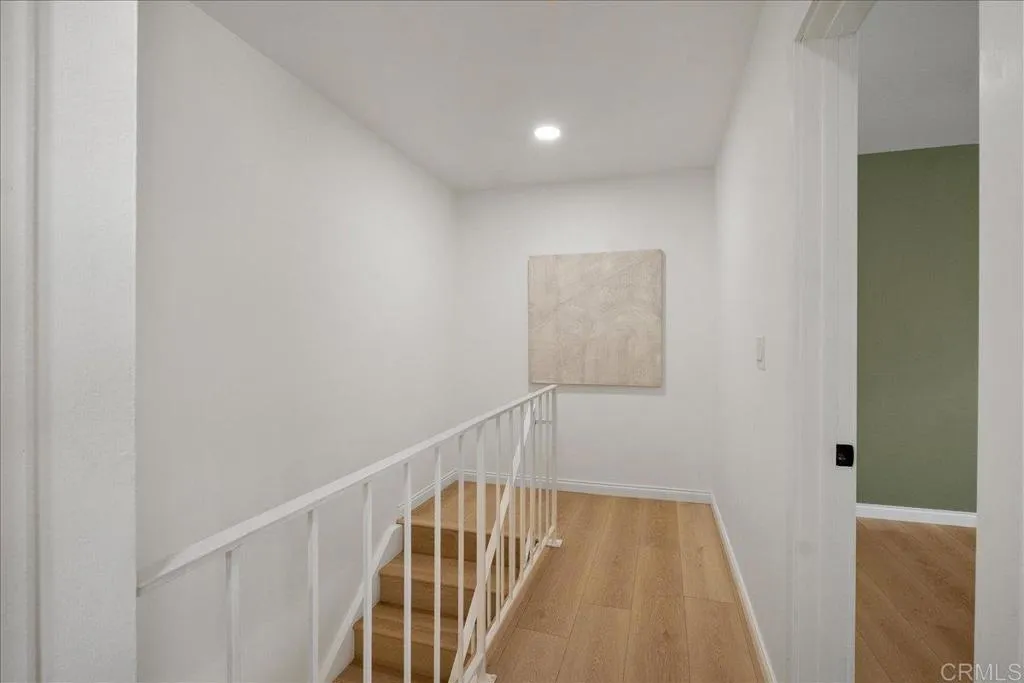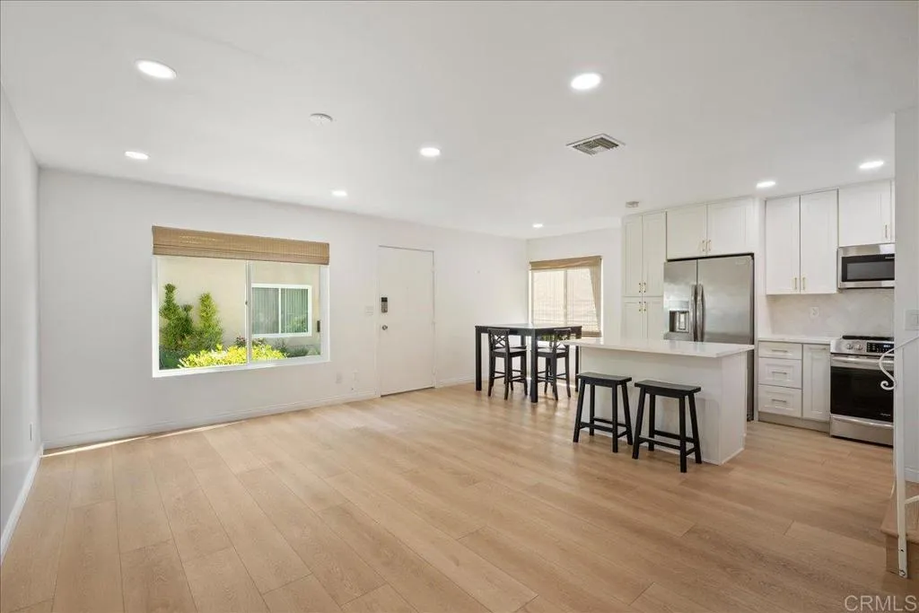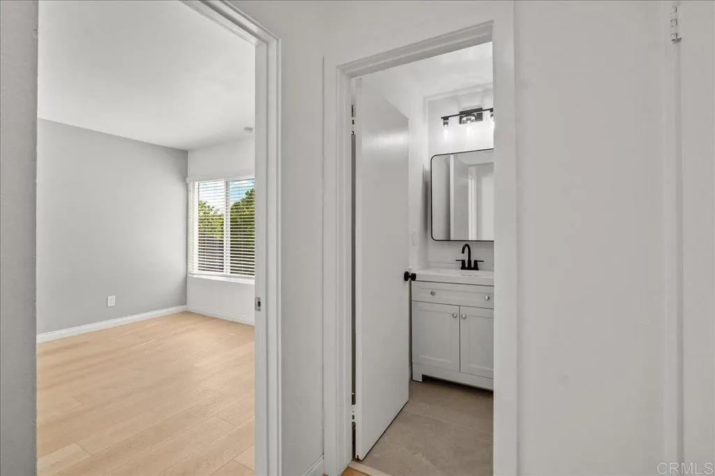 Tucked within a quiet, tree-lined, park-like setting, this beautifully remodeled end-unit condominium offers the feel and functionality of a townhome. With no unit above and all bedrooms thoughtfully located on the second level, the floor plan provides both privacy and a natural sense of flow. The main living area features a bright, open-concept design, seamlessly connecting the kitchen, dining, and living spaces. The remodeled kitchen is appointed with crisp white cabinetry, quartz countertops, and updated lighting, creating a clean, modern aesthetic. The bathroom has been tastefully upgraded with designer tile and contemporary finishes, resulting in a cohesive, move-in-ready interior. A significant recent improvement includes a brand new HVAC system with a 2-ton air conditioning unit installed in July 2025, providing efficient performance and immediate cooling throughout the home. Abundant natural light enhances the interior, while the surrounding greenery offers a peaceful, retreat-like environment. Ideally positioned within one of the quieter areas of the community, the home benefits from both privacy and tranquility. Additional features include a shared garage, community laundry, and ample nearby parking. The property is conveniently located approximately 8 miles from Torrey Pines State Beach and is served by the highly regarded Poway Unified School District. This residence presents an excellent opportunity for first-time buyers or investors seeking a well-located, thoughtfully updated home in a desirable San Diego neighborhood.