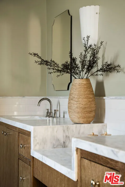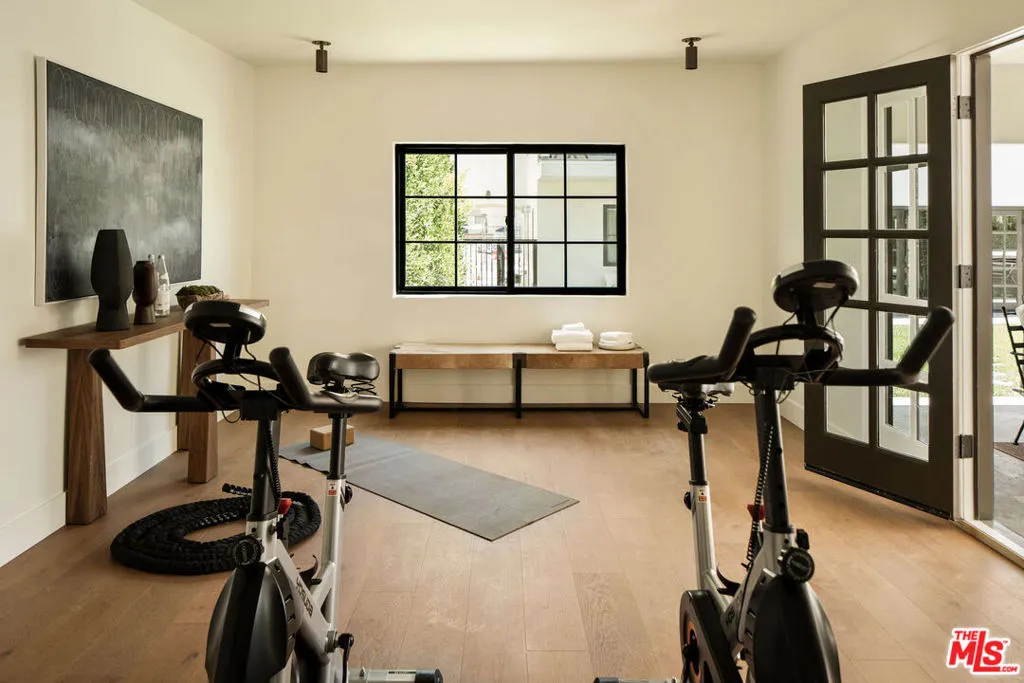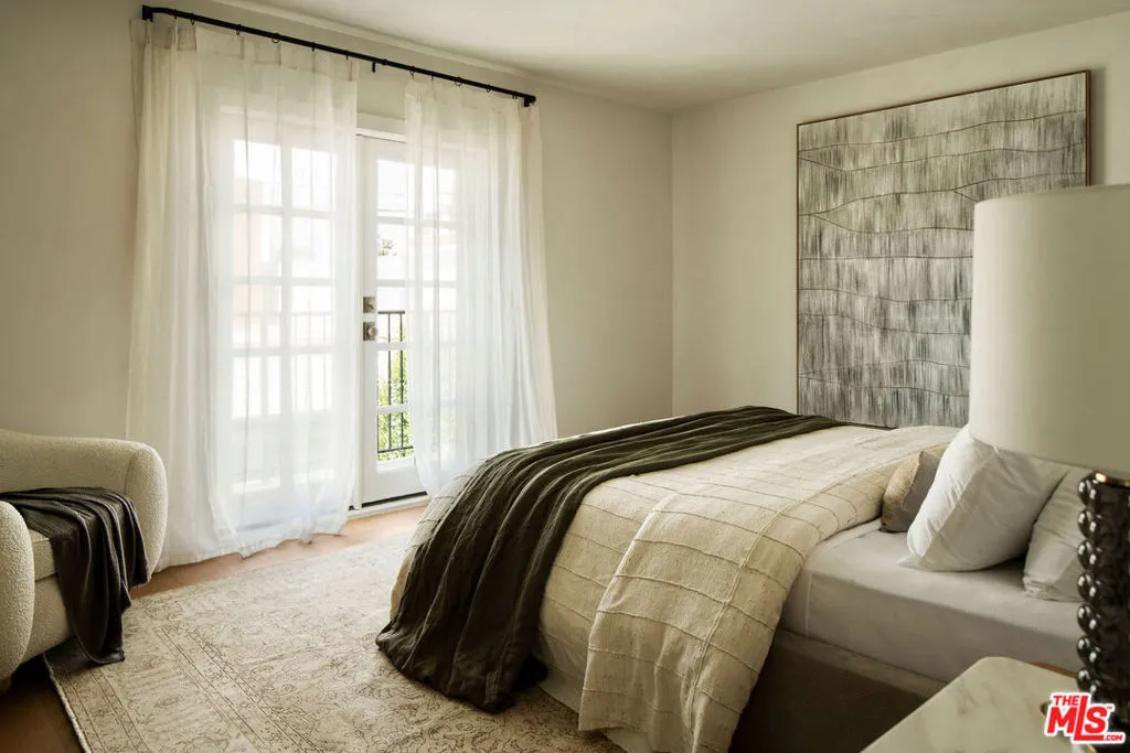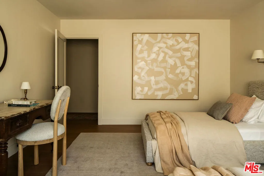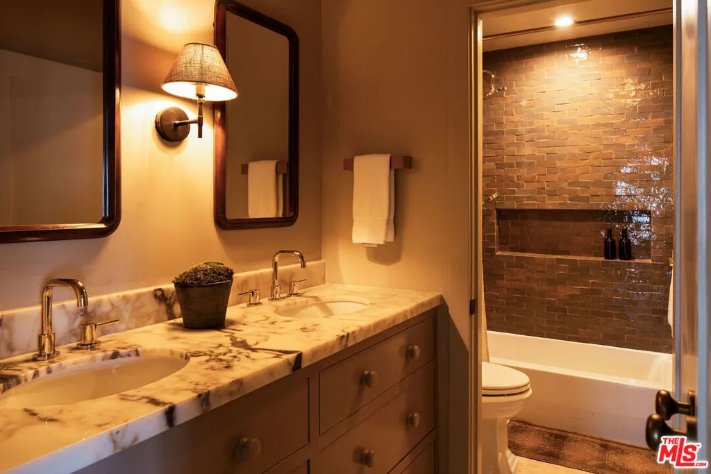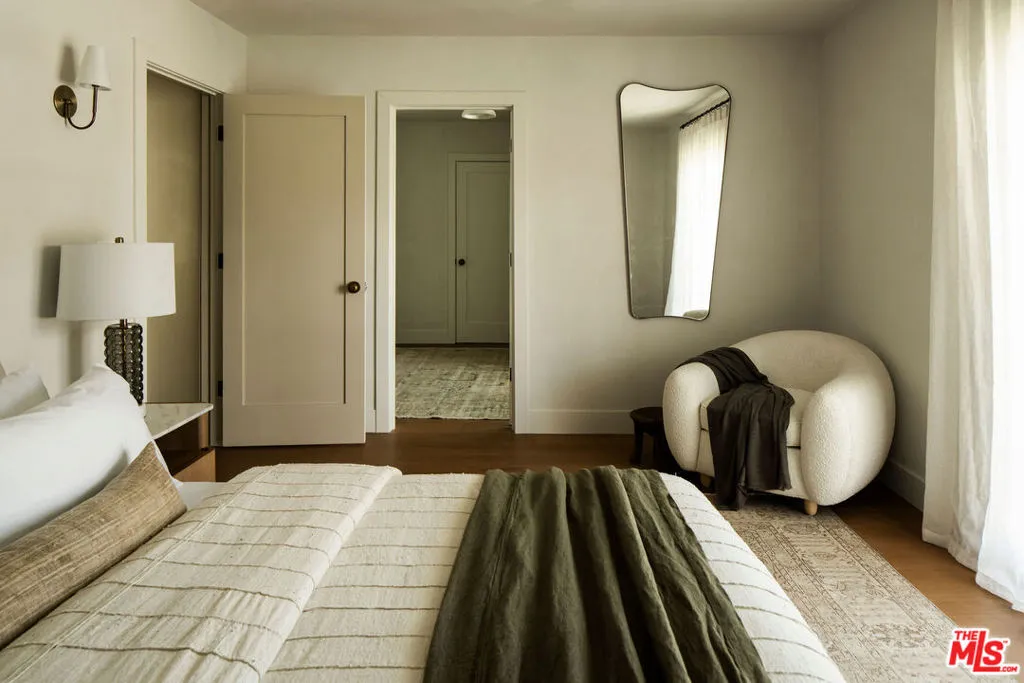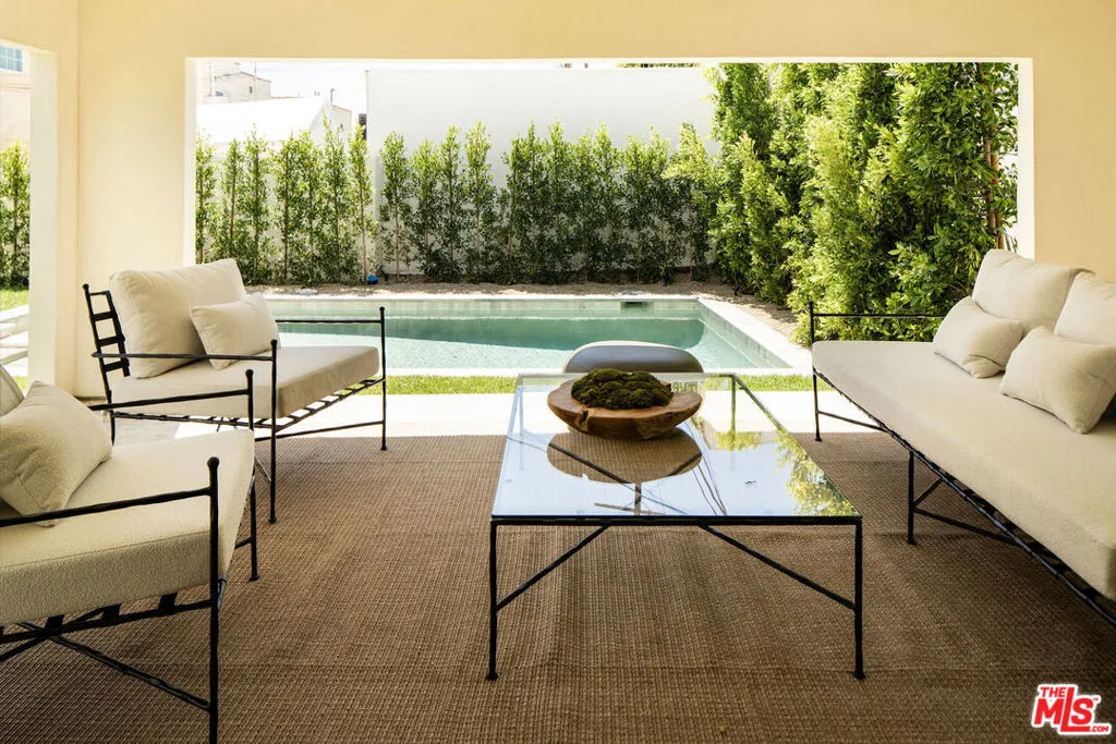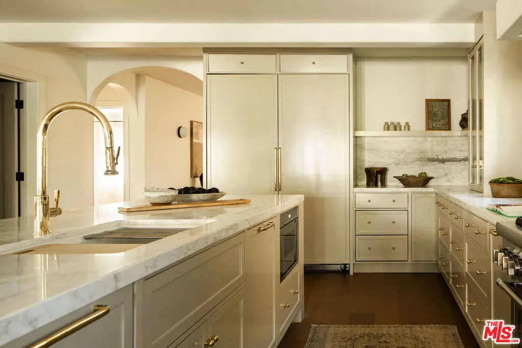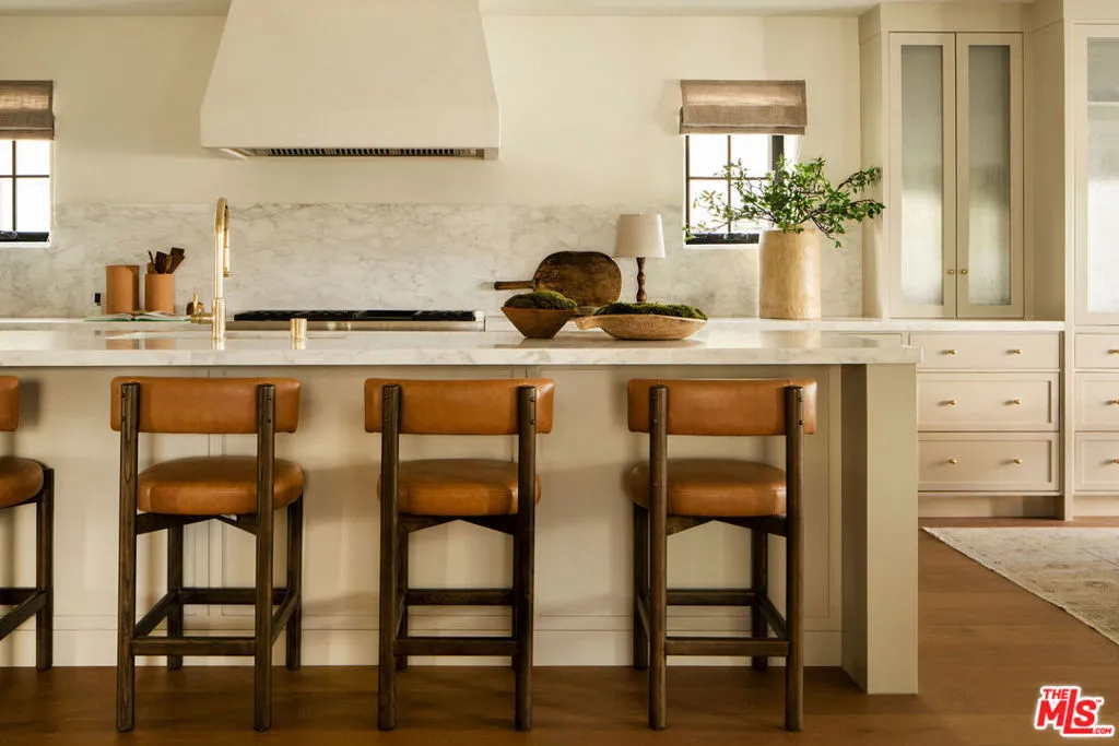 The curb appeal of this newly renovated Spanish home in Sycamore Square sets an exceptional first impressionand the rest of the property more than delivers. Thoughtfully reimagined by Jaime Morse of Morse Design at a level of fine luxury, every detail has been carefully curated. The exterior showcases smooth stucco, refined drought-tolerant landscaping, travertine pavers, and elegant landscape lighting, all anchored by a striking sixty-year-old olive tree evoking the charm of a Mediterranean retreat. Multiple gated entry points provide both privacy and a sense of exclusivity.Inside, an expansive foyer welcomes you with an elegant curved staircase, a stunning powder room finished in lime-washed paint, and a seamless open floor plan that flows through the spacious main level. Hennessy white oak floors run throughout, complemented by custom, hand-selected lighting fixtures sourced from around the world.The nearly 40-foot-long kitchen is a true centerpiece, appointed with Sub-Zero, Thermador, and JennAir appliances. Brass hardware and warm paint tones pair beautifully with Calacatta Caldia marble countertops and backsplash. A dramatic center island, measuring over 13 feet, offers ample space for both food preparation and dining. The kitchen opens to a generous living room, where a fireplace serves as the focal point, and soft afternoon light pours through west-facing French doors and windows. This five-bedroom home features four bedrooms upstairs, each enhanced with custom fixtures and built-in closets. The primary suite is a private retreat, featuring Portola lime-wash paint, a walk-in closet, and a spacious bathroom with Aero Cream marble shower tile. An upstairs family room provides additional space for relaxation or play.The reimagined backyard is designed for both entertaining and tranquility, featuring a heated pool and spa, lush grass, and tall ficus trees for privacy. A well-appointed pool house includes a covered open-air lounge area, along with an enclosed space ideal for a gym or art studio.This exceptional renovation offers a refined living experience that will appeal to the most discerning buyer.The permitted Pool House/Rec Room at 579 square feet is in addition to the square footage of the main house at 4,400 square feet per plans. Includes enclosed and covered space.