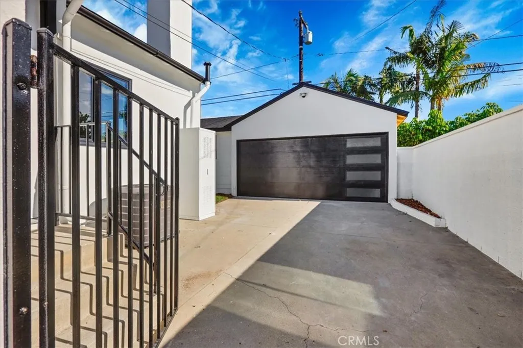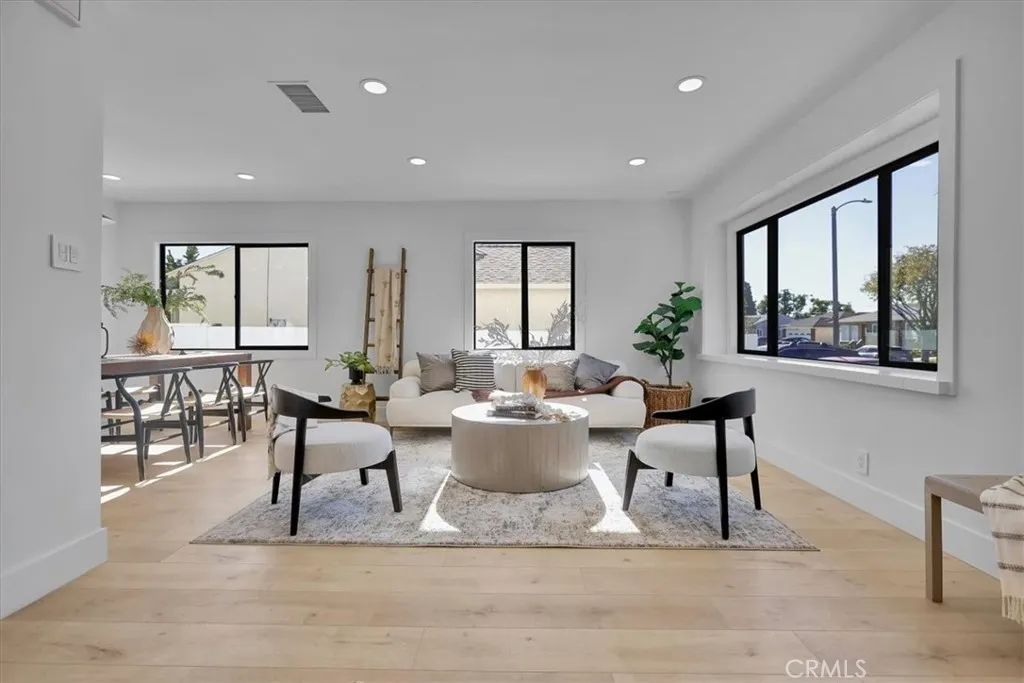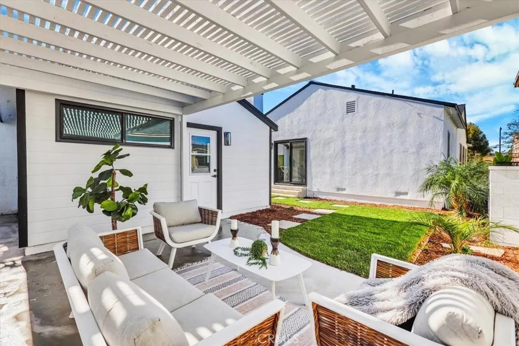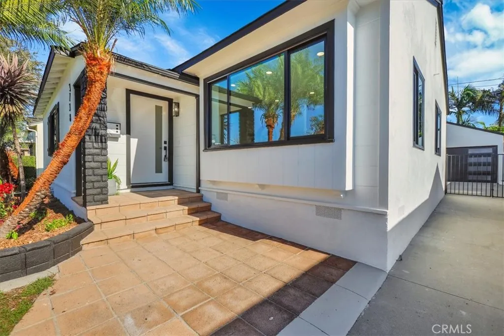 Situated on a quiet street in Long Beach, this fully remodeled home offers a functional layout with modern updates throughout. A single long driveway leads to a gated, detached two-car garage. The property features new exterior paint with black trim, manicured lawn with updated landscaping, a new front door, and an inviting front porch. Inside, the home showcases new flooring, fresh interior paint, new windows, and recessed lighting. Upon entry, the home opens to a formal living room that flows seamlessly into a formal dining area, both enhanced by large windows for natural light. The dining space connects directly to the spacious kitchen, which features brand-new appliances, abundant cabinetry, light countertops, and a matching backsplash. A laundry area is located adjacent to the kitchen. A pass-through window from the kitchen overlooks the family room with higher ceilings, a fireplace, a modern chandelier, and sliding glass doors leading to the backyard. The outdoor space has been newly landscaped and includes concrete stepping stones to a covered seating area with lattice detailing. An additional flex room off the garage provides versatile use and offers direct access to the backyard and garage. A hallway off the entry area leads to two well-sized bedrooms with closet space and an updated full bathroom featuring mosaic tile flooring, a remodeled shower, and modern fixtures. The primary bedroom offers ample space, additional closet storage, and an ensuite bathroom with a glass-enclosed shower, marble flooring, dual vanity, and skylight. Both bathrooms include smart toilets. Black fixtures throughout the home complete the modern aesthetic. This turnkey property combines updated finishes, indoor-outdoor flow, and practical living spaces in a desirable Long Beach location