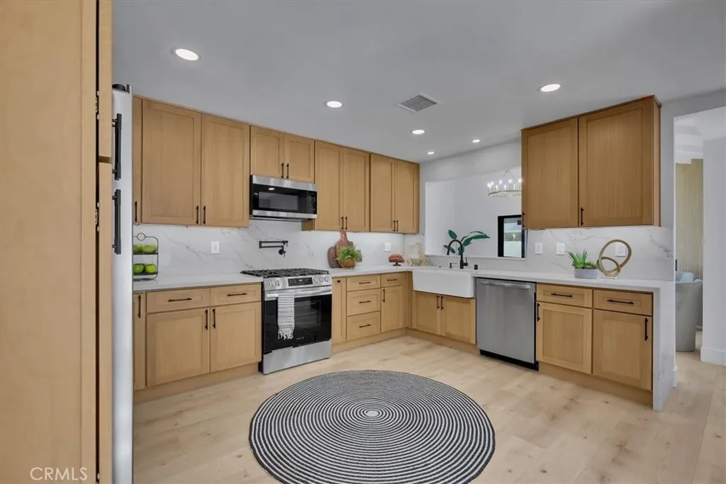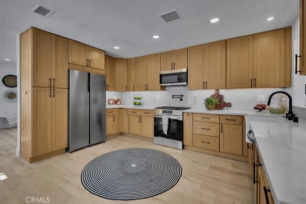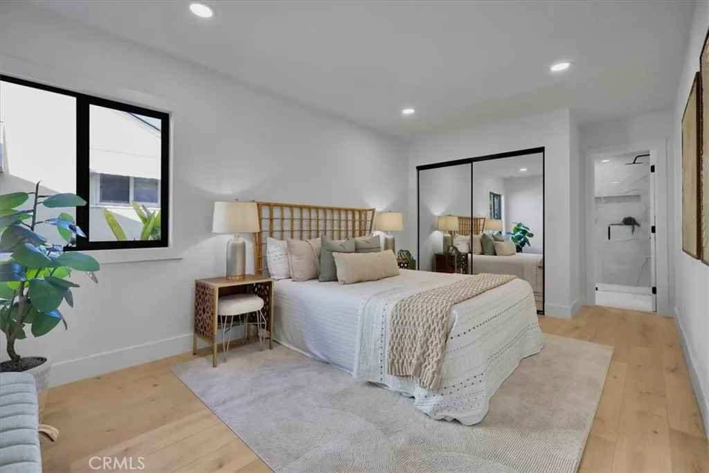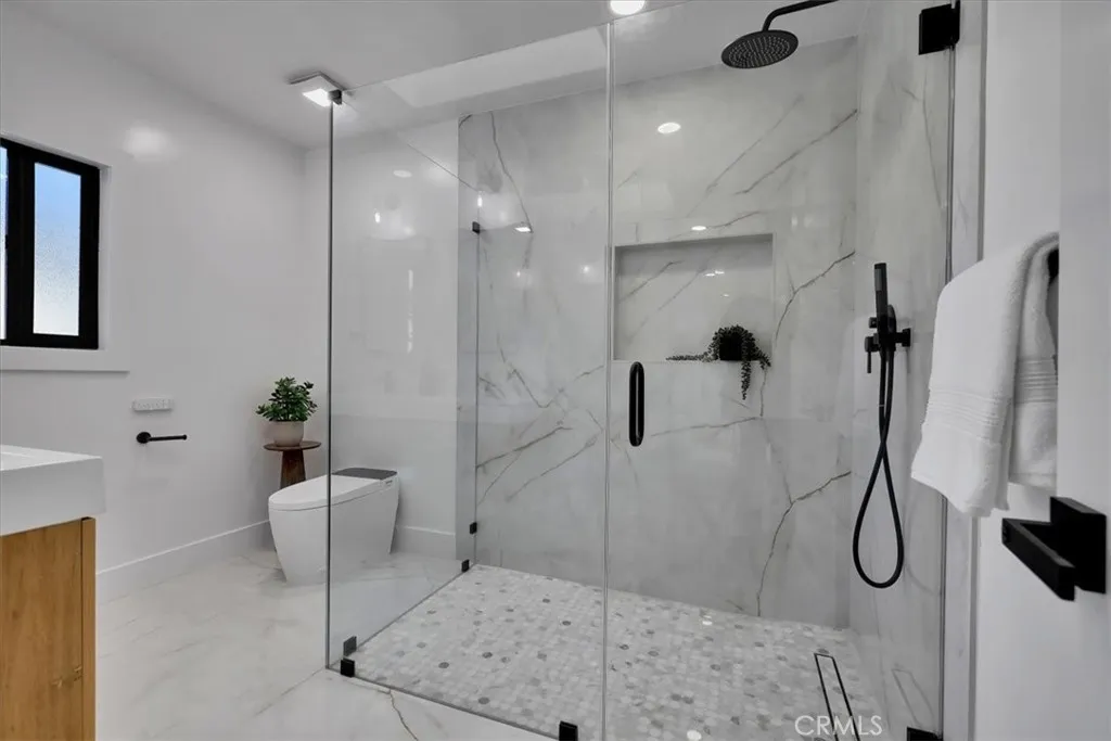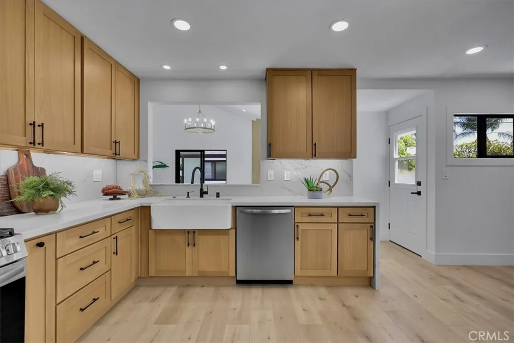 Situated on a quiet street in Long Beach, this fully remodeled home offers a functional layout with modern updates throughout. A single long driveway leads to a gated, detached two-car garage. The property features new exterior paint with black trim, manicured lawn with updated landscaping, a new front door, and an inviting front porch. Inside, the home showcases new flooring, fresh interior paint, new windows, and recessed lighting. Upon entry, the home opens to a formal living room that flows seamlessly into a formal dining area, both enhanced by large windows for natural light. The dining space connects directly to the spacious kitchen, which features brand-new appliances, abundant cabinetry, light countertops, and a matching backsplash. A laundry area is located adjacent to the kitchen. A pass-through window from the kitchen overlooks the family room with higher ceilings, a fireplace, a modern chandelier, and sliding glass doors leading to the backyard. The outdoor space has been newly landscaped and includes concrete stepping stones to a covered seating area with lattice detailing. An additional flex room off the garage provides versatile use and offers direct access to the backyard and garage. A hallway off the entry area leads to two well-sized bedrooms with closet space and an updated full bathroom featuring mosaic tile flooring, a remodeled shower, and modern fixtures. The primary bedroom offers ample space, additional closet storage, and an ensuite bathroom with a glass-enclosed shower, marble flooring, dual vanity, and skylight. Both bathrooms include smart toilets. Black fixtures throughout the home complete the modern aesthetic. This turnkey property combines updated finishes, indoor-outdoor flow, and practical living spaces in a desirable Long Beach location