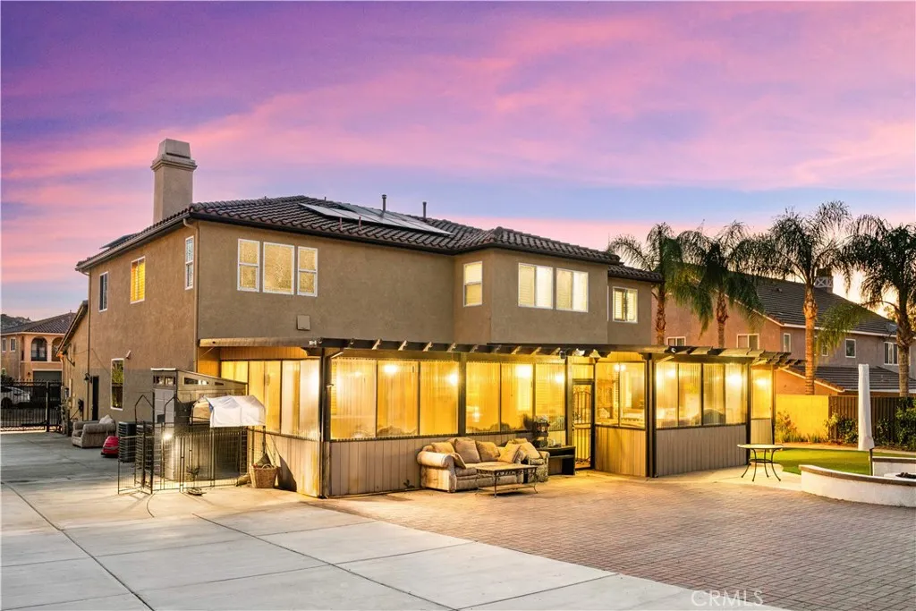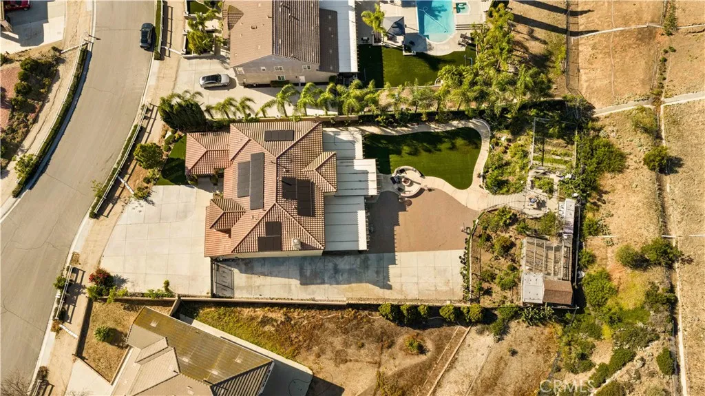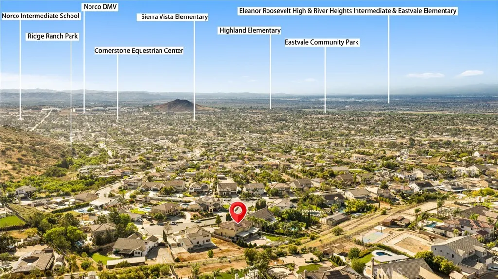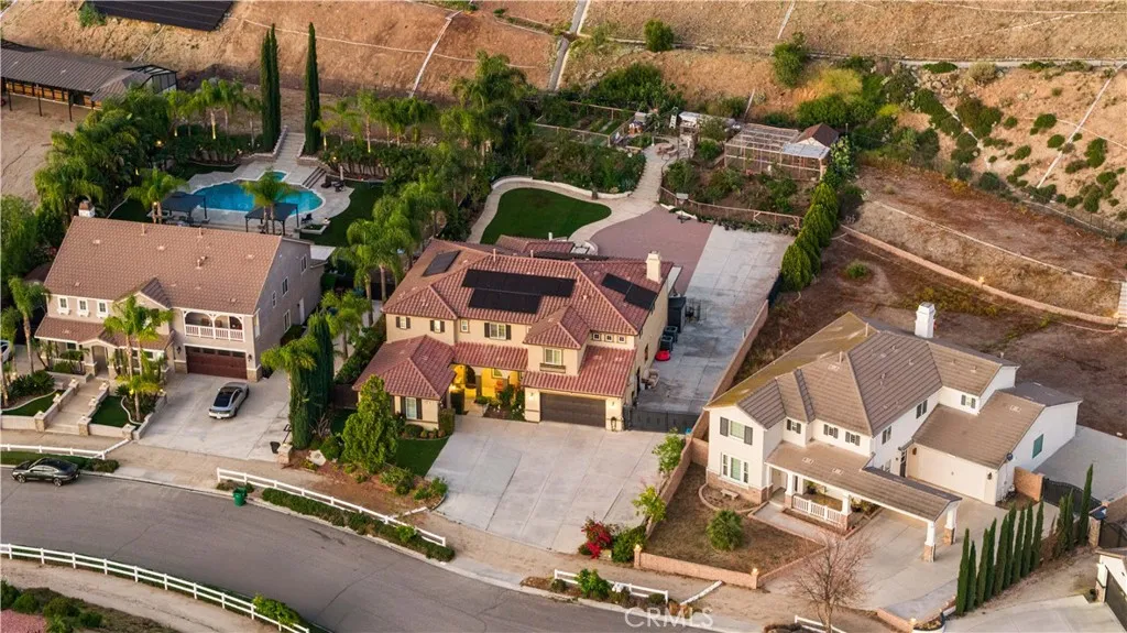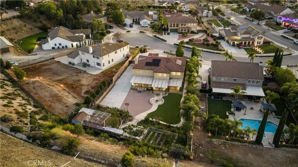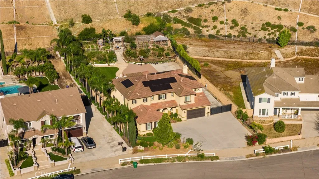 Located in the sought-after Norco Ridge Estates community in Norco, this expansive Plan 5 residence offers approximately 4,749 square feet of well-designed living space on a generous 33,976 square foot lot, with sweeping mountain and neighborhood views that define the Norco Hills setting. The home offers a total of 8 rooms and 8 full bathrooms, providing exceptional flexibility for a variety of living arrangements, including additional bedrooms, home offices, gyms, or creative spaces. A grand entry with a wrought iron staircase leads into formal living and dining areas, accented by dark wood flooring. The kitchen is designed for both everyday use and entertaining, with granite countertops, a large center island, abundant cabinetry, and a full suite of KitchenAid stainless steel appliances, including a 6-burner cooktop, double ovens, warming drawer, and trash compactor. Extending from the spacious family room is a fully enclosed sunroom with a built-in kitchen, creating additional usable interior space ideal for gatherings and year-round enjoyment. Additional interior highlights include office with custom built-in desk and cabinetry, a large upstairs bonus room, plantation shutters, and a well-equipped laundry room with storage upstairs, along with a secondary laundry setup in the garage for added convenience. The primary suite offers a private retreat with dual walk-in closets, and a bathroom featuring a soaking tub, separate shower, and detailed finishes throughout. The oversized backyard is designed for both relaxation and entertaining, featuring a fire pit, and multiple activity areas including a putting green, basketball court, and horseshoe pit. An elevated gazebo patio provides an additional vantage point to take in the surrounding views. Over $200,000+ has been invested in upgrades and improvements throughout the property, including a fully paid 32-panel solar system, upgraded 220V electrical in both the garage and yard, a soft water system, and drinking water filtration systems in both kitchens. Additional features include gated RV parking, a 4-car garage, and a cul-de-sac location that offers both space and privacy. A well-rounded property that combines size, flexibility, and scenic surroundings in one of Norco’s premier neighborhoods.