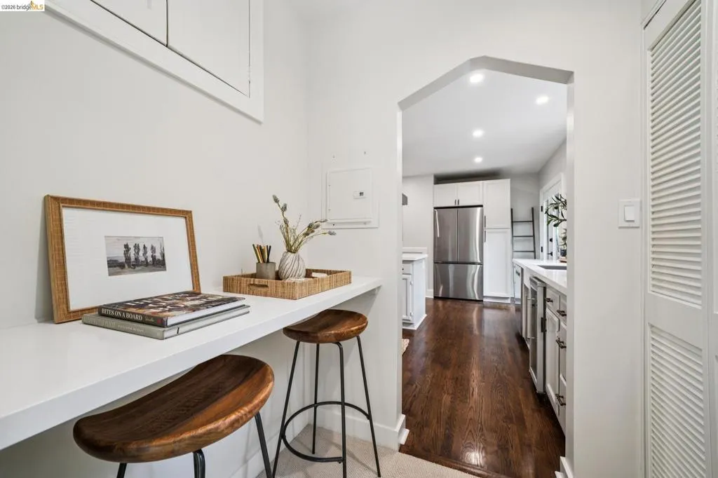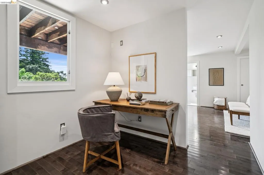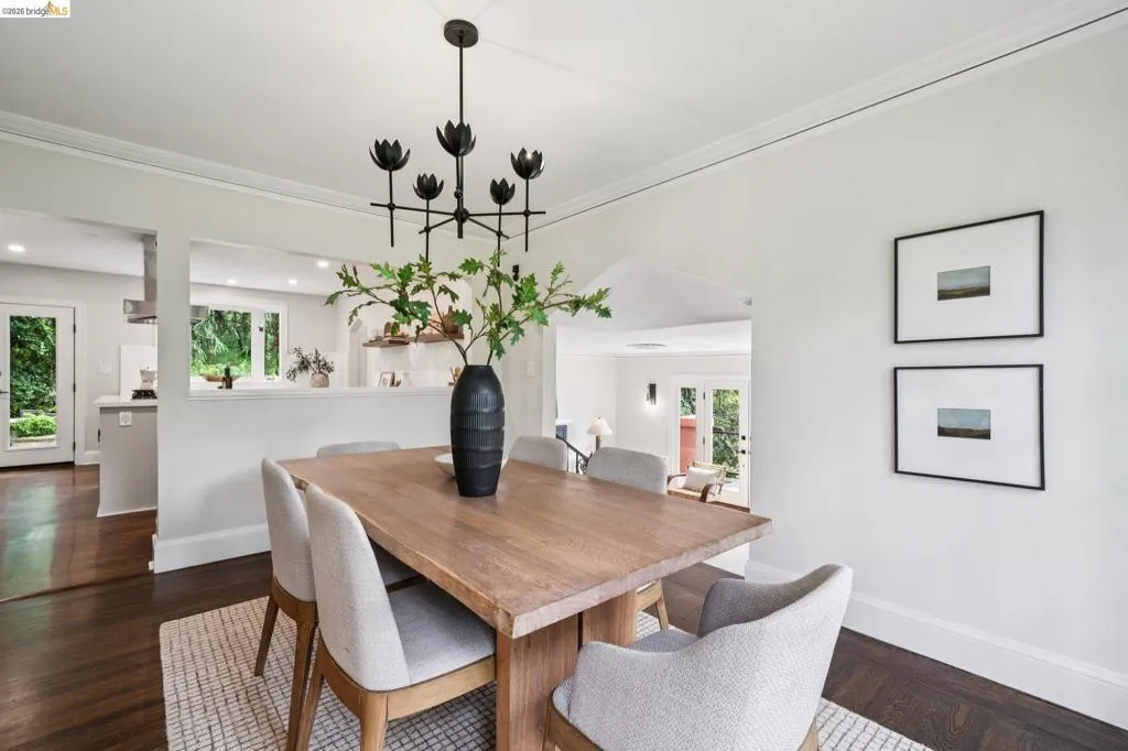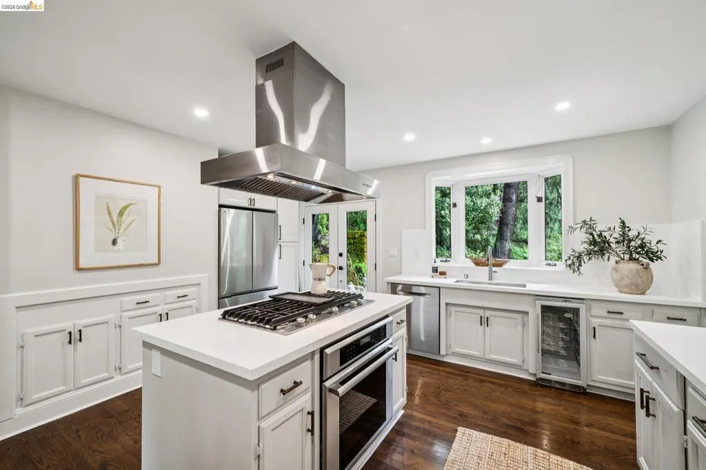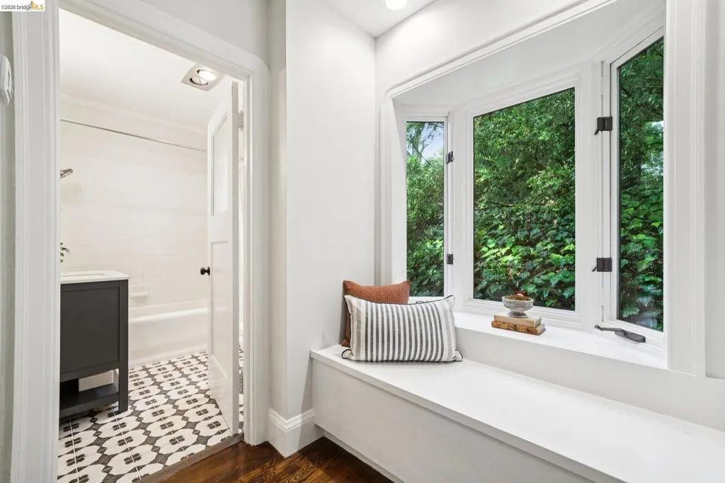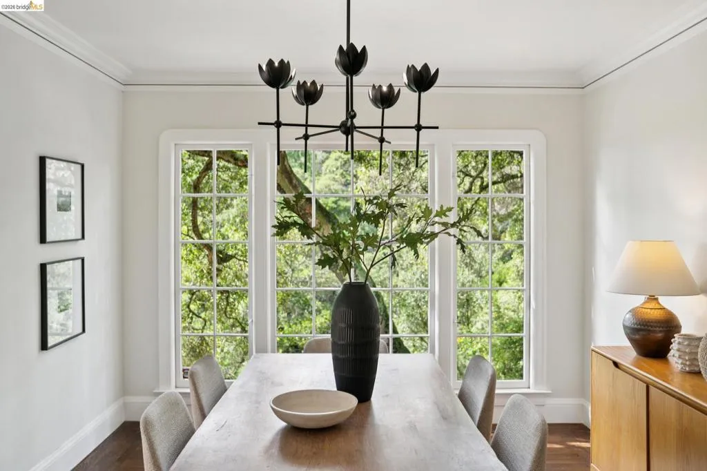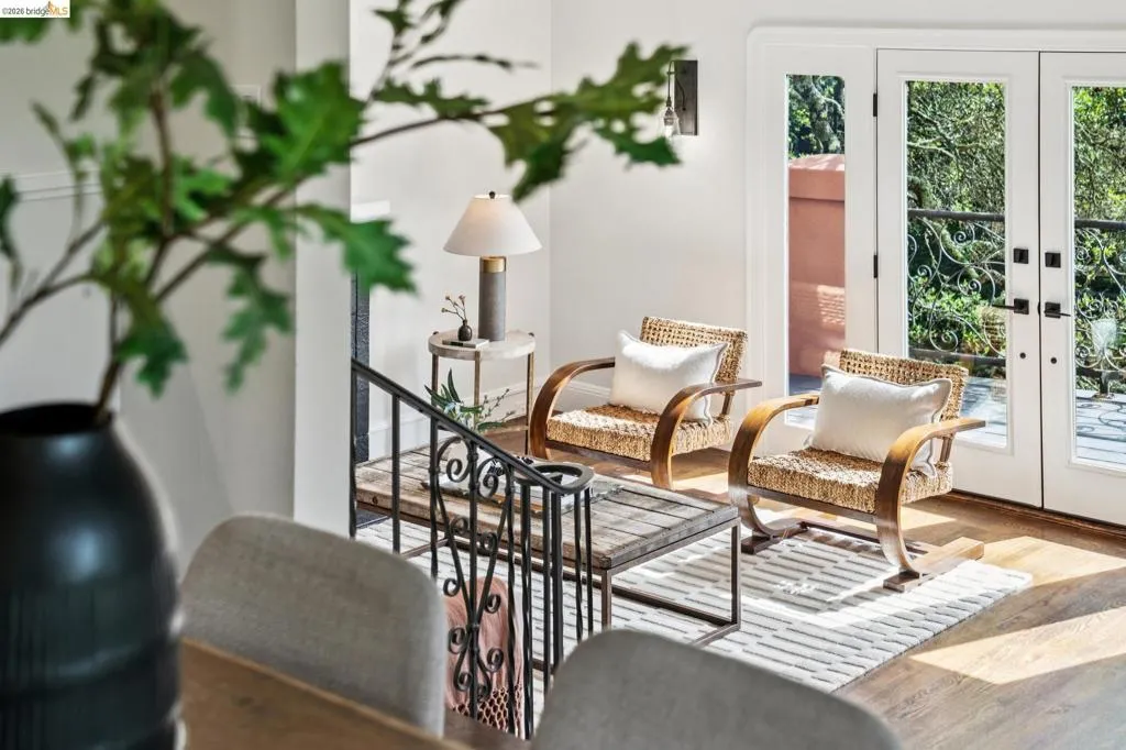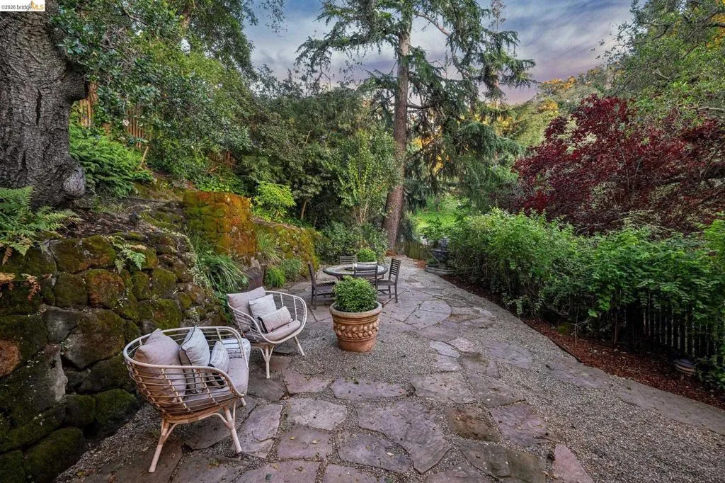 Built in 1927 and beautifully reimagined, this impressive two story Mediterranean home on the Piedmont side of Montclair offers the perfect harmony of historic charm and modern luxury. Surrounded by mature, lush landscaping and custom wrought iron railings, the residence features a desirable layout characterized by graceful arches and pristine dark hardwood floors. The sun-drenched formal living room, anchored by a beautifully detailed wood-burning fireplace, has elegant French doors to an expansive deck, offering a seamless connection to the outdoors. At the heart of the home is a chef’s kitchen featuring custom cabinetry, Quartz countertops and backsplash, and premier stainless appliances. A large bay window overlooks a tranquil, private garden sanctuary complete with a hot tub, a fountain, and a rare, original built-in stone fireplace. The thoughtful floor plan includes two light-filled bedrooms and an elegantly updated bath on the upper level. The lower-level primary suite provides exceptional flexibility with an adjoining office space, a stylish full bath, and a separate entrance. It is perfectly suited as a private retreat, home office, or in-law unit. Modern comfort meets timeless design with thoughtful upgrades throughout. Located just moments from Montclair Village, parks, tennis courts, and a charming 1930s storybook library. With easy access to San Francisco transportation, this home is a rare urban retreat where luxury and natural beauty exist in perfect harmony.