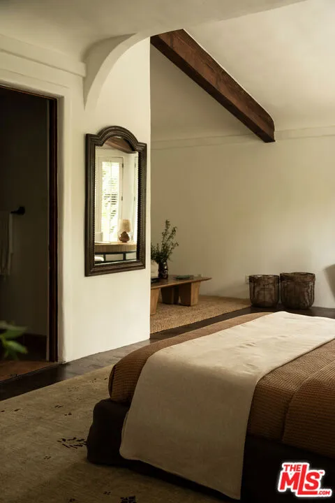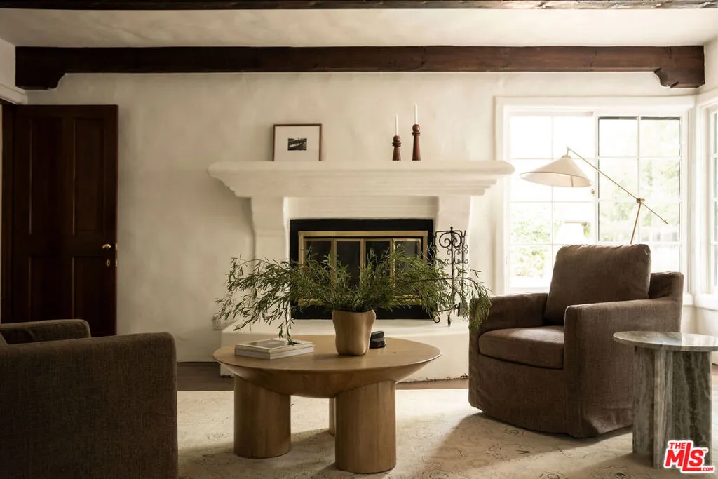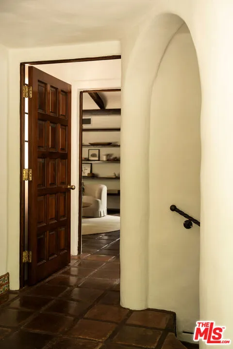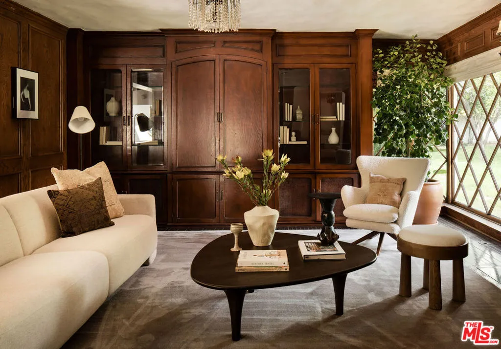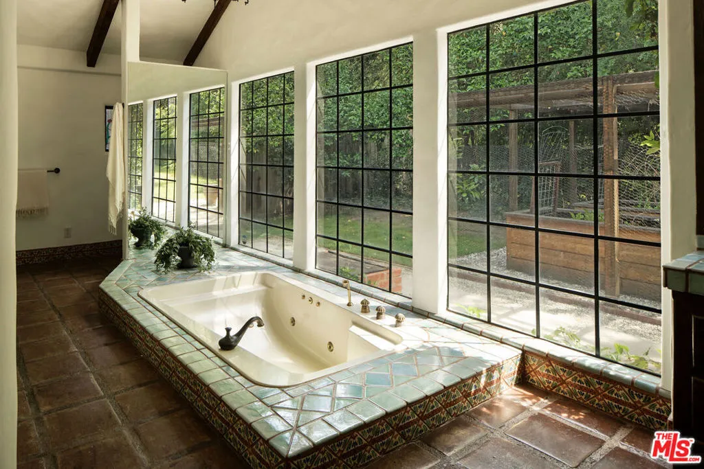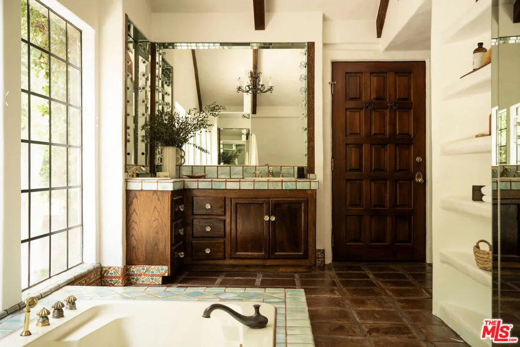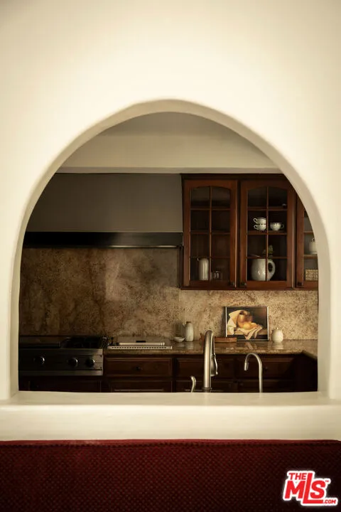 Set a mile south of Ventura Boulevard in Tarzana, Dar Hacienda is a resort-inspired, ultra-private paradise. The expansive one-story, 4 bedroom, 3.5 bathroom Spanish Hacienda-style residence blends timeless architectural character and old Hollywood glamour, all nestled back from the street behind gates on a sweeping flat lot of over 25,000 sq. ft. A double-gated circular driveway, grand front entrance portico, mature landscaping, and striking curb appeal introduce a home rich in history and design, where original craftsmanship and thoughtful upgrades come together to create a one-of-a-kind secure home and retreat. Inside, the home unfolds with warmth and intrigue, elevated by vaulted wood-beamed ceilings, skylights that bathe the interiors with natural light, and hand-lathed plaster walls that illuminate. Centered by a dramatic fireplace, the main living space flows seamlessly into a generous dining space with built-in seating under soaring ceilings, and views out to the pool and the private gardens. A charming breakfast area, framed by curved bay windows, invites morning light into a wood-paneled sitting room with original built-ins, offering a cozy, character-filled escape. Moving through French glass doors reveals a library with built-in cabinets, presented behind hand-beveled glass, that include a dedicated den/office, creating a flexible and inspiring workspace across from a reading nook in the bay window. Altogether, the space provides a singularly unique cinephile's media room. The chef's kitchen is inviting and functional, blending old-world charm with thoughtful modern upgrades. Warm wood glassed cabinetry complemented by a chef's suite of appliances, including dual ovens, a generous refrigerator, a Viking cooktop with hood, is accompanied by a rare indoor Char-Glo Thermador barbecue and grill - an entertainer's dream that adds a touch of vintage luxury and culinary versatility. A wine fridge and multiple pantry spaces, including a walk-in, provide ample storage for both everyday living and hosting. The primary suite is a retreat, complete with its own fireplace and sitting area, offering tranquil pool and garden views. The spa-like en-suite bathroom features two separate, complete sinks and mirrors, a soaking spa tub for two, and a bidet toilet. There is a hidden room that can be used as a quiet office, gym, or nursery, with secure access to the back garden. The main guest room has its own charm, with more vaulted ceilings, two closets with distinctive white oak doors, and bay-window views through Birds of Paradise out to the citrus orchard. In the north wing, two bedrooms share a beautifully preserved Old Hollywood-style bathroom with hand-painted tile, a sunken spa tub overlooking the garden, and a double-headed shower. Additional spaces include a lower-level guest room with its own garden entrance and beamed ceilings, an upper-level guest bedroom with skylights and cathedral ceilings, and a powder room. The stunning backyard is a resort-like oasis thoughtfully curated for relaxation. It features a renovated saltwater pool and spa with waterfalls that reflect the home's Hacienda style. Multiple seating areas, a custom gas fire pit, and an outdoor kitchen enhance the outdoor experience. Lush, mature landscaping surrounds the property, including towering California redwoods, fruit trees, rose gardens, and thoughtfully designed raised garden beds. Additional highlights include solar panels, dual-zone HVAC, tankless water heater, newer roof, security cameras, and two-car garage with ample parking for more cars. Located in a prime Tarzana pocket south of Ventura Blvd, just moments from top rated schools and local favorites like Sol y Luna, Blu Jam Cafe, Vino Wine & Tapas Room, and the shops and dining along Ventura, as well as nearby hiking trails, golf courses, country clubs and parks, this estate offers a rare combination of unique architectural integrity, privacy, and lifestyle.