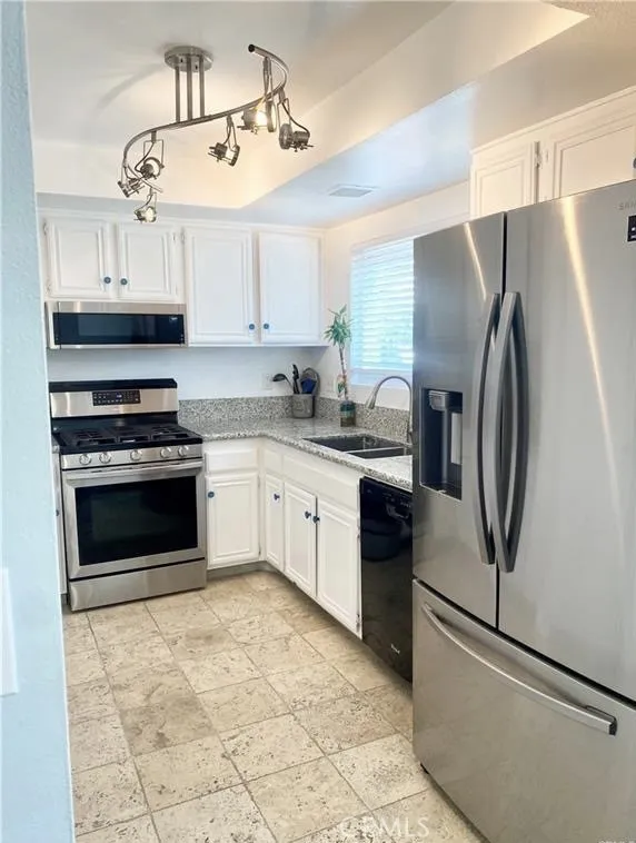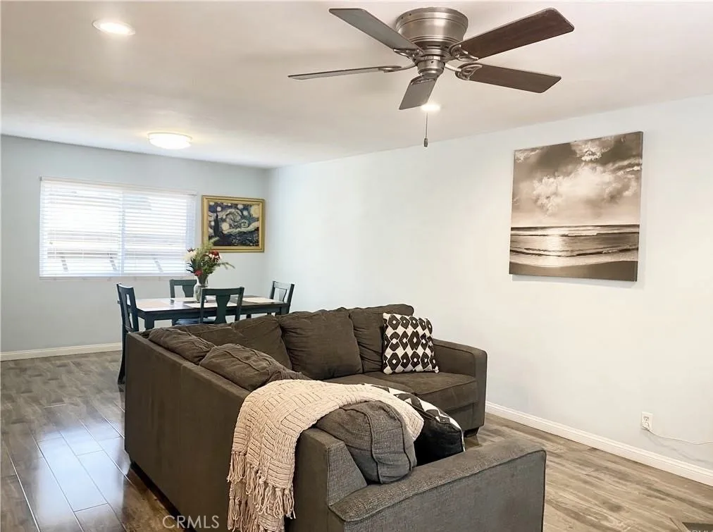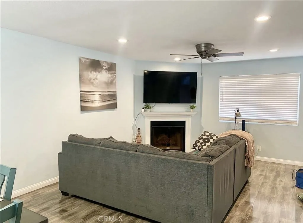 Spacious two-story townhouse featuring laminate and tile flooring throughout. The expansive living room offers a cozy, crackling gas fireplace and an inviting dining area—perfect for entertaining. The primary suite boasts an open layout with soaring vaulted ceilings that fill the space with natural light. An extra-large closet, and large bathroom with lots of counter space. The secondary bedroom includes its own private en-suite bathroom with a full bath and shower. A separate laundry room is conveniently located upstairs in the center of the hallway. This exceptional property also includes two gated, side-by-side secure parking spaces, plus three guest parking spots for added convenience.