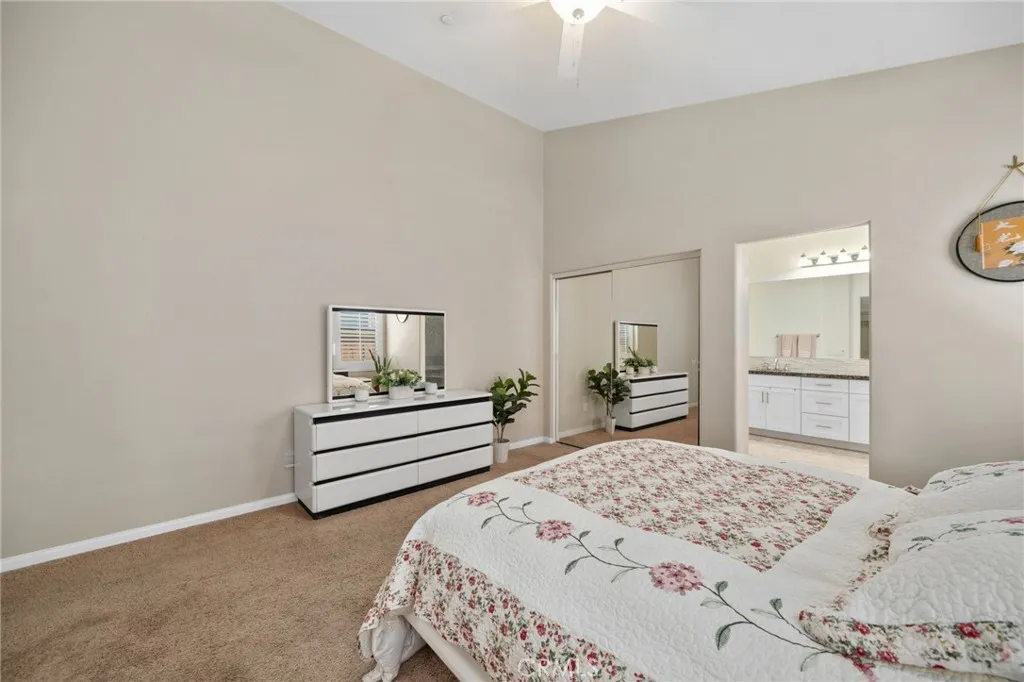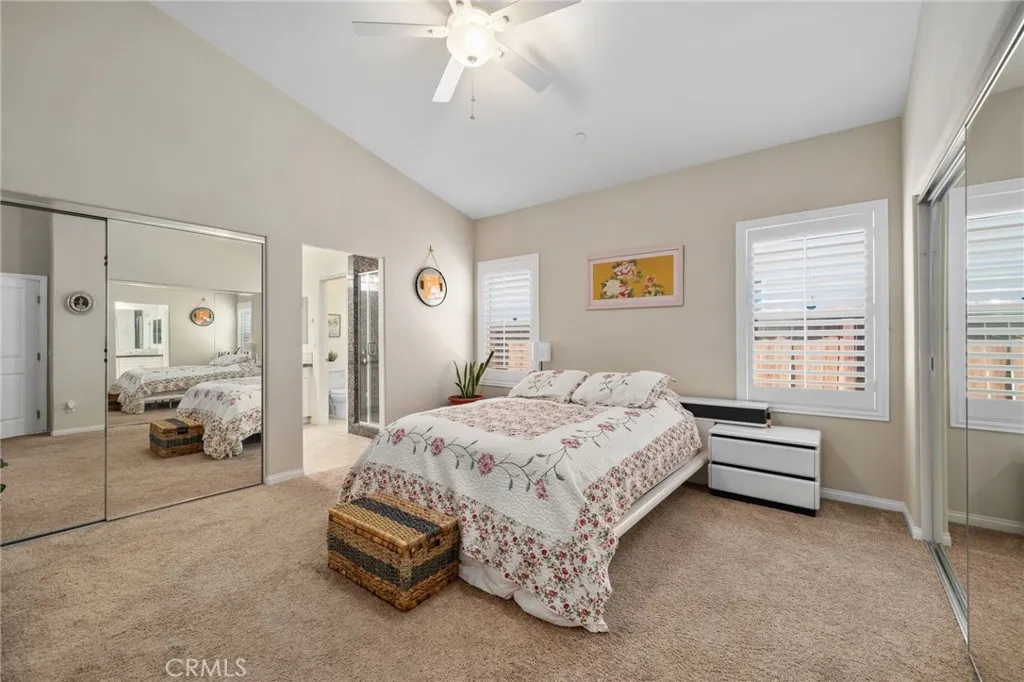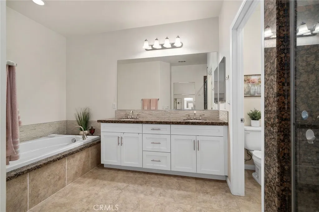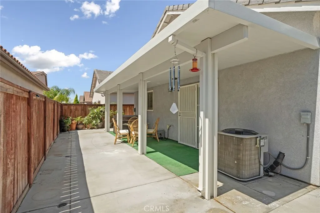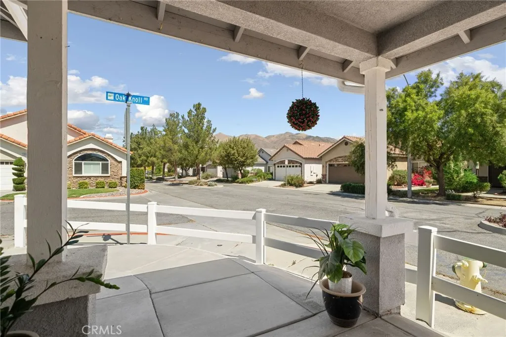Welcome to this charming corner-lot home located in a desirable gated 55+ community in San Jacinto, complete with a private clubhouse and beautifully maintained surroundings. Offering 2 bedrooms, 2 bathrooms, and a spacious 2-car garage, this home combines comfort, functionality, and low-maintenance living. The front exterior is fully concrete for easy upkeep and features a cozy covered porch and inviting double-door entry. Inside, you’ll find a convenient coat closet with double doors, leading into a bright and airy family room complete with a ceiling fan and elegant plantation shutters. Further into the home, a versatile dining area awaits—featuring a ceiling fan and a cozy fireplace—perfect for entertaining or easily used as a second living space. The spacious kitchen boasts granite countertops, a peninsula for additional seating, a full granite backsplash, and newer cabinetry, offering both style and practicality. The primary suite is generously sized and includes plantation shutters, a ceiling fan, mirrored closet doors, and dual closets. The en-suite bathroom features dual sinks with granite counters, a large soaking tub, and a separate walk-in shower. The secondary bedroom is equally inviting with plantation shutters, a ceiling fan, and mirrored closet doors. A second full bathroom and a dedicated laundry closet with built-in cabinetry add to the home’s convenience. Step outside to enjoy a private backyard with a covered patio, full concrete for easy maintenance, and a relaxing spa—perfect for unwinding or hosting guests. This well-maintained home offers the ideal blend of comfort and simplicity in a welcoming 55+ community setting.