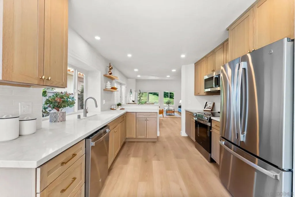Dwell West Homes presents this beautifully remodeled home which has been recently transformed to open the kitchen to the living/dining room! This improvement creates a bright, spacious layout perfect for everyday living and entertaining. Located in the highly sought-after 55+ community of Ocean Hills, no detail has been overlooked in this comprehensive renovation. The home features a full PEX repipe, a new 4-ton furnace, updated thermostat, new registers, and ductwork improvements as needed. Step inside to discover fresh interior paint, new luxury vinyl plank flooring throughout, upgraded doors and hardware, and stylish mirrored closet doors in the bedrooms. Enhanced lighting includes new fixtures, recessed can lighting, and modern ceiling fans, along with updated GFCI outlets throughout. The fully redesigned kitchen showcases white oak shaker cabinetry, quartz countertops, a designer tile backsplash, new sink and fixtures, stainless steel appliances, and a new garbage disposal—perfectly blending style and functionality. Both bathrooms have been thoughtfully upgraded. The primary suite features a white oak double vanity with quartz counters, a private water closet, upgraded fixtures, and a beautifully tiled shower. The secondary bathroom offers convenient Jack-and-Jill access, a freestanding vanity, upgraded fixtures, and a tiled tub/shower combination. This turnkey home delivers modern living in a vibrant, amenity-rich community—ready for you to move in and enjoy.