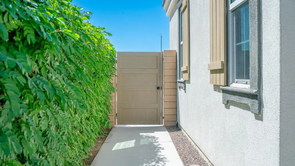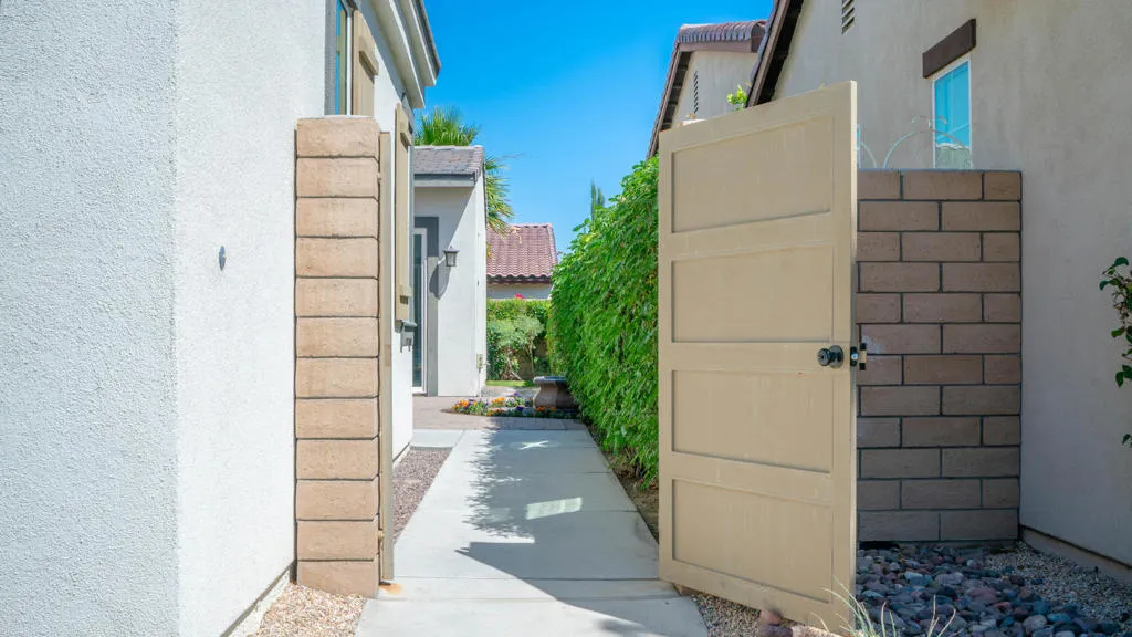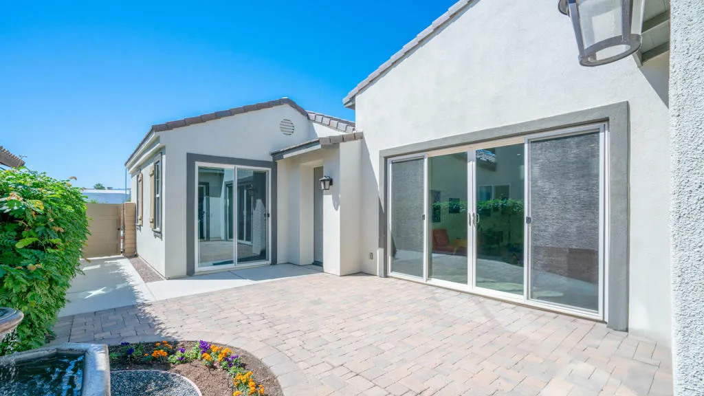 Comfortable, Low Maintenance Desert living at Domani 55+ Resort Style community. This 3 Bedrooms, 3 1/2 Bath, 2 car Garage offers a great mix of style and practicality. Imperial Irrigation District (IID) means Lower electric cost. A standout feature is the Guest bedroom with its own private entrance to the backyard giving visitors extra privacy. Home features open floor plan with vaulted ceilings and a bright, airy feel. Granite countertops in the kitchen with ample sleek cabinetry as well as a pantry. Formal dining area opens to the patio through oversized floor to ceiling sliding doors inviting seamless indoor-outdoor flow. Tile floors throughout the main living area while laminate in the bedrooms. Primary suite is spacious, with a walk in closet and well-appointed bathroom with walk in shower. Each bedroom has its own en-suite bathroom for privacy. Separate laundry room. Landscaping by Tessera creates a welcoming courtyard with pavers and tranquil fountain. Low HOA includes Resort style pool & spa, pickleball and Bocce ball courts, full gym, Conference room, clubhouse, and a gated dog park. Ideally located near shopping, dining, and entertainment. Also, within easy reach of golf courses, Tennis courts, and hiking trails, this home offers the best of desert living in one of Palm Desert's premier 55+ communities.